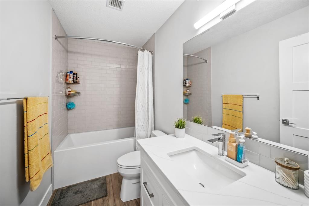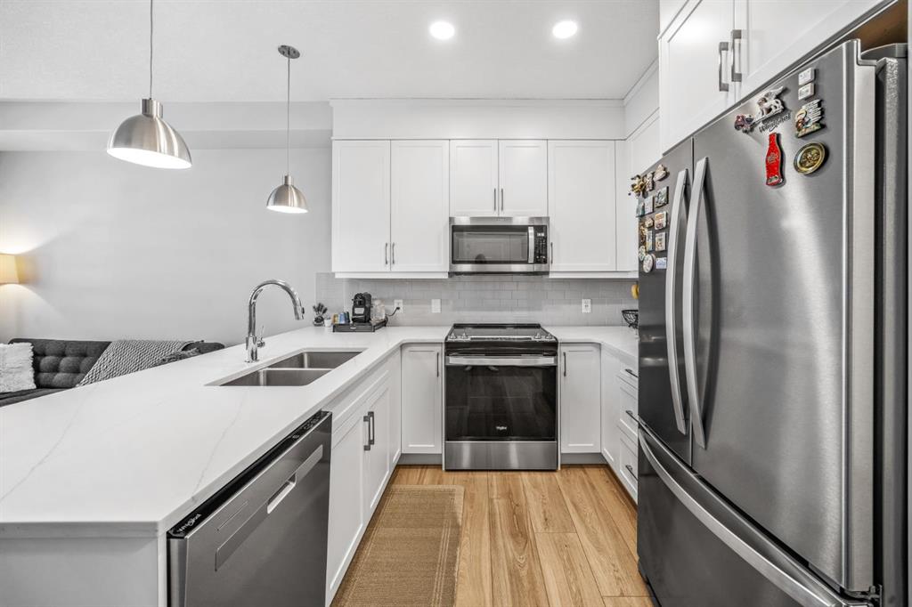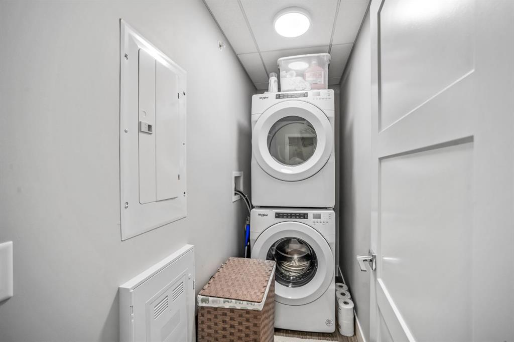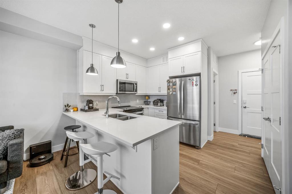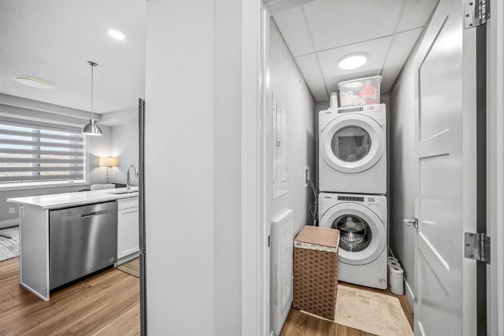 Welcome to this well maintained one bedroom plus den residence in the sought after 85th and Park building, completed in 2023 by Cove Properties. Set beside a protected ravine with walking paths bike trails, scenic pond, dog friendly, and beautiful Rocky Mountain views, this location offers a quiet setting just minutes to Aspen Landing mall, and a short drive to downtown Calgary. This efficient layout offers approximately 600 square feet with a bright open concept design. The kitchen features generous counter space, ample cabinetry, quartz countertops, and stainless steel appliances. The den works well as a home office or flex space. Additional highlights include air conditioning, a large in suite laundry/storage room, luxury vinyl plank flooring, and a spacious balcony. The unit is exceptionally quiet within the building. The titled underground parking stall includes a dedicated storage area directly in front of the stall, plus a second, larger storage locker in the storage room. The building also offers a separate bike storage room. Condo fees are a very reasonable $305 dollars per month, offering strong value for this location and building quality. A great opportunity to own in a well built development in one of Calgary’s most desirable west side communities.
