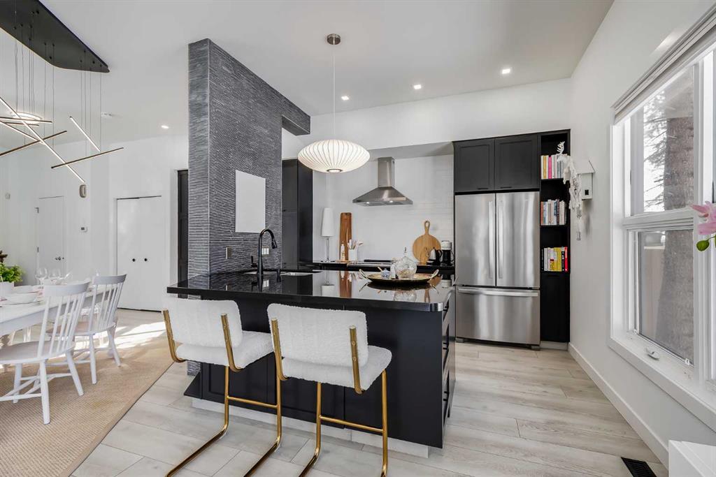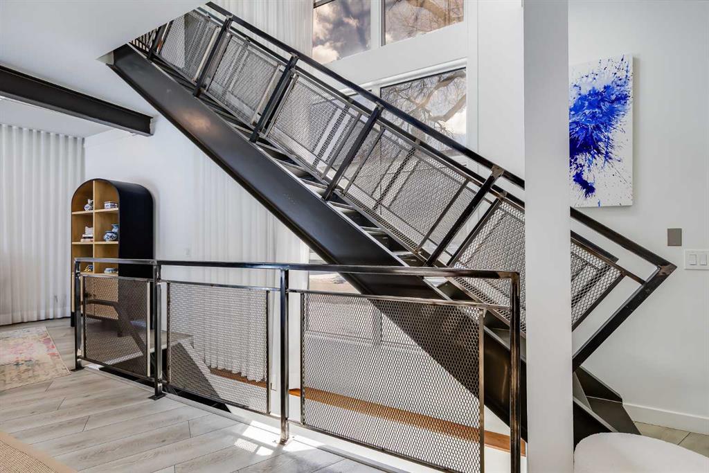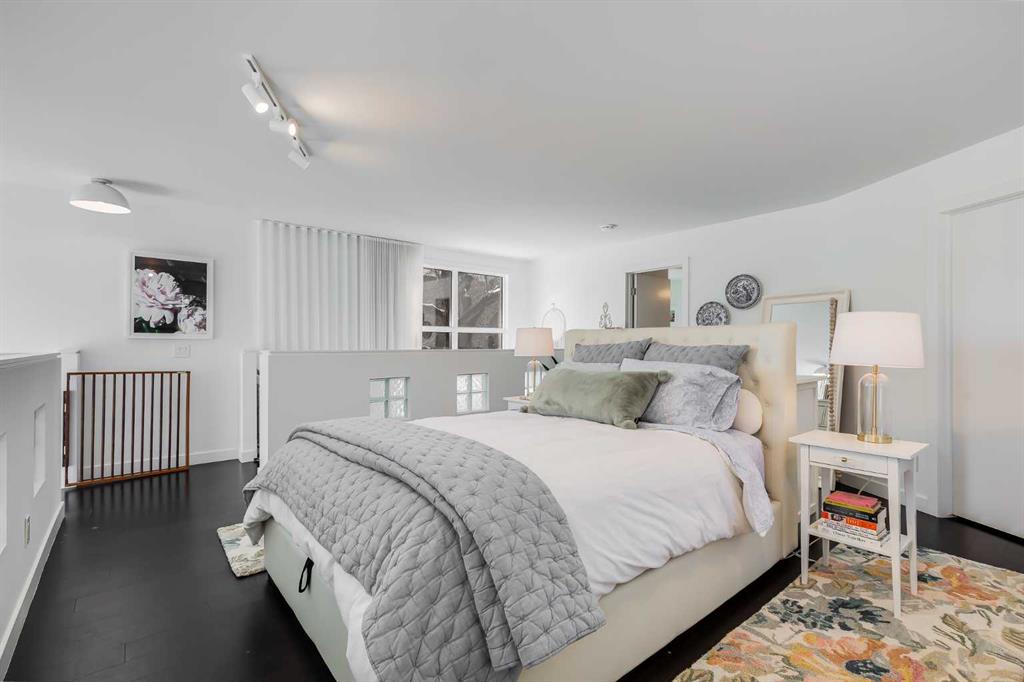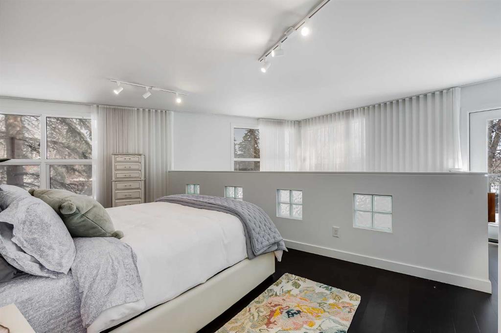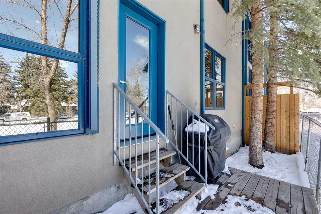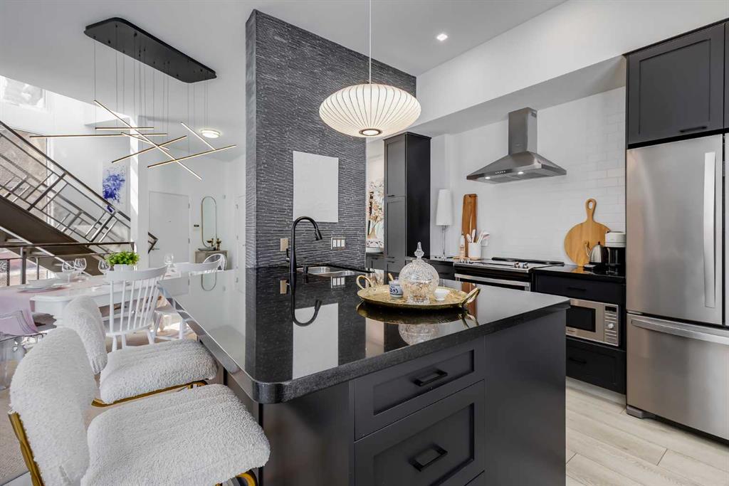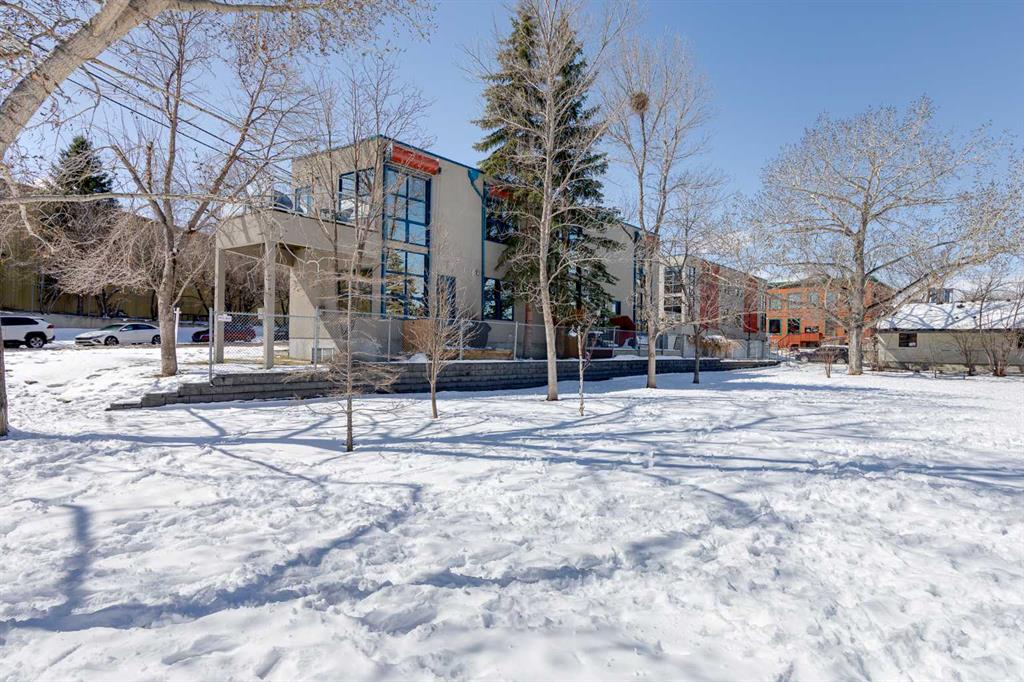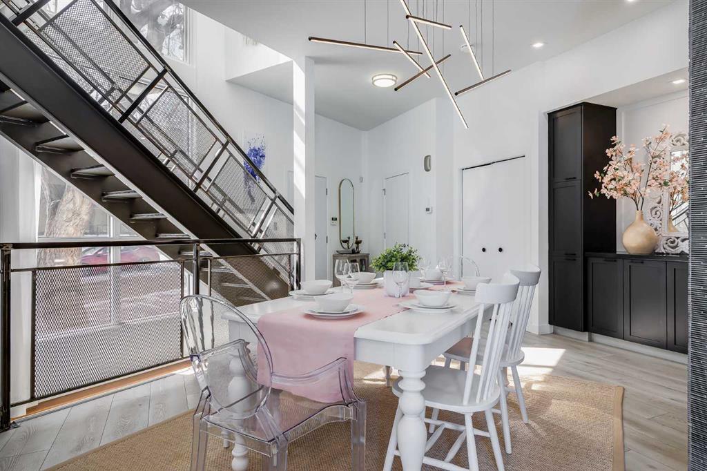 This distinctive end-unit townhouse in the sought-after community of Inglewood offers a rare opportunity for those seeking a flexible live/work environment, with the ability to operate a business subject to board approval, or simply enjoy a unique place to call home. With over 2,100 square feet of developed living space, this is the largest residence within an exclusive 12-unit complex, tucked along a quiet, tree-lined street just steps from the neighborhood’s well-known shops, restaurants, and amenities. The exterior presents a modern blend of stucco and corrugated metal siding, complemented by oversized, energy-efficient reflective windows. Inside, over $80,000 in renovations enhance both form and function. The main floor opens with a generous entryway and continues into an open-concept layout grounded by wide-plank vinyl flooring. Soaring 18-foot ceilings, expansive windows, and full-height drapery bring in natural light and add dimension, while subtle industrial elements, including exposed steel features, contribute to the home’s architectural character. The kitchen is both practical and refined, featuring black cabinetry, granite countertops, a stylish backsplash, stainless steel appliances, and a large island with seating. Adjacent dining and living areas provide a comfortable setting for everyday living or hosting, with designer lighting over the dining space and a gas fireplace anchoring the living room. Full-height windows frame views of the surrounding greenspace and park, creating a strong connection to the outdoors. A two-piece powder room completes this level. Upstairs, the entire loft is dedicated to the primary retreat, offering a private and spacious layout with cork flooring underfoot, a large walk-in closet, and a five-piece ensuite with dual sinks, a deep soaker tub, and an oversized glass-enclosed shower with bench seating. The upper balcony extends the living space outdoors, with ample room for seating and elevated views through the surrounding trees. The fully developed basement adds further flexibility with a spacious recreation area suited for a media room, office, or fitness space. A full wall of built-in shelving provides both storage and display, while additional pot lighting ensures the space is well-lit into the evening. A spacious den and a three-piece bathroom offer privacy for guests or extended use, along with additional storage. Outside, the property backs directly onto greenspace and a park, creating a natural extension of the home’s living space. A private yard offers room for a BBQ and easy access to outdoor areas. Park conveniently in any of the ample stalls at your front door or in a titled stall within the heated garage. Located in one of Calgary’s most established inner-city neighborhoods, this home is within walking distance to boutique shopping, dining, cafés, and local breweries. The Bow River pathways are just minutes away, and you’ll enjoy quick access to downtown by car or public transit. Check out the 3D Tour!