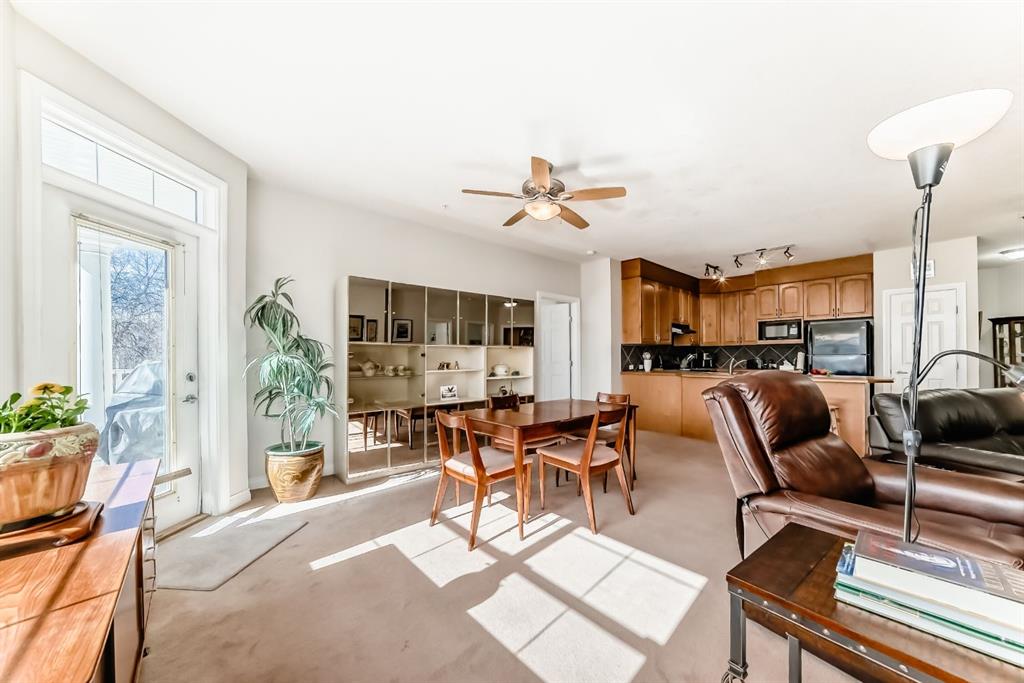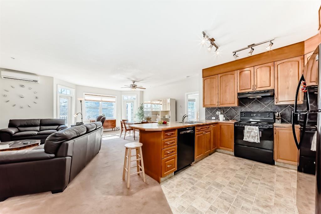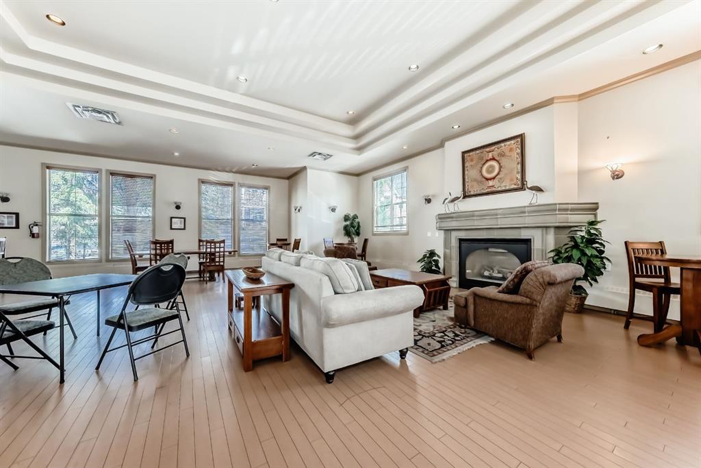 This very RARE 2 bedroom plus den 2 bath open concept condo offers 1600 sq ft of gracious living. When you enter this big sunny home with 9 ft ceilings, you will be greeted by a large kitchen with a pantry, lots of cabinet space and a long peninsula which could seat 4 or 5 guests. It opens to the spacious Living/Dining rooms which feature a two sided gas fireplace. Two doors lead to two (appox. 70 sf each) separate South facing balconies which overlook a green space. The park with a variety of mature trees makes you feel that you are in the country rather than the heart of vibrant walkable Garrisonwoods with all of its services, restaurants and shopping. Each of the 2 bedrooms has a 4 piece en-suite. Both have large linen closets, double sinks and one has a big corner soaker tub - the other a FIAT steam shower. A cozy den/office shares the fireplace. A built in office cubby is conveniently located near the front hall and a large laundry room with even more storage space and A/C completes this unit. The two side by side parking spaces are beside the elevator as is the storage room. The parkade is secure, heated and has a car wash and bike rack. You can walk to the entrance of the amazing Amenities centre through the parkade or just pop out the front door. In the Amenities centre, you will find a gym, showers, party/games room with a full kitchen and a great pool (just refurbished so will be refilled soon). Two guest suites can be rented at a reasonable price and visitor parking is out front. This is a sought after quiet complex is well run and maintained. Note: This is an adult (18+) building and is pet friendly (dog or cat max. 20 pounds with approval)