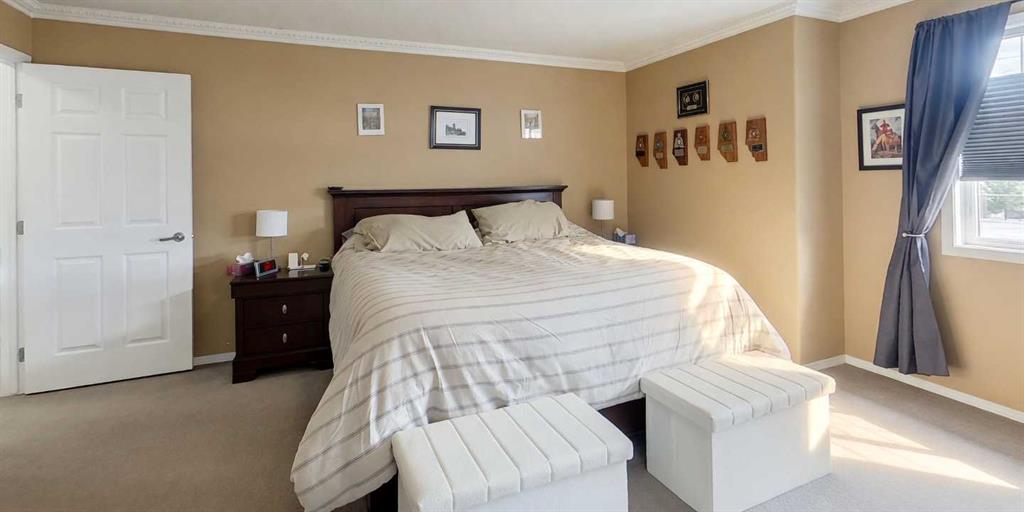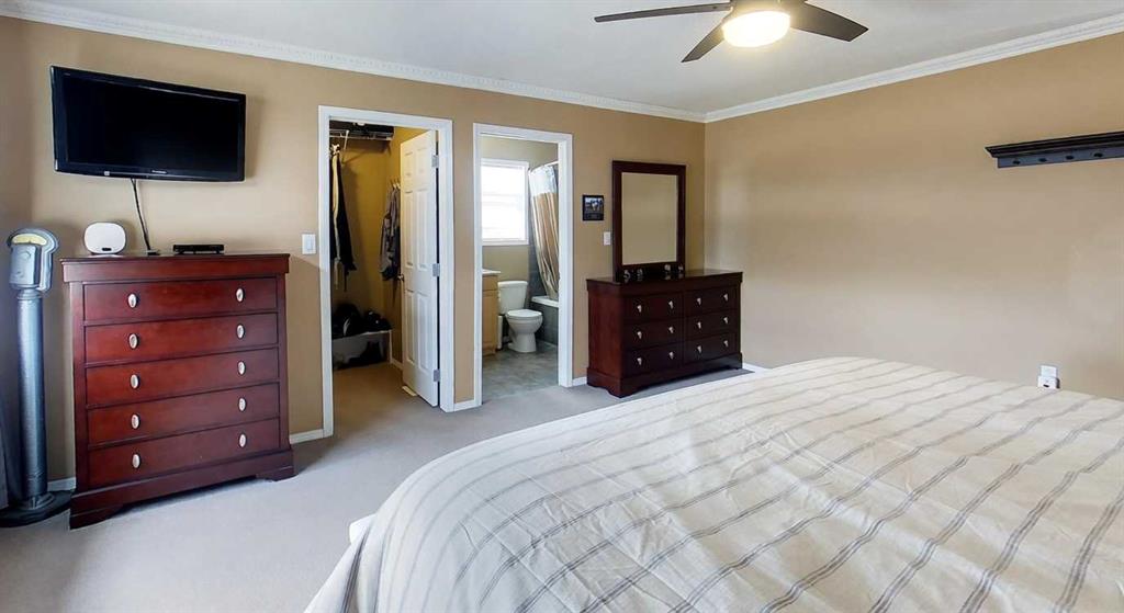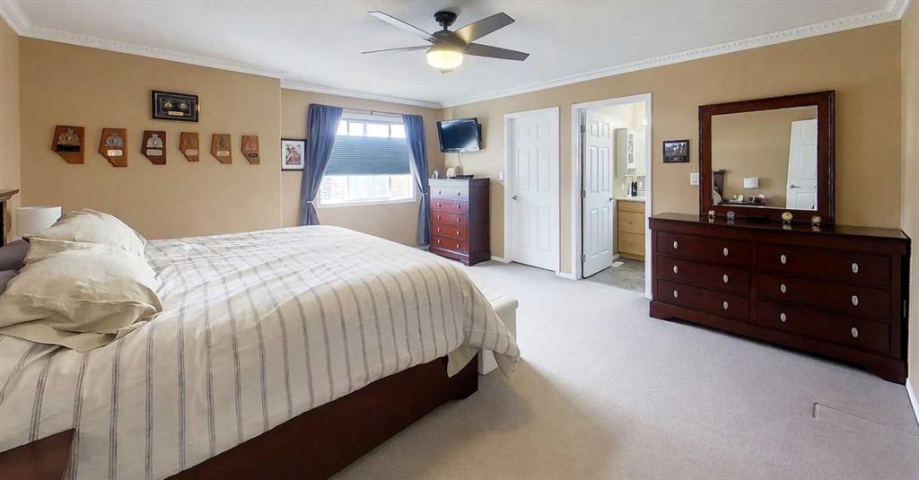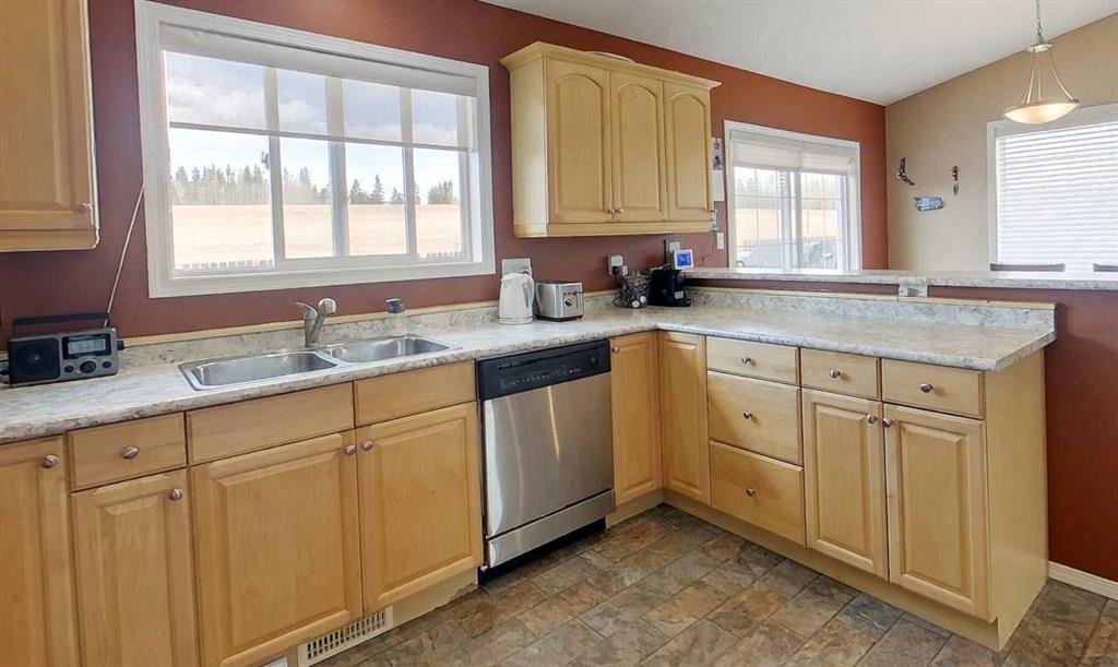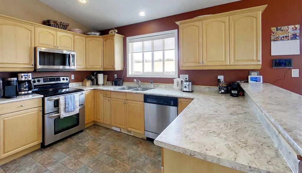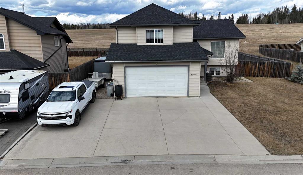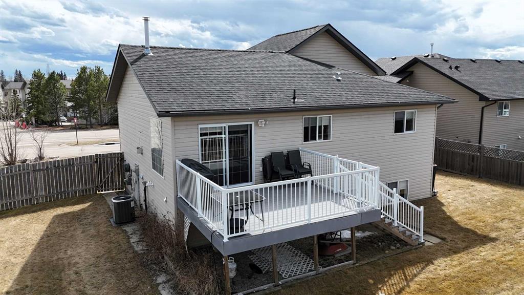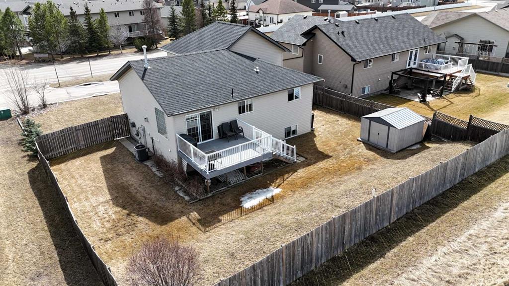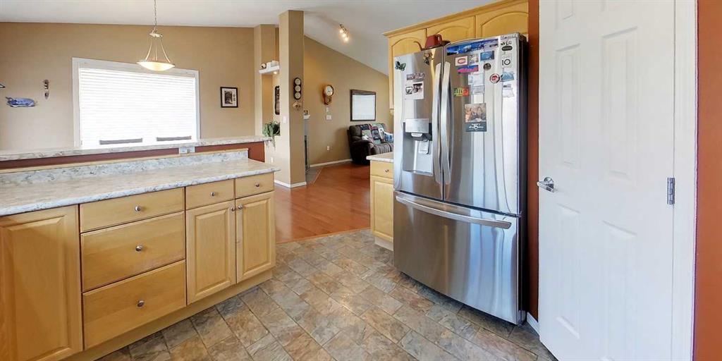Beautifully updated modified bi-level located on the north side of the family-friendly Hillendale subdivision. This spacious home offers 5 bedrooms, 3 bathrooms, and a bright, open-concept layout—perfect for growing families and entertaining. The main floor features a welcoming living room with a cozy gas fireplace, a dining area, and a well-appointed kitchen complete with a corner pantry, breakfast bar, and ample cabinetry and counter space. Two bedrooms and a 4-piece bathroom complete this level. The upper level is dedicated to the oversized primary suite, showcasing a walk-in closet and a private 4-piece ensuite. The fully developed basement adds even more living space with a large family room, two additional bedrooms, a 3-piece bathroom, plus laundry and utility areas. Step outside to enjoy the 12’ x 14’ composite deck and fully fenced yard, complete with a large storage shed. The property also offers a triple concrete driveway and convenient RV parking along the west side of the home. Recent upgrades include stainless steel appliances, custom window coverings, new kitchen countertops, a high-efficiency furnace with central air conditioning (2022), and brand new shingles (March 2026). Ideally located within walking distance to schools, the hospital, and the town’s trail system, with quick access to all amenities.