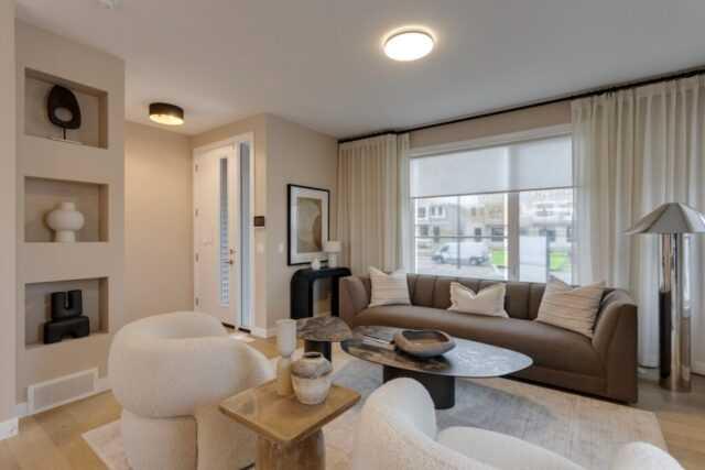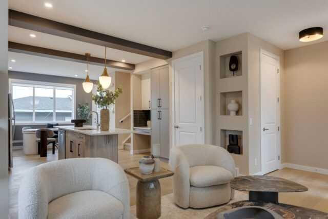 Discover the St. Andrews, expertly crafted by Douglas Homes. This 1294sqft. end-unit, fee simple townhouse delivers a turnkey lifestyle with a convenient side entrance and no condo fees. Located in the sought-after community of AmbleRidge, one of Calgary’s newest neighborhoods, this home stands out with quality upgrades already included. Enjoy 9-foot knockdown ceilings, luxury vinyl plank flooring, quartz countertops, and 42-inch upper cabinets. The bright, open-concept main floor showcases a spacious great room with oversized windows and an optional fireplace. The impressive 9-foot kitchen island comfortably seats 6–8, making it ideal for entertaining, while the adjoining dining area overlooks the sunny west backyard. Upstairs, the primary suite features a walk-in closet and a stylish 3-piece ensuite with quartz counters and a vanity with drawers. Two additional generously sized bedrooms provide plenty of space for family, guests, or a home office. A well-appointed 4-piece main bath includes quartz surfaces, a generous vanity, and a deep soaker tub. You’ll also appreciate the convenience of an upper-floor laundry room The basement is thoughtfully designed and ready for future development. Outside, the home is fully landscaped and includes a rear deck, fenced yard, and double garage. Don’t miss your chance—schedule your viewing today. Photos shown are from a previously built home and are intended to illustrate style and finishes; actual layouts and features may vary. First-Time Home Buyers’ GST Rebate: Eligible buyers may receive up to $50,000 on a new home purchase. Applicants must be 18 or older, a Canadian citizen or permanent resident, and not have owned or lived in a home owned by themselves or their spouse/common-law partner in the past four years. All terms and conditions are subject to Government of Canada/CRA guidelines.