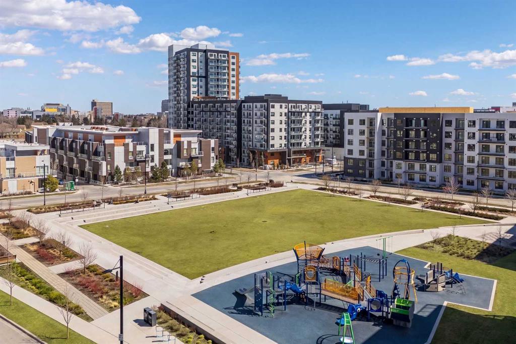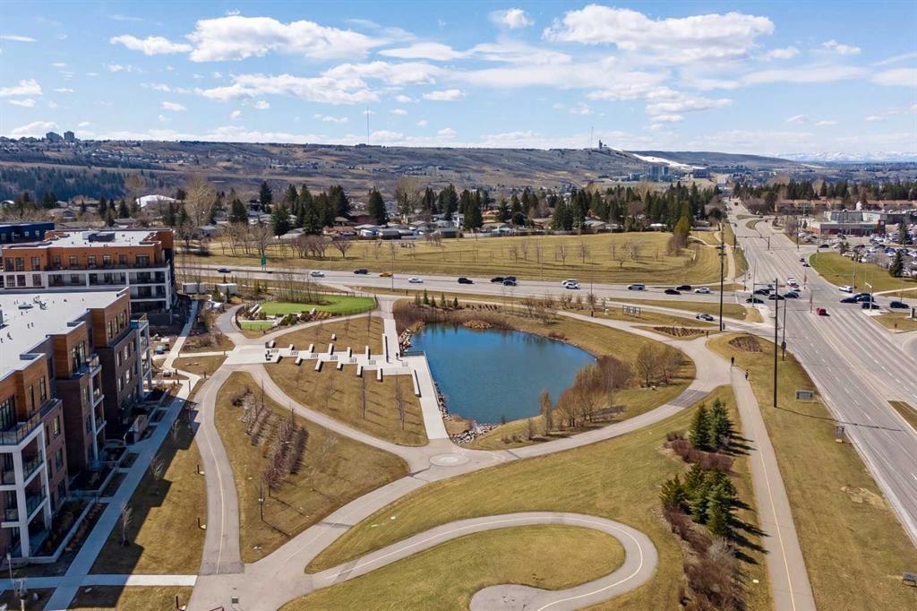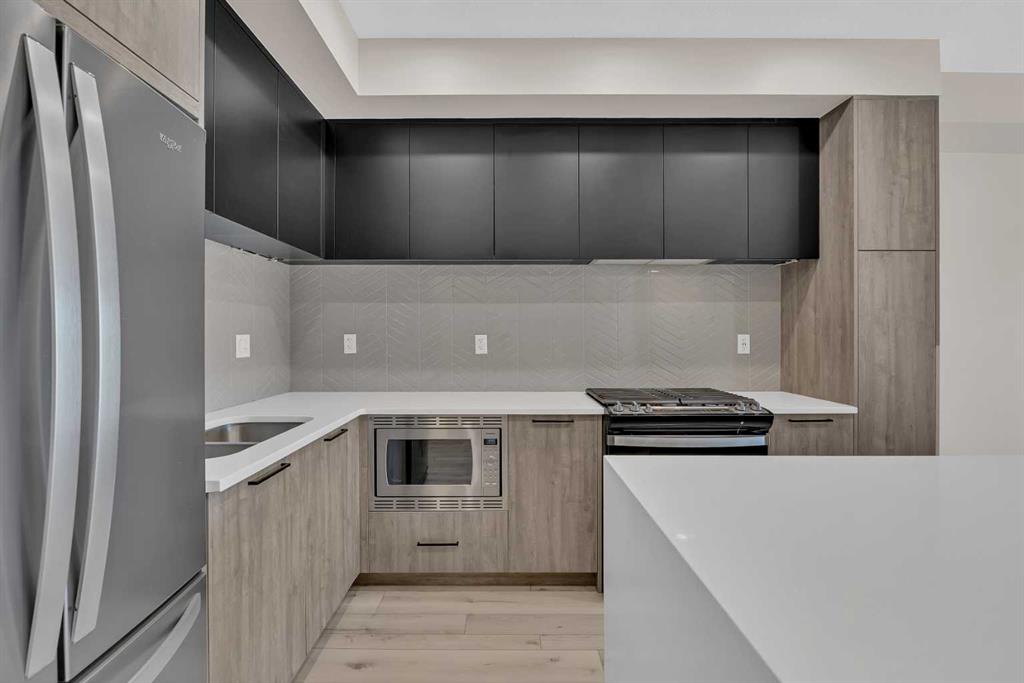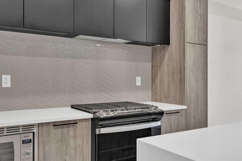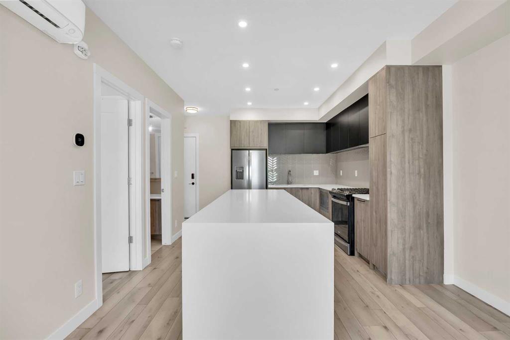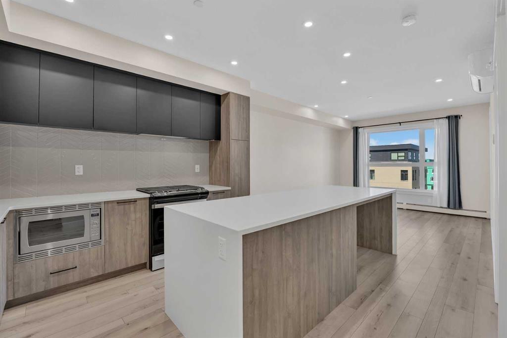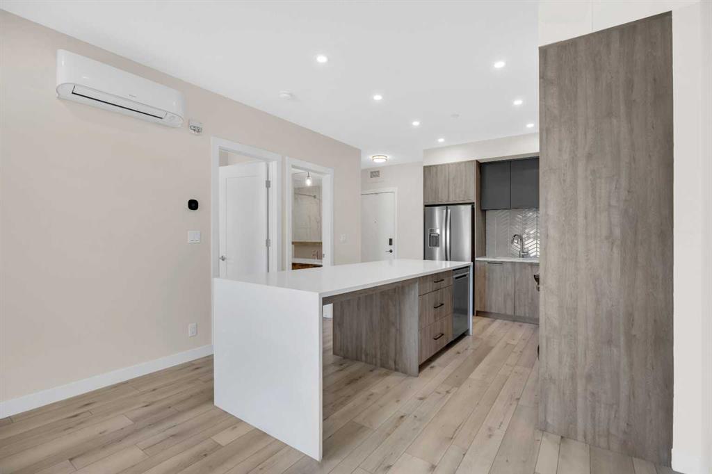 Welcome to Capella in University District — a contemporary, well-built condo nestled in one of Calgary's most sought-after and walkable NW communities. This immaculate one-bedroom, one-bathroom home is move-in ready and offers the perfect lock-and-leave lifestyle without compromise. Inside, the OPEN-CONCEPT layout is bright and airy, carried throughout by WIDE-PLANK VINYL FLOORING and recessed LED pot lighting. The kitchen is a standout, featuring warm wood-tone cabinetry paired with sleek dark upper cabinets, a QUARTZ WATERFALL ISLAND, chevron tile backsplash, and a stainless steel appliance package including a BUILT-IN microwave and gas range — stylish and functional in equal measure. The living and dining areas flow seamlessly from the kitchen, with a LARGE WINDOW flooding the space with natural light and views of the surrounding community. The bedroom offers a comfortable private retreat with easy access to the four-piece bathroom, while IN-SUITE LAUNDRY keeps daily convenience close at hand. AIR CONDITIONING ensures year-round comfort. Step outside and University District delivers — parks, playgrounds, scenic pathways, Save-On-Foods, top cafés, restaurants, and daily essentials all within walking distance. The University of Calgary, Alberta Children's Hospital, Foothills Medical Centre, Market Mall, and Brentwood C-Train Station are all just minutes away. Capella's landscaped courtyard and on-site fitness centre complete the lifestyle package, along with an underground parking stall and assigned storage locker. An exceptional opportunity for professionals, downsizers, or investors in the heart of University District.