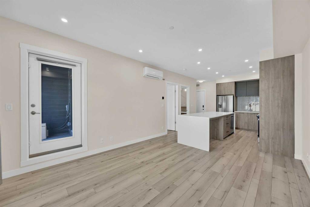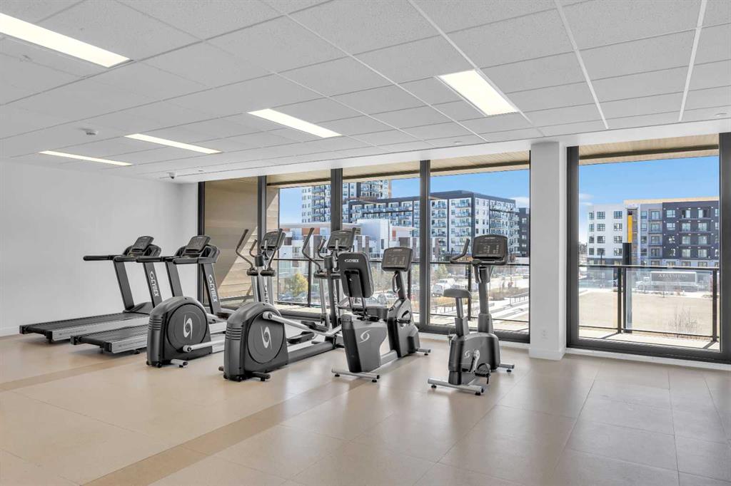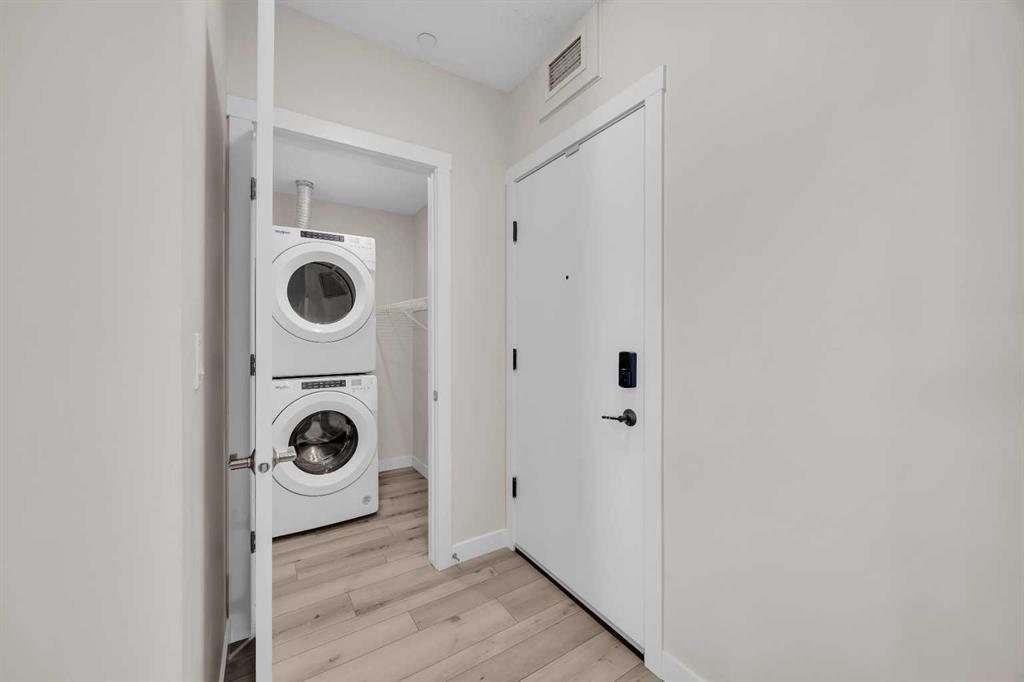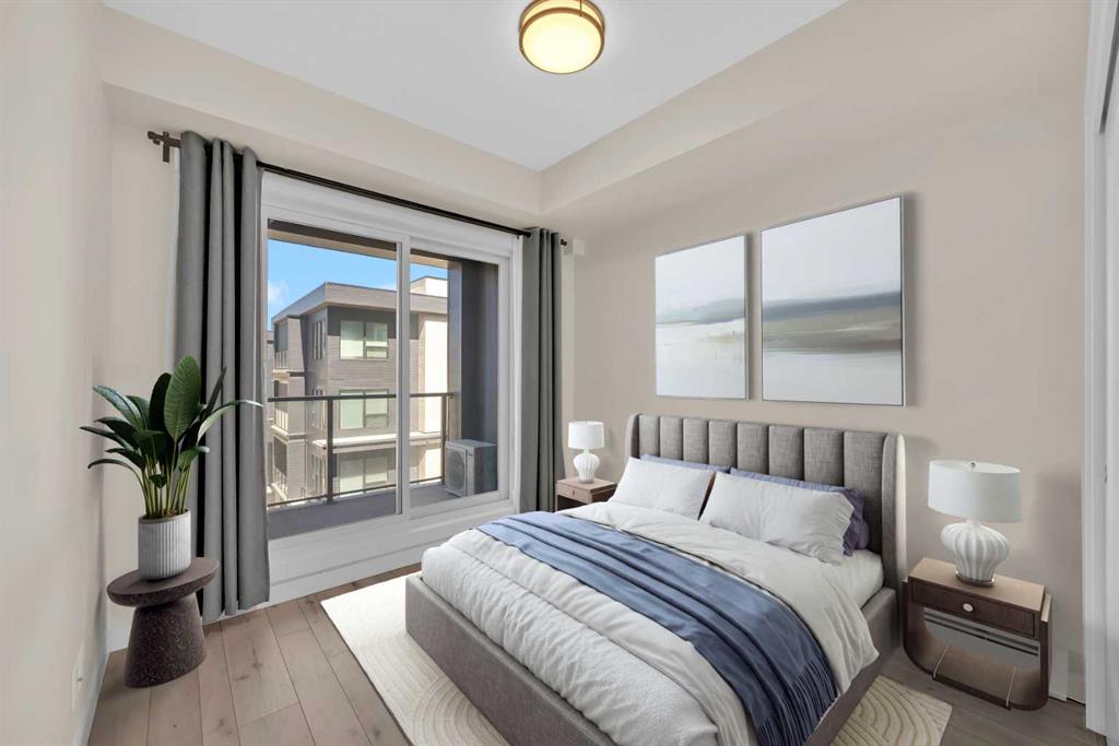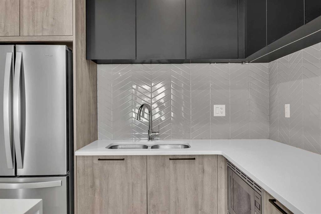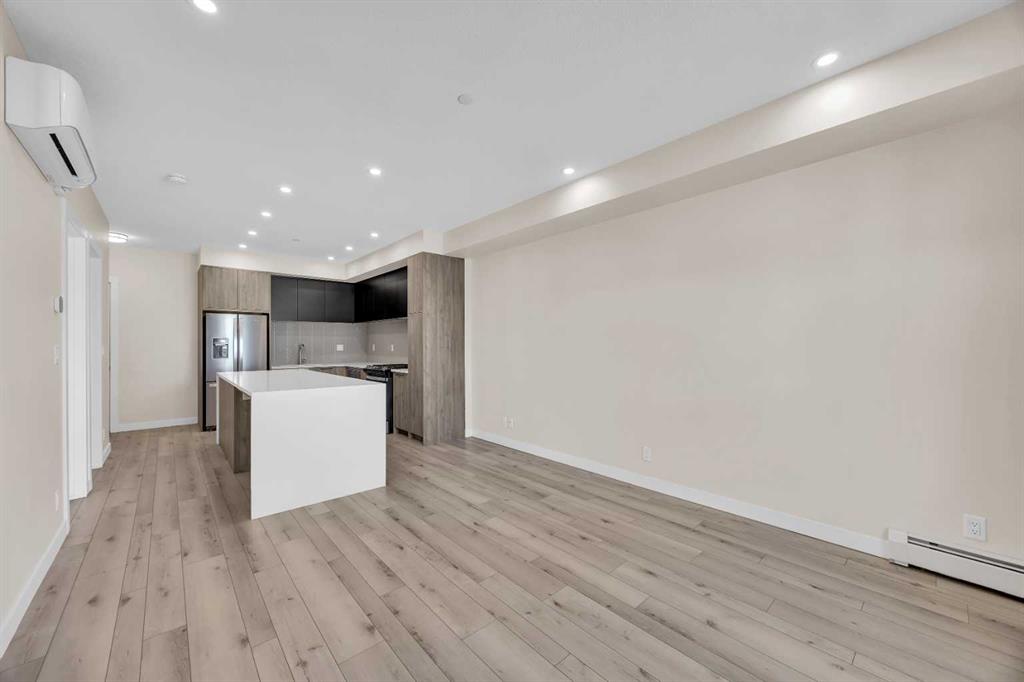 Welcome to Capella in University District — a contemporary, well-built condo nestled in one of Calgary's most sought-after and walkable NW communities. This immaculate one-bedroom, one-bathroom home is move-in ready and offers the perfect lock-and-leave lifestyle without compromise. Inside, the OPEN-CONCEPT layout is bright and airy, carried throughout by WIDE-PLANK VINYL FLOORING and recessed LED pot lighting. The kitchen is a standout, featuring warm wood-tone cabinetry paired with sleek dark upper cabinets, a QUARTZ WATERFALL ISLAND, chevron tile backsplash, and a stainless steel appliance package including a BUILT-IN microwave and gas range — stylish and functional in equal measure. The living and dining areas flow seamlessly from the kitchen, with a LARGE WINDOW flooding the space with natural light and views of the surrounding community. The bedroom offers a comfortable private retreat with easy access to the four-piece bathroom, while IN-SUITE LAUNDRY keeps daily convenience close at hand. AIR CONDITIONING ensures year-round comfort. Step outside and University District delivers — parks, playgrounds, scenic pathways, Save-On-Foods, top cafés, restaurants, and daily essentials all within walking distance. The University of Calgary, Alberta Children's Hospital, Foothills Medical Centre, Market Mall, and Brentwood C-Train Station are all just minutes away. Capella's landscaped courtyard and on-site fitness centre complete the lifestyle package, along with an underground parking stall and assigned storage locker. An exceptional opportunity for professionals, downsizers, or investors in the heart of University District.