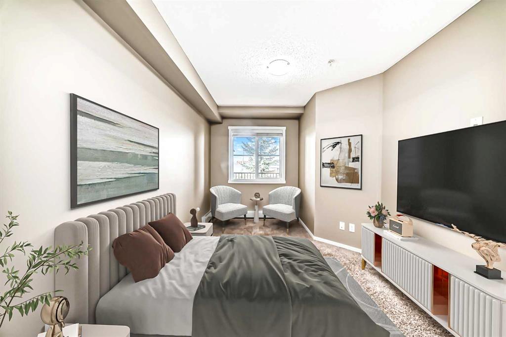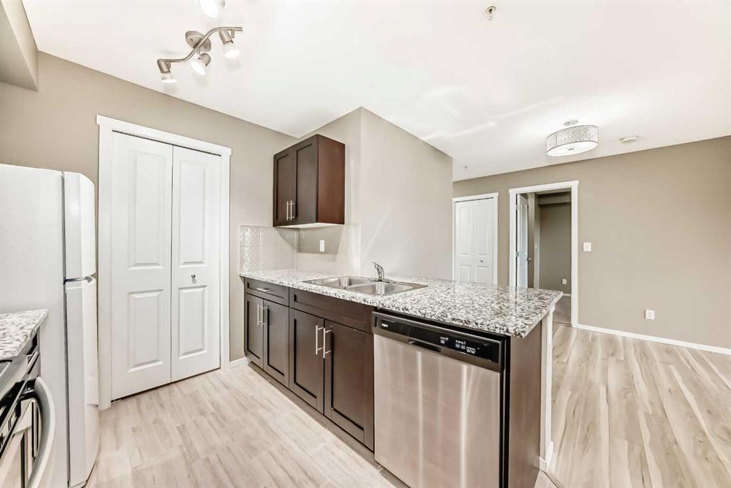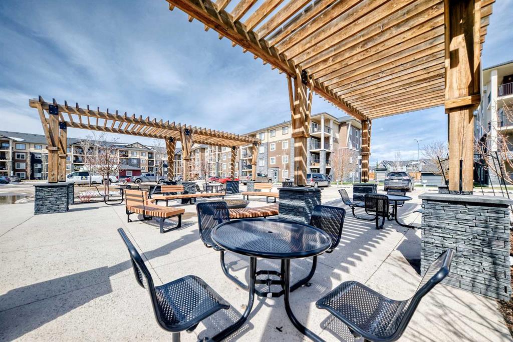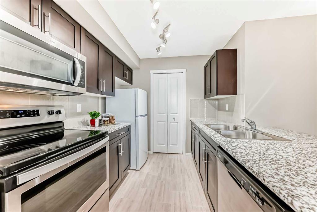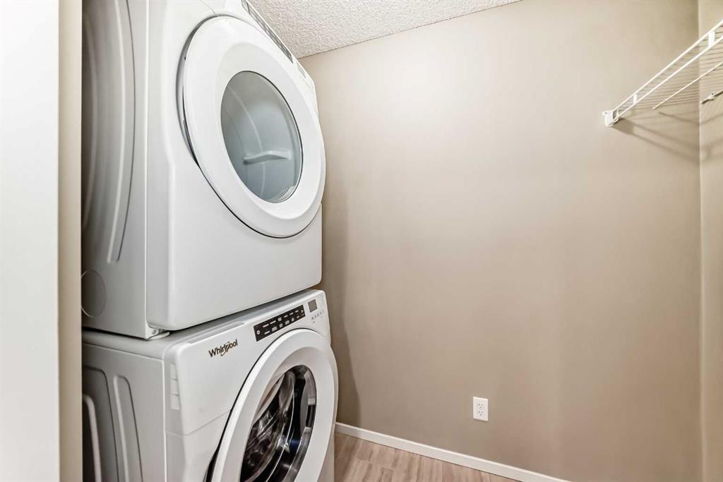 Here’s a smart start, a 2 bedroom, 2 bathroom condo in Legacy with low condo fees that include everything except Electricity. Immaculate inside with new Vinyl plank flooring, fresh paint in soft neutral tones and facing West to enjoy the views. Thoughtful set up for sharing with bedrooms on opposite sides of the unit separated by a spacious living and dining room. Step out onto your covered balcony with west views (over the graveyard, so peaceful, quiet and well kept) a great place to enjoy a sunny afternoon. Efficient kitchen design with plenty of cabinets, quartz counters & pantry. Off the back of the kitchen is the Laundry room with a full size, stacked washer & dryer, additional shelving & storage space. Additional bonuses include titled, heated underground parking, secure underground bike storage & pets allowed with board approval (max 15kg). Common area has a lovely seating area with fire pit and even a designated spot for pet relief. Enjoy walking & cycling on the plentiful pathways and around the ponds that are scattered throughout the neighbourhood. Legacy borders a 300 acre protected environmental reserve with 15 km of pathways to enjoy. There is even a community garden so you can try your hand at growing some of your own veggies. Major Shopping, restaurants and services are within walking distance at Township Shopping Centre and you’re just a quick 5 minute drive out to Stoney Trail or McLeod Trail to get downtown or out of town! Transit offers 1 quick commuter bus to the Shawnessy C-Train station for your convenience as well. You’re going to love living here! Note some photos have been virtually staged.