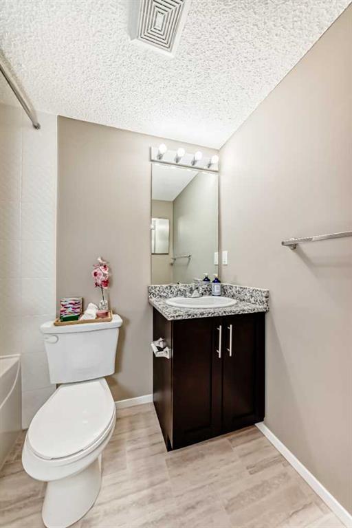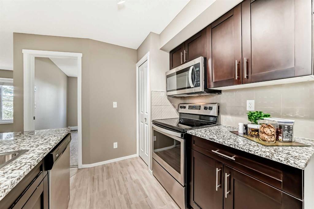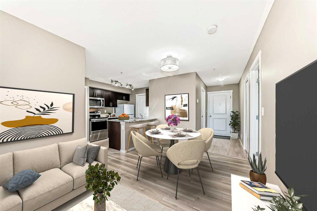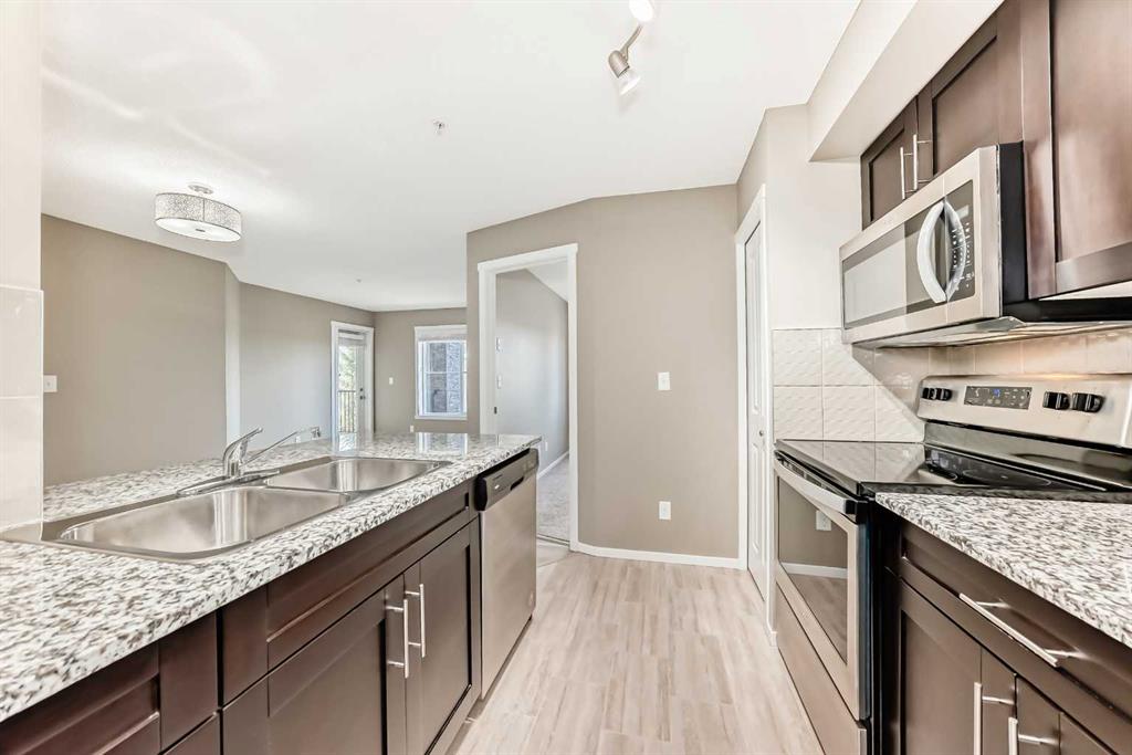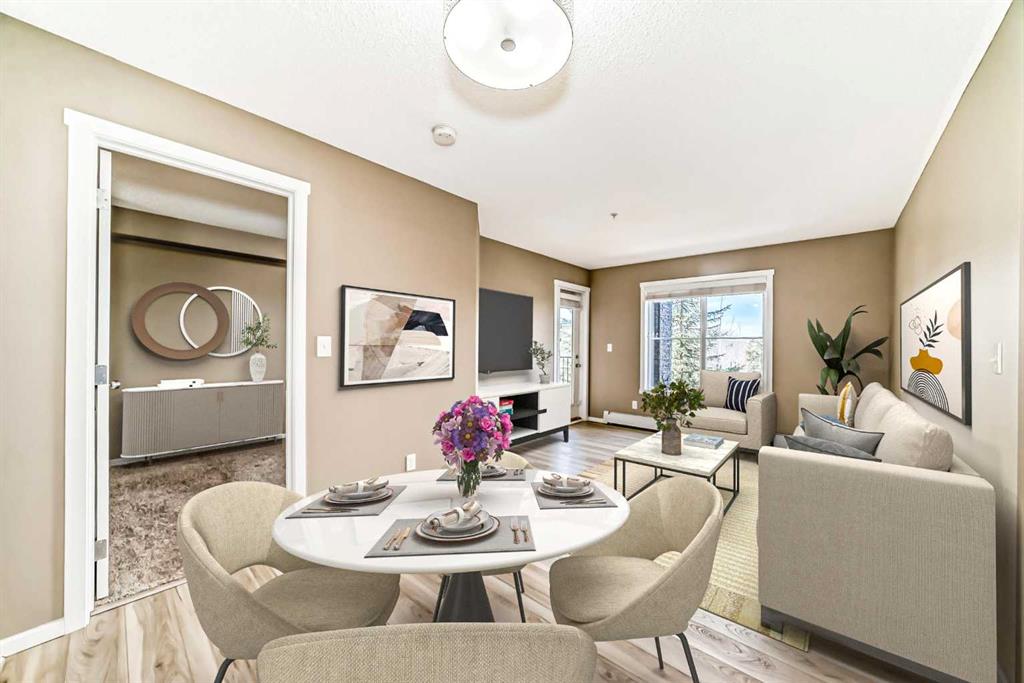 Here’s a smart start, a 2 bedroom, 2 bathroom condo in Legacy with low condo fees that include everything except Electricity. Immaculate inside with new Vinyl plank flooring, fresh paint in soft neutral tones and facing West to enjoy the views. Thoughtful set up for sharing with bedrooms on opposite sides of the unit separated by a spacious living and dining room. Step out onto your covered balcony with west views (over the graveyard, so peaceful, quiet and well kept) a great place to enjoy a sunny afternoon. Efficient kitchen design with plenty of cabinets, quartz counters & pantry. Off the back of the kitchen is the Laundry room with a full size, stacked washer & dryer, additional shelving & storage space. Additional bonuses include titled, heated underground parking, secure underground bike storage & pets allowed with board approval (max 15kg). Common area has a lovely seating area with fire pit and even a designated spot for pet relief. Enjoy walking & cycling on the plentiful pathways and around the ponds that are scattered throughout the neighbourhood. Legacy borders a 300 acre protected environmental reserve with 15 km of pathways to enjoy. There is even a community garden so you can try your hand at growing some of your own veggies. Major Shopping, restaurants and services are within walking distance at Township Shopping Centre and you’re just a quick 5 minute drive out to Stoney Trail or McLeod Trail to get downtown or out of town! Transit offers 1 quick commuter bus to the Shawnessy C-Train station for your convenience as well. You’re going to love living here! Note some photos have been virtually staged.