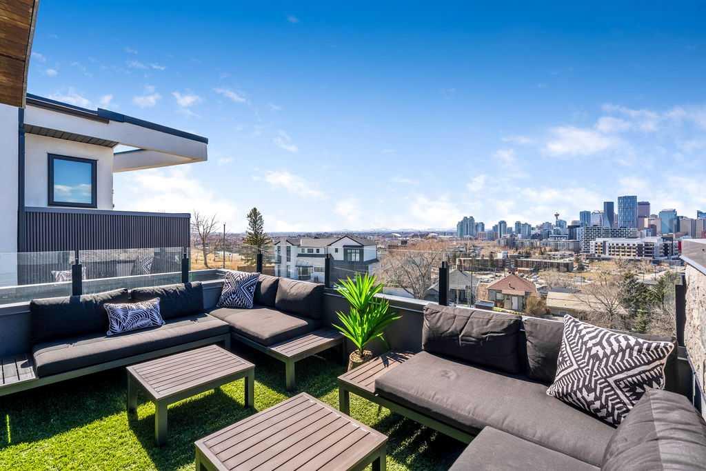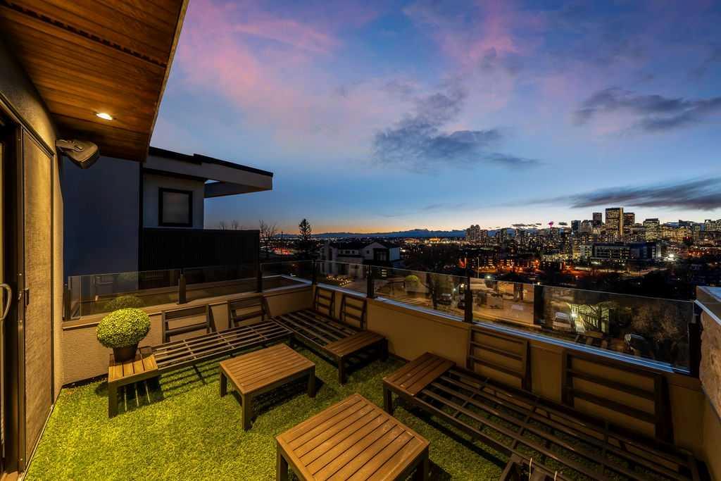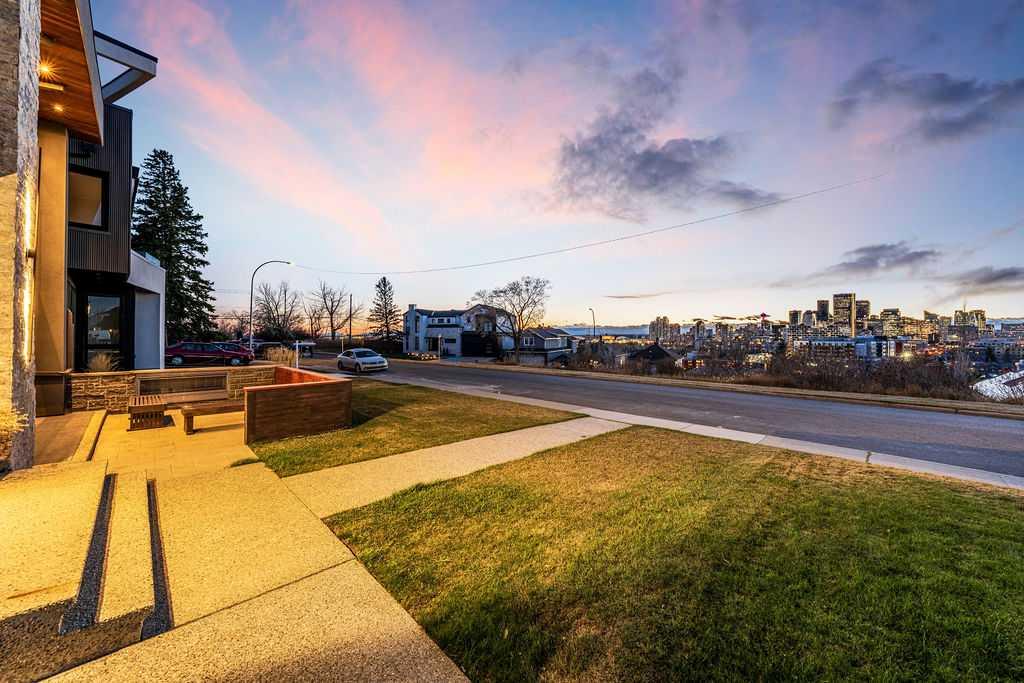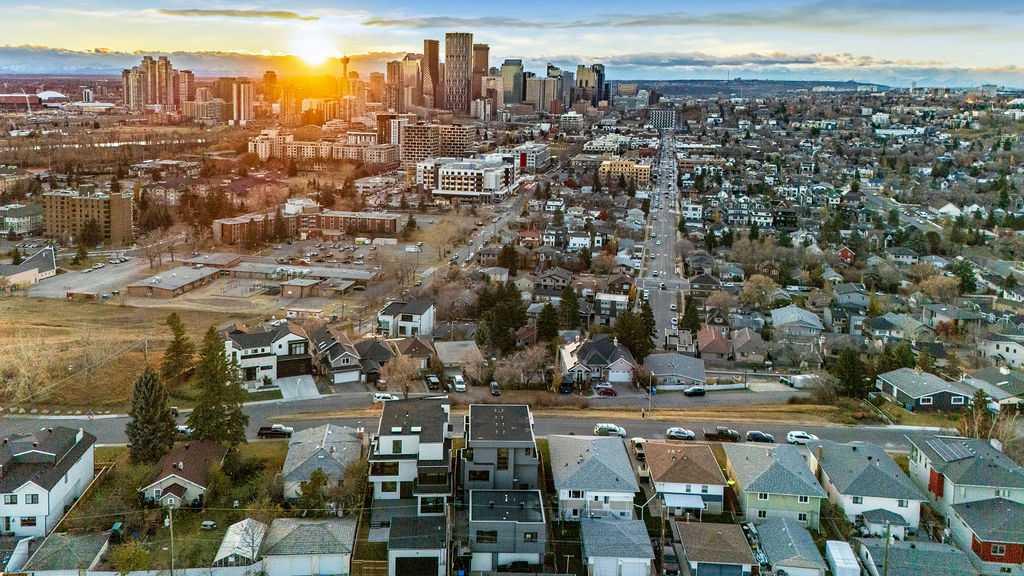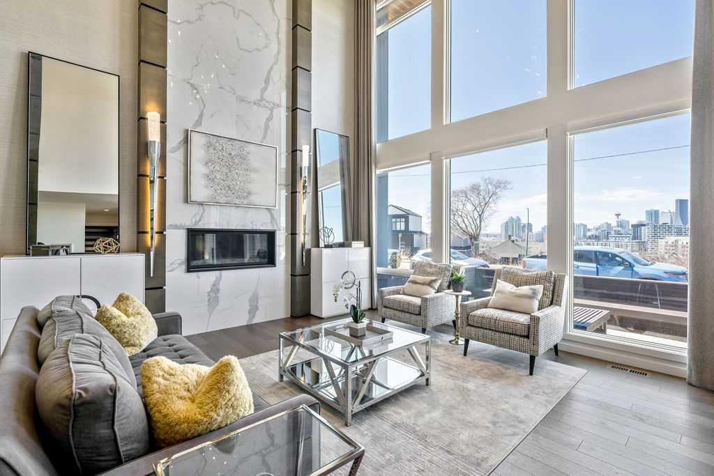 Perched on a spectacular ridge in one of Calgary’s most coveted inner-city enclaves, this exceptional residence captures truly unobstructed city skyline and Rocky Mountain views from every level. A masterful collaboration between Paul Lavoie Interior Design and Panache Homes, this architectural showpiece offers over 4,400 square feet of refined living, where scale, light, and craftsmanship converge. Defined by dramatic two-storey floor-to-ceiling windows, the home is flooded with natural light, creating a seamless connection between interior living and the ever-changing cityscape beyond. Expansive principal rooms set the stage for both grand entertaining and intimate everyday living, including a stunning formal living room with soaring ceilings and a sophisticated dining space overlooking the landscaped grounds. At the heart of the home, a bespoke European-inspired kitchen is appointed with only the finest appliances, including Sub-Zero and DCS, and is complemented by a fully equipped spice kitchen—designed to elevate culinary experiences for the most discerning chef. A striking glass-ceiling wine cellar serves as both a functional feature and a true design focal point. The upper levels offer a private retreat, highlighted by a luxurious primary suite and an additional lounge space framed by breathtaking two-storey windows and panoramic city views. Two generously sized bedrooms, each with its own ensuite and outdoor patio, complete the top floor, with flexibility for custom configuration. Designed for both relaxation and recreation, the lower level features a media and games room, an elegant wet bar with a large island, a dedicated fitness studio, and a guest bedroom with a full bath and steam shower—creating the ultimate in-home retreat. Outdoors, the expansive yard offers endless possibilities, from a custom BBQ patio to a private hot tub oasis, all set against a stunning natural backdrop. Completing the property is a triple garage with a fully legal two-bedroom suite above—ideal for guests, an office, extended family, or additional income. A rare offering defined by its irreplaceable views, architectural presence, and uncompromising design—this is a one-of-a-kind opportunity in a truly premier location.