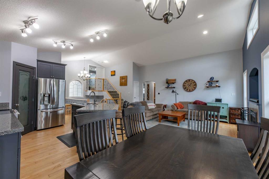 Spacious Family Home on a Stunning ¼ Acre Lot Welcome to 165 Muldoon Crescent, ideally located in one of Hinton’s most sought-after neighbourhoods and set on a beautifully landscaped, park-like lot. Built in 2010, this impressive home offers 5 bedrooms and 3 full bathrooms, combining space, comfort, and thoughtful design. A large tiled entryway leads into the open-concept main floor, highlighted by vaulted ceilings, rich hardwood flooring, and a cozy gas fireplace. The kitchen is both stylish and functional, featuring granite countertops, stainless steel appliances, a corner pantry, and a large island with eating bar—perfect for entertaining and everyday living. At the front of the home, a bright and versatile room with a large window offers flexibility as a formal dining space, playroom, or additional living area. Step outside from the dining area onto the brand-new composite deck that spans the entire length of the home, complete with a natural gas hookup for your BBQ. Stairs lead down to the expansive yard, offering plenty of space to relax, entertain, and enjoy the outdoors. Two bedrooms and a full bathroom complete the main level. Upstairs, the private primary suite provides a peaceful retreat with vaulted ceilings, a walk-in closet, and a well-appointed ensuite featuring a soaker tub and separate walk-in shower. The fully developed walkout basement expands your living space with 9-foot ceilings, in-floor heating throughout, a spacious family room, two additional bedrooms, a full bathroom, and a laundry room with sink and ample storage. The triple attached garage (30’ x 26’) also features in-floor heat, and a large concrete driveway and storage shed complete this exceptional property. New overhead garage doors installed (2025) & new washer & dryer (2026) 200 AMP Service.