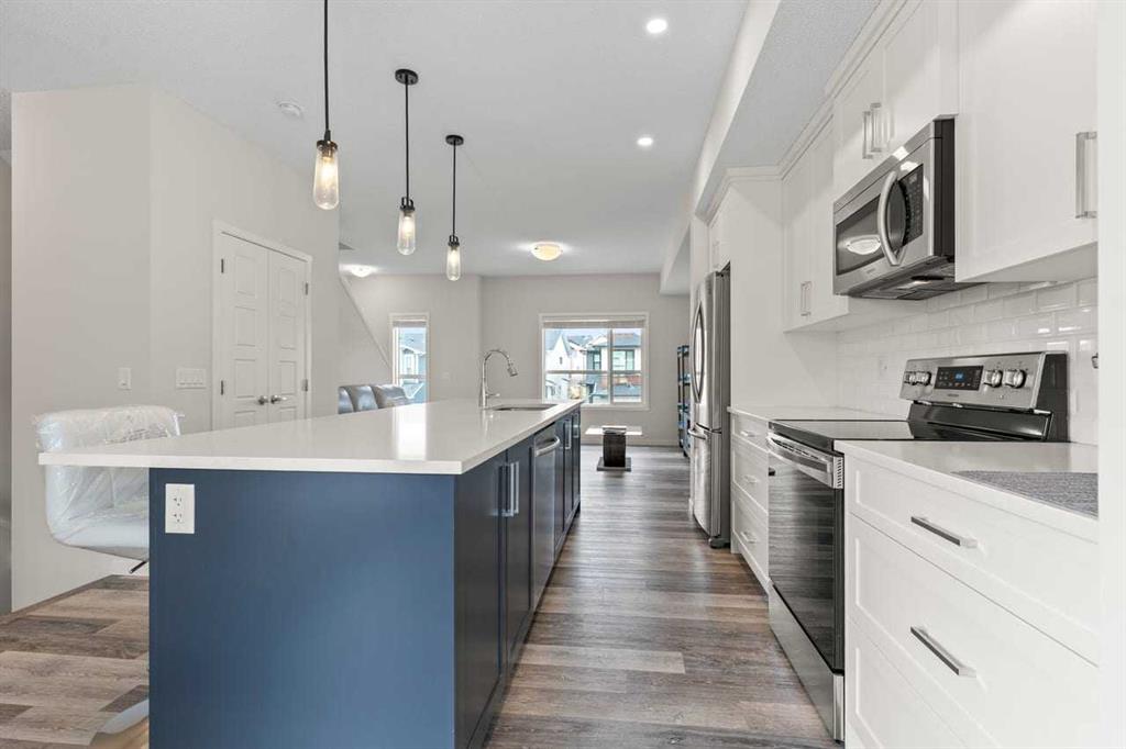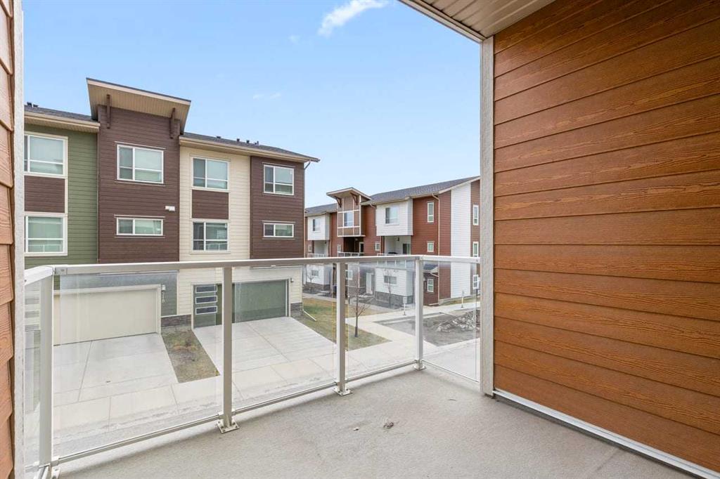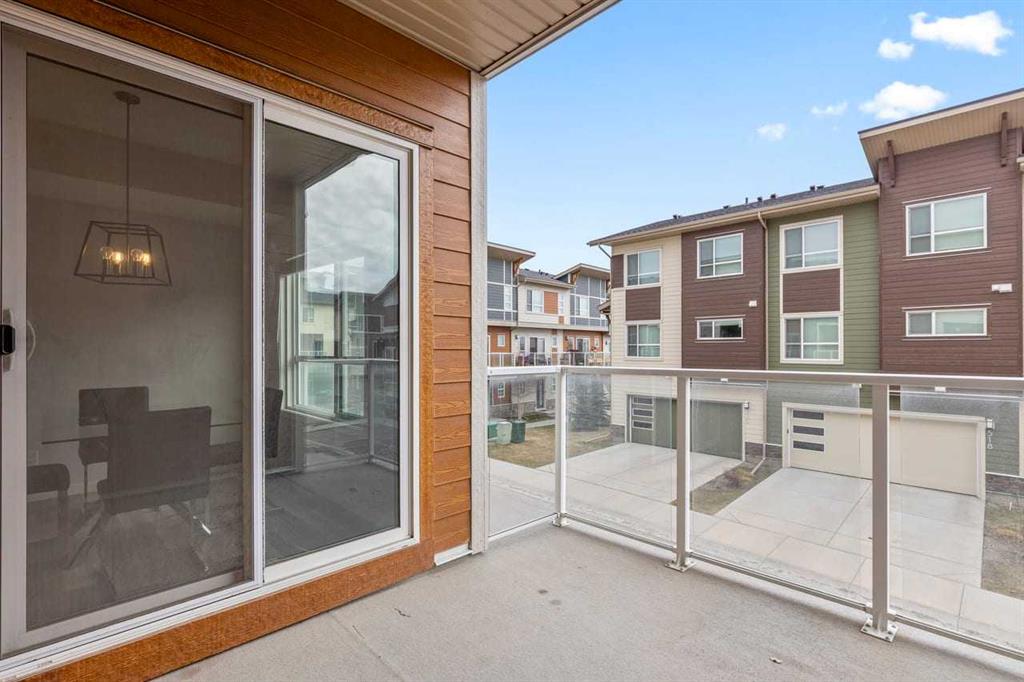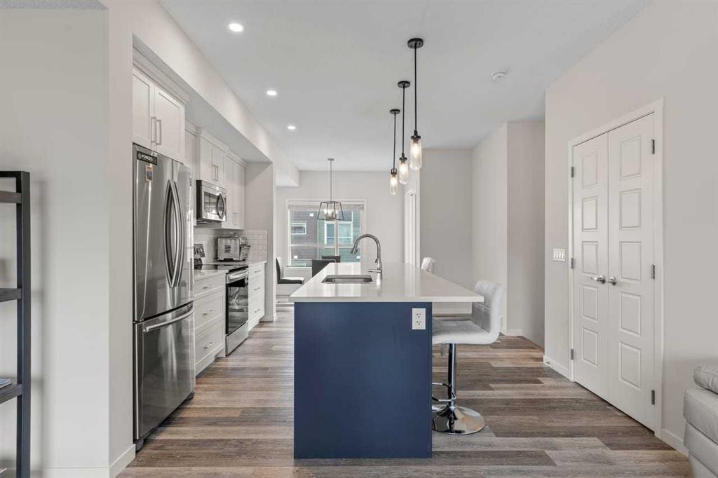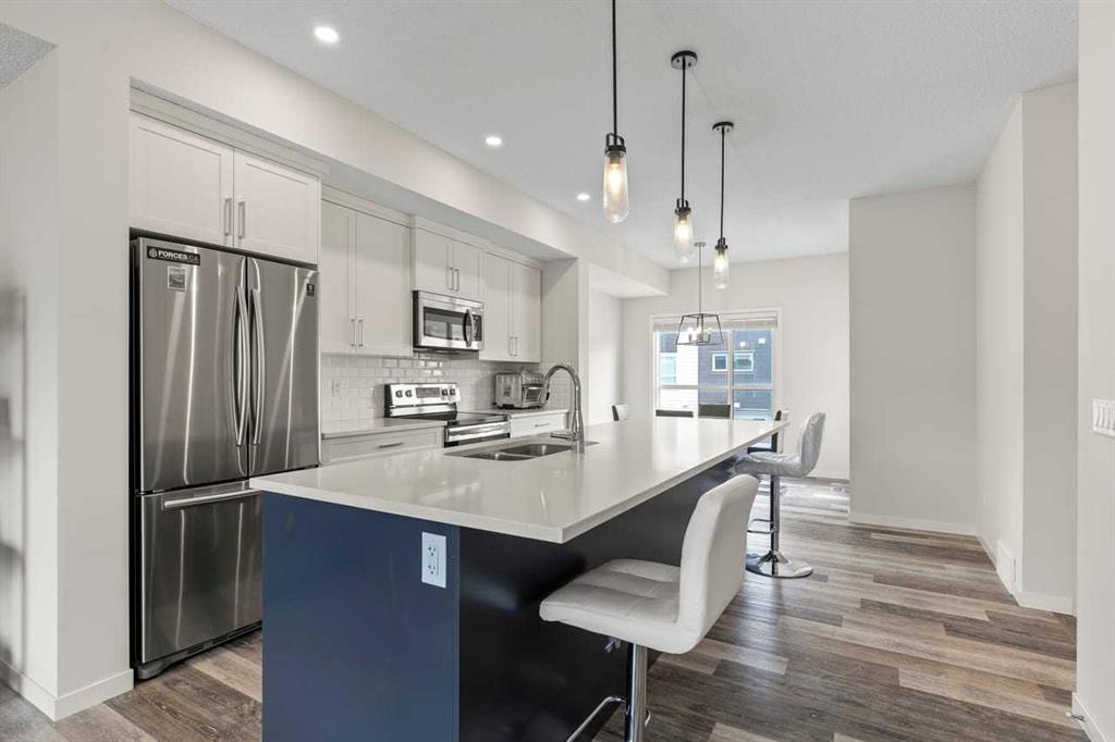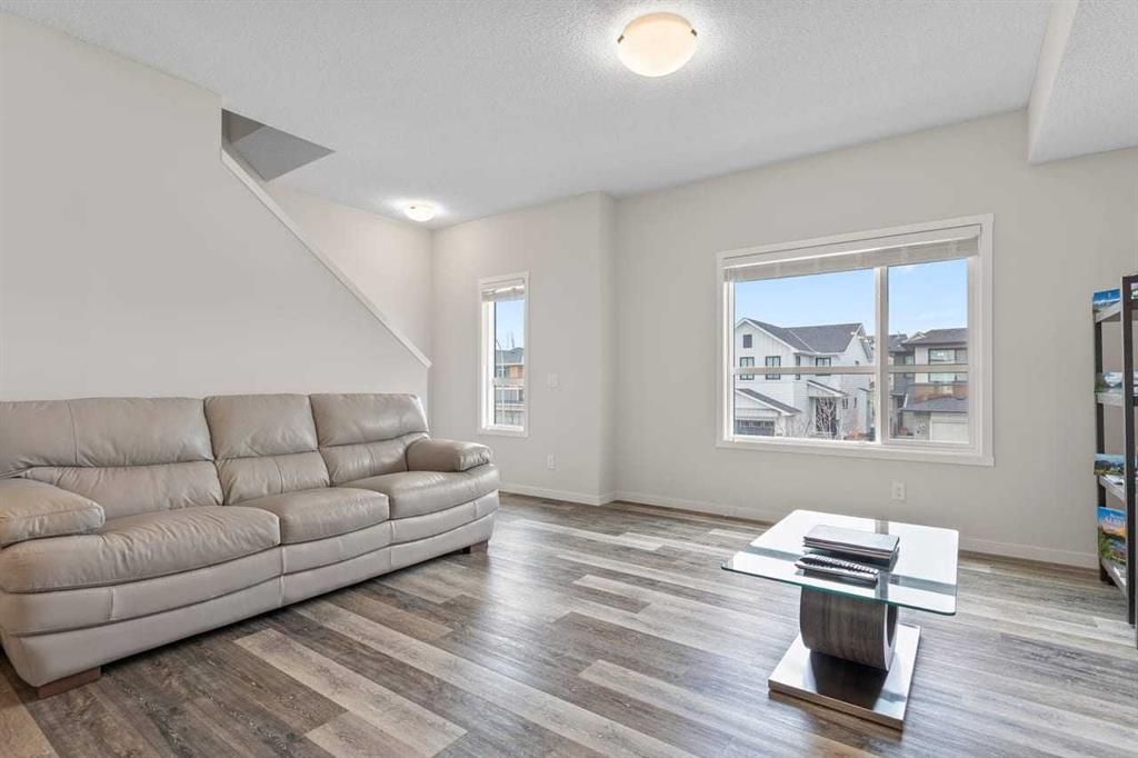 Discover modern comfort, style, and functionality in this bright and spacious 3-storey townhouse in the heart of Harvest Hills. Built by Cedarglen Living, this exceptionally well-maintained, move-in-ready home offers approximately 1500 sq. ft. of thoughtfully designed living space, perfect for today’s lifestyle. Step inside to a welcoming entrance level featuring a versatile flex room ideal for a home office, gym, or study and a dedicated laundry area with side-by-side machines providing functionality for families, guests, or work-from-home flexibility. This level also provides access to the double attached side-by-side garage, offering both convenience and additional storage. The second level showcases a seamless open-concept design enhanced by 9-foot ceilings and durable luxury vinyl plank flooring throughout. The bright, east-facing kitchen is a standout, featuring full-height cabinetry, quartz countertops, stainless steel appliances, and a central island—perfect for both everyday living and entertaining. The spacious dining and living areas flow effortlessly to a private balcony with a BBQ gas line, creating the ideal indoor-outdoor experience. A convenient 2-piece bathroom completes this level. Enjoy year-round comfort with the added benefit of central cooling. Upstairs, this home continues to impress with a generous primary retreat offering a walk-in closet and a 4-piece ensuite complete with double vanity and quartz finishes. Two additional well-sized bedrooms and a full 4-piece bathroom completes this level. This vibrant community offers exceptional amenities including scenic walking paths, green spaces, ponds, and unique features like a community with rentable garden beds, as well as pickleball and basketball courts. Ideally located just minutes from Calgary International Airport, with quick access to Deerfoot Trail and Stoney Trail, and close to everyday conveniences such as T&T Supermarket, Home Depot, schools, restaurants, and shopping. Offering a low-maintenance lifestyle with all living space above grade, this premium-spec home truly checks all the boxes.