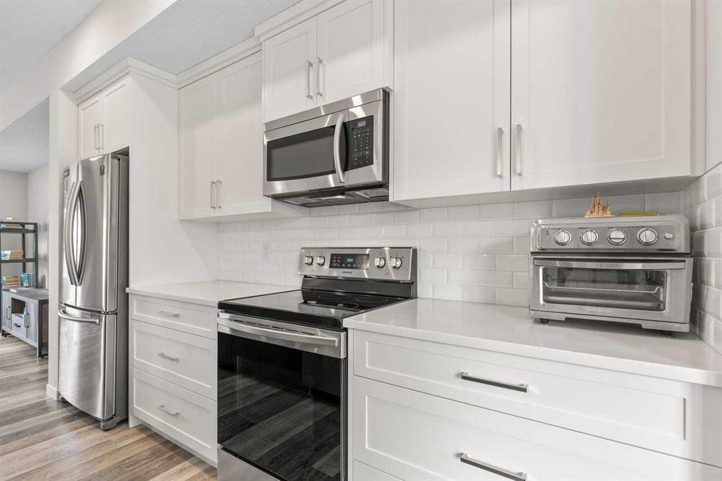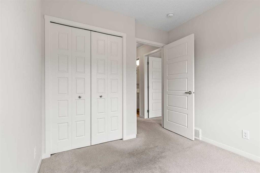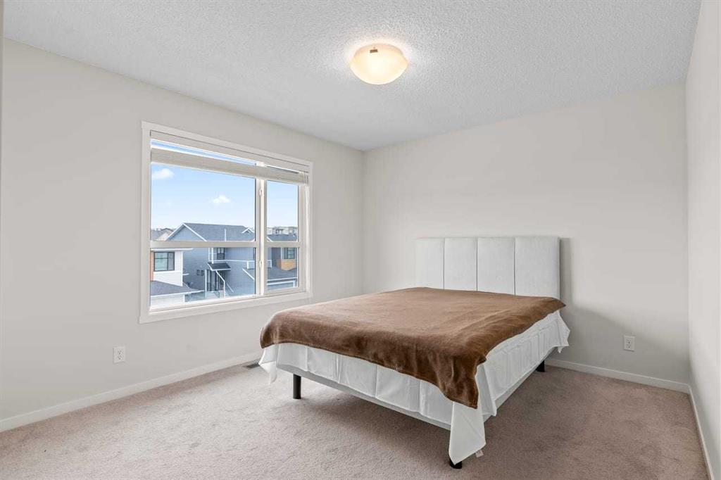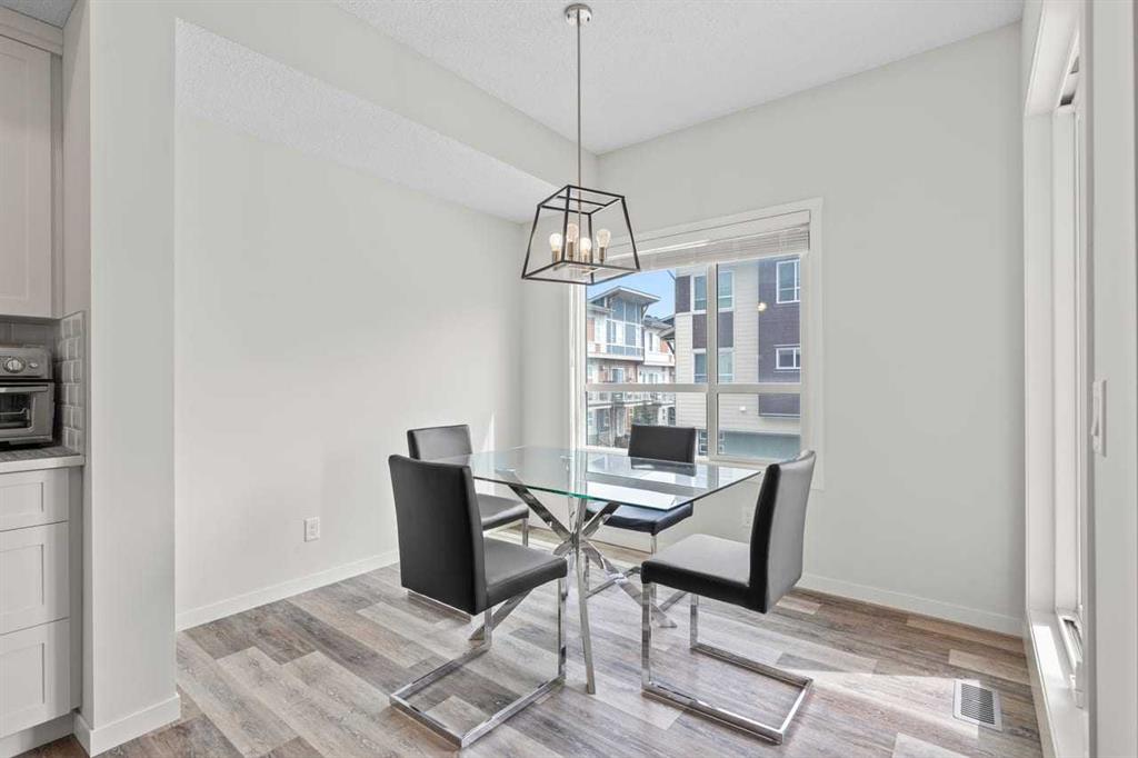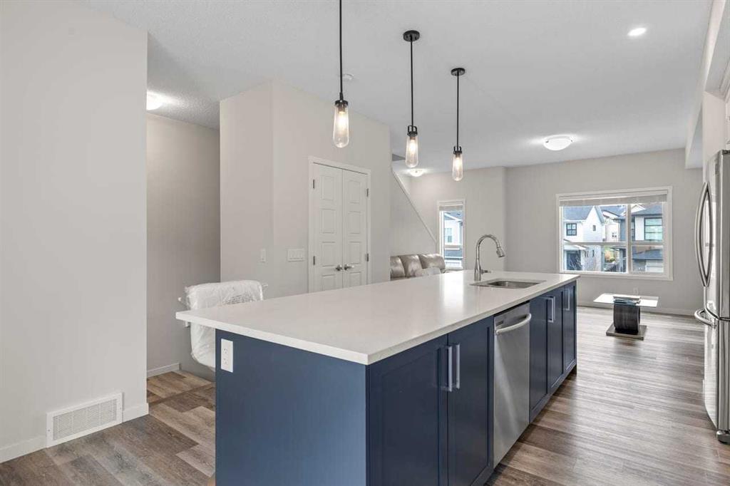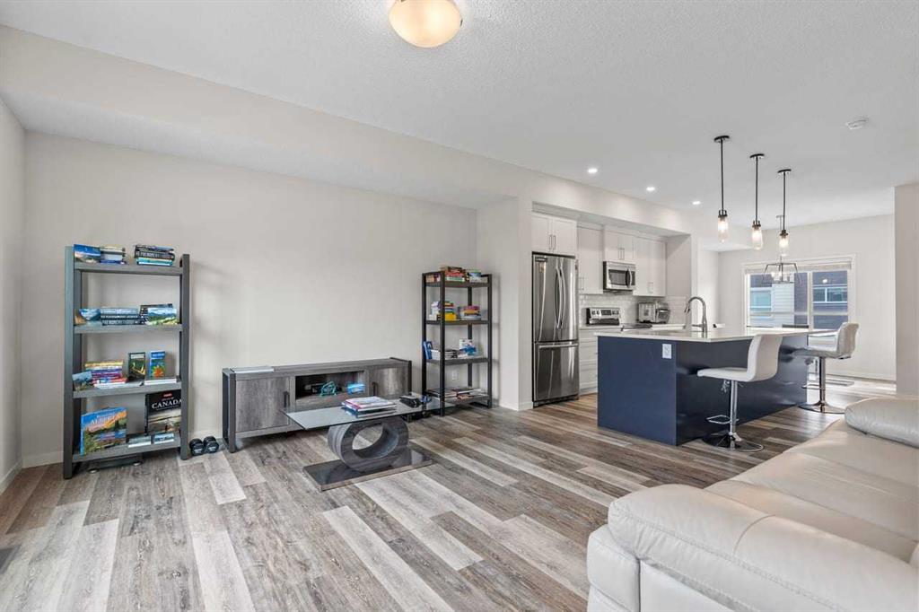Discover modern comfort, style, and functionality in this bright and spacious 3-storey townhouse in the heart of Harvest Hills. Built by Cedarglen Living, this exceptionally well-maintained, move-in-ready home offers approximately 1500 sq. ft. of thoughtfully designed living space, perfect for today’s lifestyle. Step inside to a welcoming entrance level featuring a versatile flex room ideal for a home office, gym, or study and a dedicated laundry area with side-by-side machines providing functionality for families, guests, or work-from-home flexibility. This level also provides access to the double attached side-by-side garage, offering both convenience and additional storage. The second level showcases a seamless open-concept design enhanced by 9-foot ceilings and durable luxury vinyl plank flooring throughout. The bright, east-facing kitchen is a standout, featuring full-height cabinetry, quartz countertops, stainless steel appliances, and a central island—perfect for both everyday living and entertaining. The spacious dining and living areas flow effortlessly to a private balcony with a BBQ gas line, creating the ideal indoor-outdoor experience. A convenient 2-piece bathroom completes this level. Enjoy year-round comfort with the added benefit of central cooling. Upstairs, this home continues to impress with a generous primary retreat offering a walk-in closet and a 4-piece ensuite complete with double vanity and quartz finishes. Two additional well-sized bedrooms and a full 4-piece bathroom completes this level. This vibrant community offers exceptional amenities including scenic walking paths, green spaces, ponds, and unique features like a community with rentable garden beds, as well as pickleball and basketball courts. Ideally located just minutes from Calgary International Airport, with quick access to Deerfoot Trail and Stoney Trail, and close to everyday conveniences such as T&T Supermarket, Home Depot, schools, restaurants, and shopping. Offering a low-maintenance lifestyle with all living space above grade, this premium-spec home truly checks all the boxes.