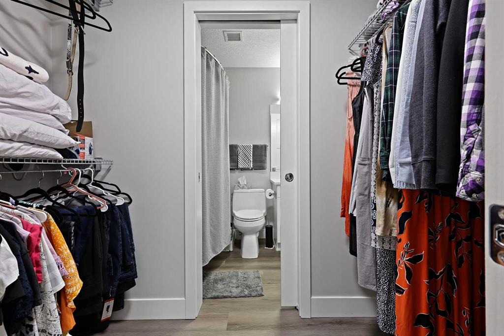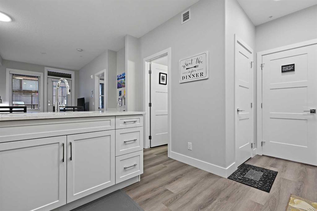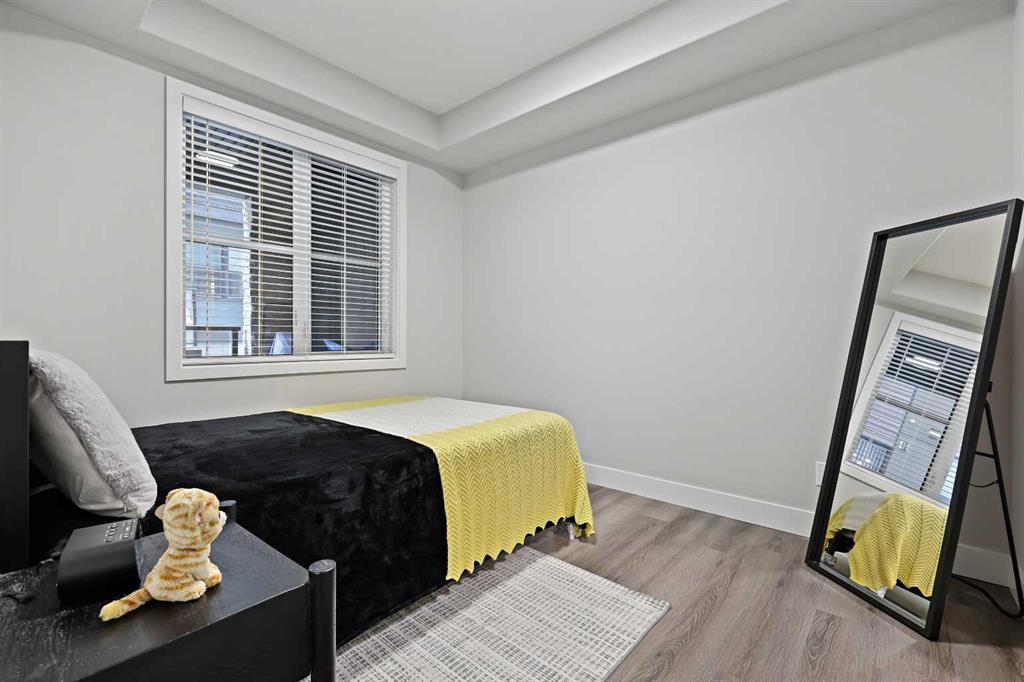 Welcome to this beautiful 1 bedroom, 1 bathroom luxury condo located in the highly sought-after community of Springbank Hill. This Cove Properties built condo is designed with both style and functionality in mind offering a bright open layout and high-quality finishes throughout. Step inside to warm luxury vinyl plank flooring that flows through the main living areas. The contemporary kitchen is as functional as it is stylish, featuring quartz countertops, crisp white cabinetry, stainless steel appliances, and ample workspace. A designated laundry room and additional storage add everyday convenience. The spacious primary bedroom is complemented by a walk-in closet with direct access to the elegant 4-piece bathroom, complete with a cheater door for added privacy and ease of use. Enjoy the outdoors on your massive ground-floor patio with a gas line, perfect for barbecuing and entertaining. This unit also comes with a titled underground parking stall and an additional storage locker. Set in an unbeatable location, you’ll appreciate being close to shopping, transit, schools, and all the amenities that make Springbank Hill such a desirable place to live.