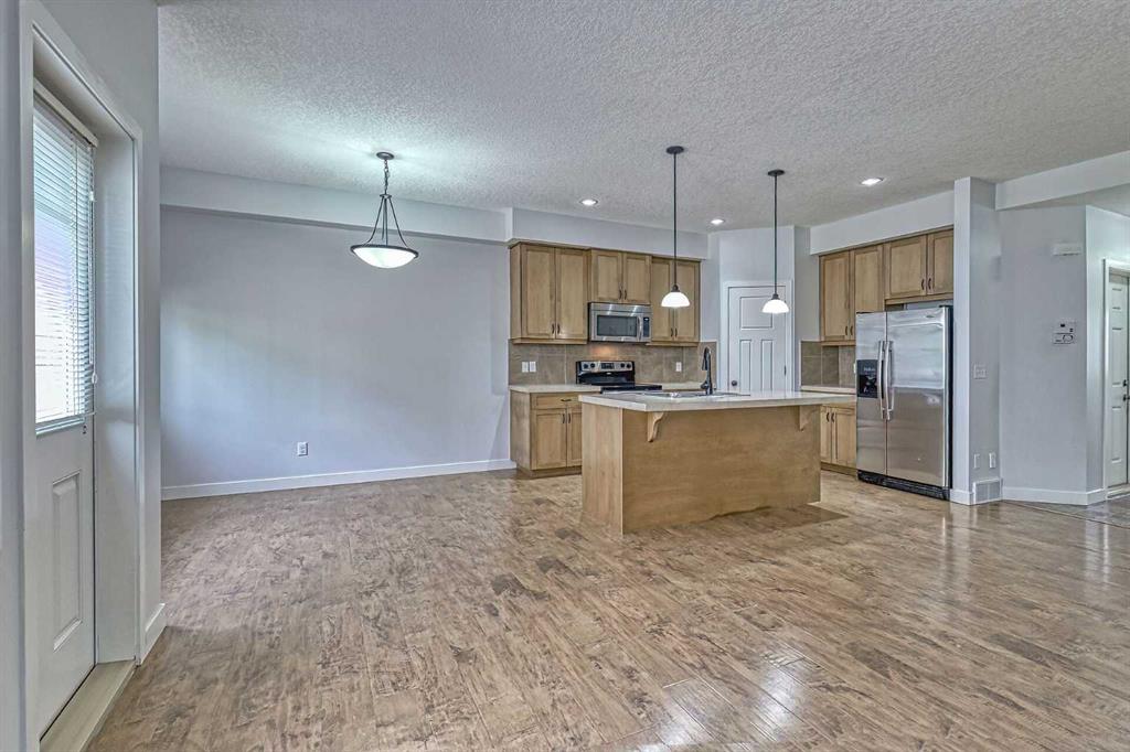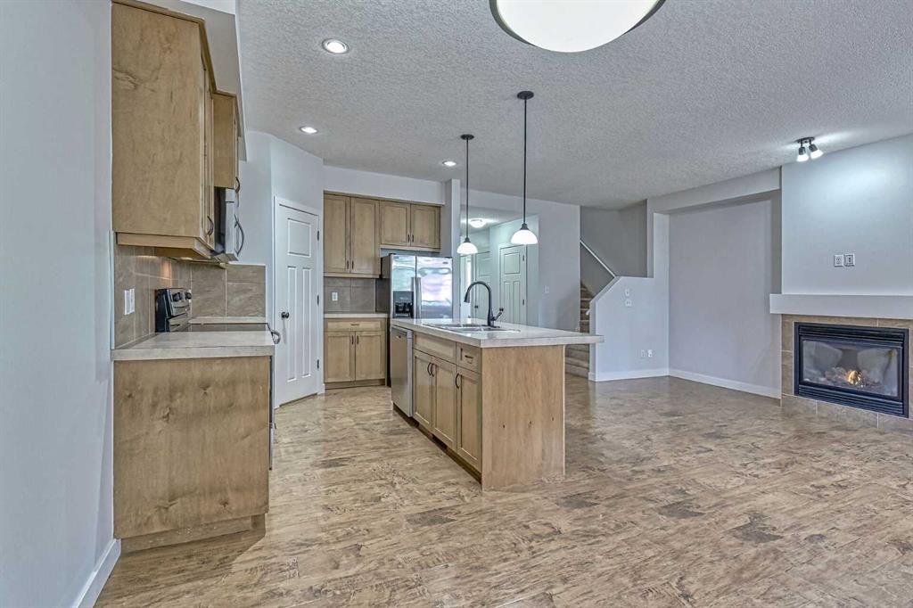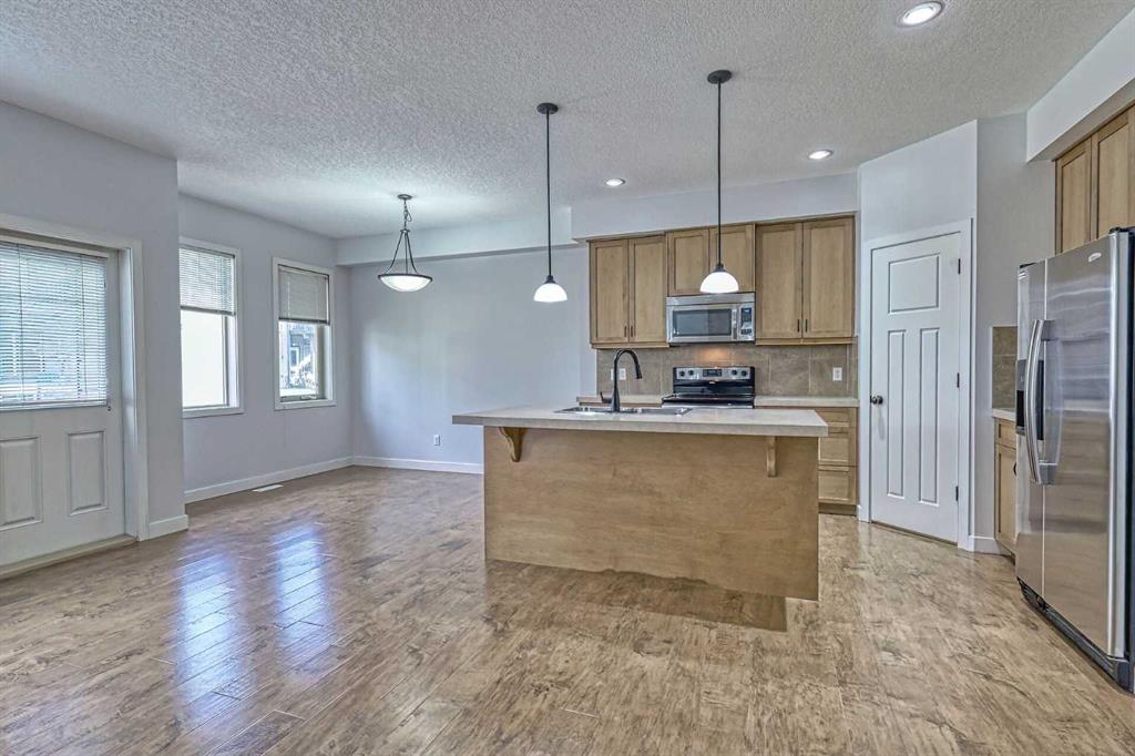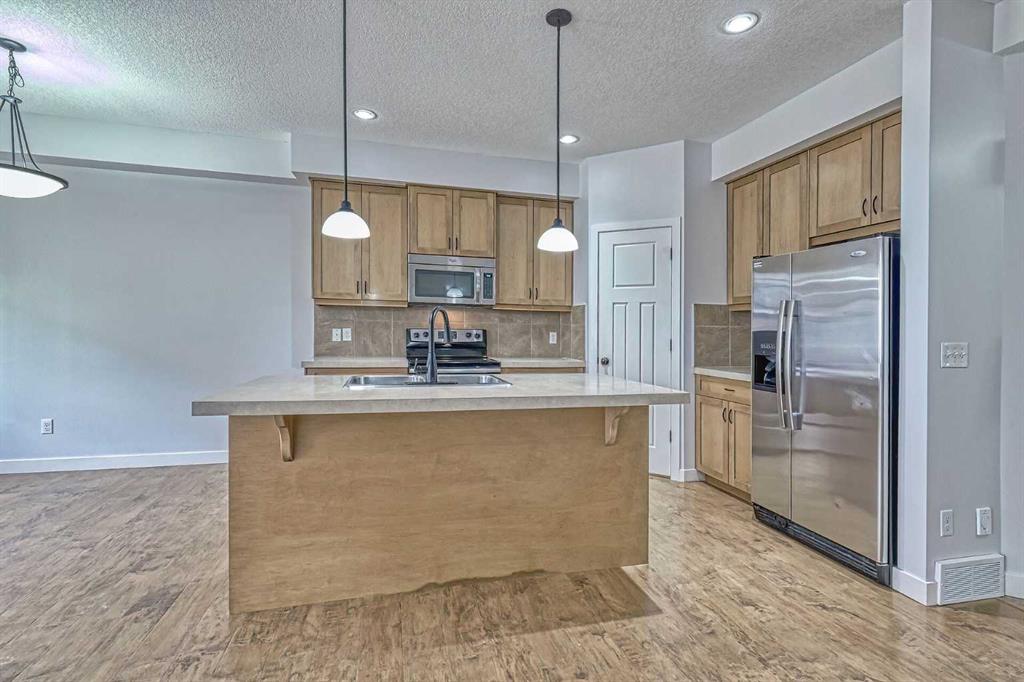 WOW—THIS LOCATION CAN’T BE BEAT! This beautifully maintained 3 bed, 3 bath townhouse is completely move-in ready (quick possession available) and offers the perfect blend of comfort, convenience, and style. Located next to the COCHRANE GOLF COURSE - with DIRECT walk access to the RESTAURANT and MAIN CLUB HOUSE. The main floor welcomes you with an open-concept layout ideal for entertaining. A bright foyer features a handy 2-piece powder room and its closet for coats and shoes. A spacious living room with a warm gas fireplace sets the tone for cozy evenings at home. The kitchen is designed for function and flow, offering abundant cabinetry, a walk-in pantry, breakfast bar seating for four, and all appliances included. The dining area opens to freshly stained back deck with natural gas hookup, perfect for summer BBQs. Upstairs, the layout shines with three generous bedrooms, a full 4-piece bathroom and laundry right where you need it. The primary suite is a true retreat with a luxurious ensuite—separate shower, deep soaker tub—and a walk-in closet with built-in organizer. The basement is a blank canvas with bathroom rough-in, egress window, and plenty of space to create a bedroom, family room, or both. Extras include a built-in vacuum, window coverings, and garage door opener. Fresh paint throughout makes this home feel brand new. Condo fees are $335.96/month and the well-run complex boasts a strong reserve fund. Steps from river pathways, close to Cochrane’s historic downtown, Spray Lake Rec Centre, and so much more. Claim the active, low-maintenance lifestyle built for your on-the-go life.