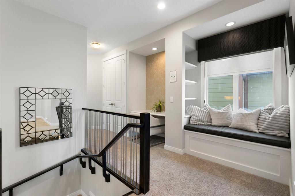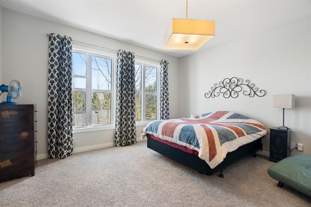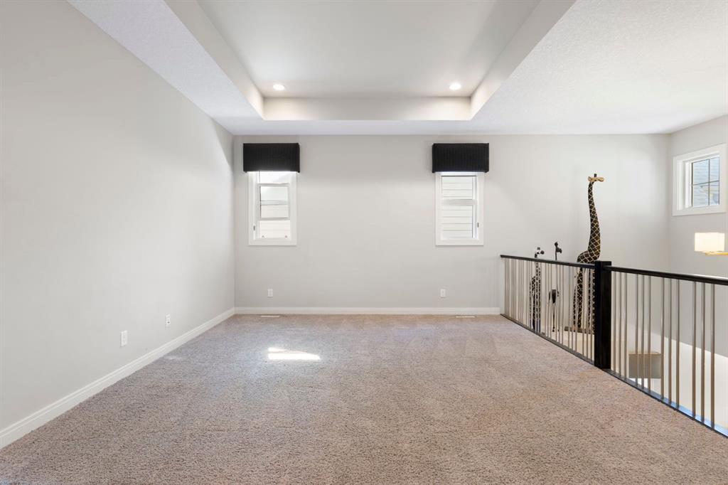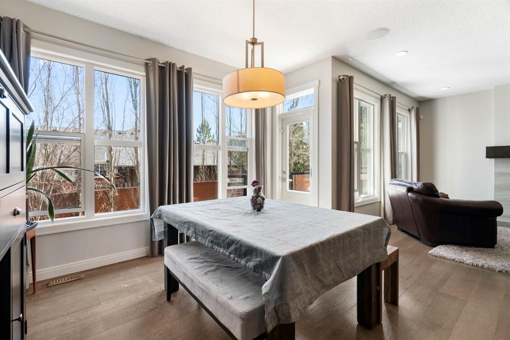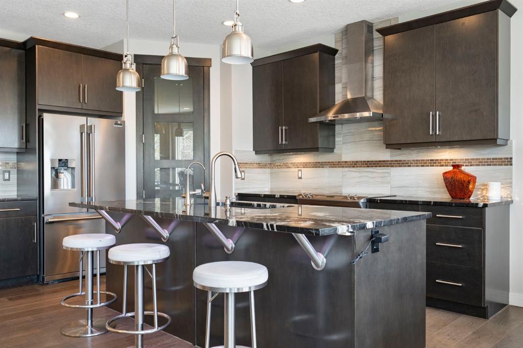 Located in the community of Riviera, this home offers over 3,000 sq ft of finished living space on a quiet crescent set just behind a wooded area and minutes from the Bow River pathways. The main floor opens with 10-foot ceilings and a bright, open layout that carries through the kitchen, dining and living spaces. The kitchen is centred around a large island with seating, stainless steel appliances and a walk-through pantry that connects directly to the mudroom and garage entry. The dining area includes a bump-out for a larger table, while the living room is anchored by a gas fireplace. A flex space at the front of the home adds versatility for a home office or sitting area, along with a powder room to complete the main level. Upstairs, the bonus room continues the sense of space with 10-foot ceilings and separation from the main living area. The primary bedroom is positioned for privacy and includes a walk-in closet and ensuite with a soaker tub, tiled shower and double vanity. Two additional bedrooms, a full bathroom, and an upper laundry room with a sink add everyday convenience. Built-in features like the desk and window seat bring in a bit of character without taking away usable space. The fully finished basement adds another layer with a family room, wet bar, dedicated media room, fourth bedroom with egress windows, and a full bathroom. Additional features include dual furnaces and air conditioning units for temperature control between floors, a speaker system wired throughout, adjustable lighting, central vacuum, water softener with reverse osmosis, and an in-ground sprinkler system. Riviera is known for its access to the Bow River and pathway system, along with its proximity to Spray Lake Sawmills Family Sports Centre, the parks and ball diamonds in Greystone Park, and everyday essentials at Co-op Food Store. With quick access to downtown Cochrane and an easy commute into Calgary, the location offers a balance of outdoor space and convenience. Call your favourite realtor and book a showing today!