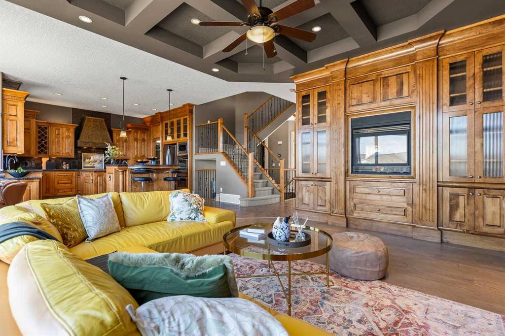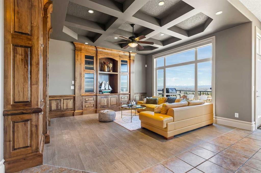 Panoramic Rocky Mountain views take center stage in this exceptional former show home, creating a sense of space and calm that is immediately felt the moment you enter. Offering over 4,000 sq. ft. of total living space, the spacious main floor is enhanced by 10 ft ceilings and an open-concept layout designed to maximize light and sightlines. Expansive windows frame the landscape like artwork, with open skies, rolling horizon, and distant peaks visible throughout the main living areas. The living room is both inviting and refined, anchored by a coffered ceiling and a substantial custom wood built-in that speaks to the level of craftsmanship throughout. Warm engineered hardwood flooring and the seamless connection to the dining area create a space equally suited for everyday living and entertaining. A separate main floor sitting area provides additional flexibility for formal gatherings or a quiet retreat. Originally built by Ashton Luxury Living, the home reflects an exceptional level of detail and finish throughout. The kitchen is thoughtfully designed with ceiling-height solid wood cabinetry, a generous granite island, high-end stainless steel appliances, a custom range hood, full-height backsplash, durable tile flooring, and a walk-in pantry for exceptional storage. The main floor balcony, accessed from the kitchen and dining area, offers a seamless indoor-outdoor transition, perfect for enjoying the mountain views. A functional main floor laundry room with sink adds everyday convenience. Upstairs, the primary suite serves as a private retreat, featuring a cathedral ceiling, with views of the Rocky Mountains, a spacious 5-piece ensuite, and a walk-in closet with custom cabinetry. The ensuite is beautifully finished with furniture-style vanities, detailed millwork, and a deep soaker tub within a fully tiled surround. The bonus room is a standout feature, enhanced by extensive built-in cabinetry that adds both character and highly functional storage, ideal for a media room, office, or family space. The fully developed walk-out basement offers a bright and functional extension of the home, with large windows that create an inviting atmosphere. A spacious living area is complemented by a wet bar with granite countertops, ideal for entertaining or everyday use. With durable flooring, a full bathroom, and direct outdoor access, this level provides excellent flexibility for guests, extended family, or additional living space. Additional features include an oversized double garage, a new hot water tank (2023), and recently updated second-floor windows. Ideally located within walking distance to schools and with access to nearby walking and biking pathways, this home also offers convenient access to the Shane Homes YMCA, C-Train station, Stoney Trail, and Crowchild Trail. A rare combination of enduring quality, thoughtful design, and truly exceptional views - be sure to explore the 3D tour for a complete experience.
