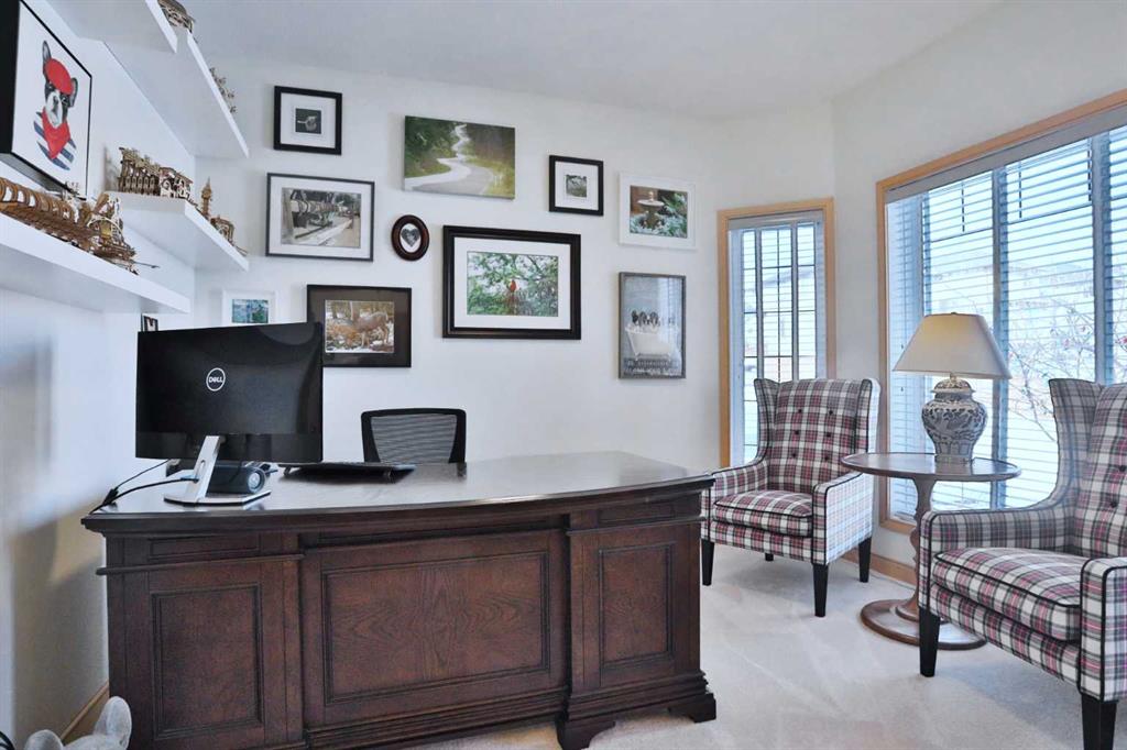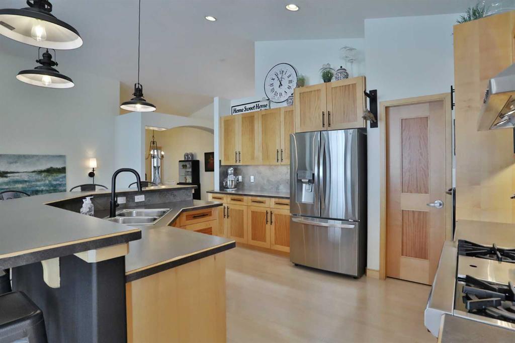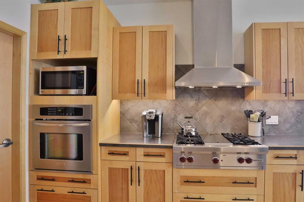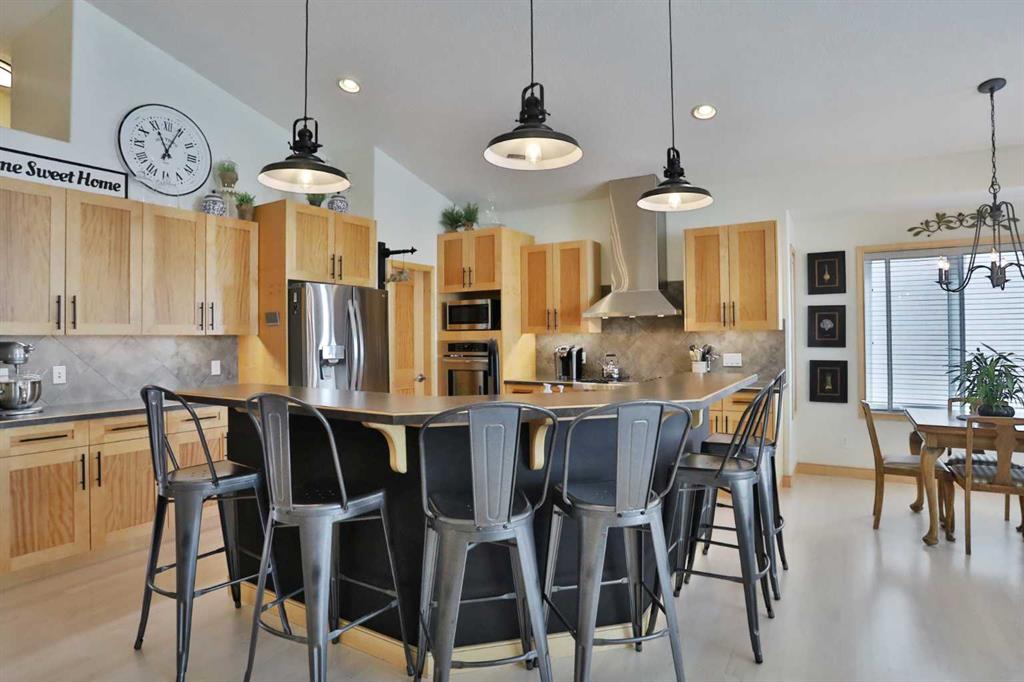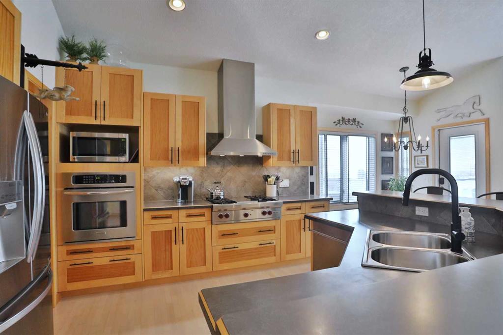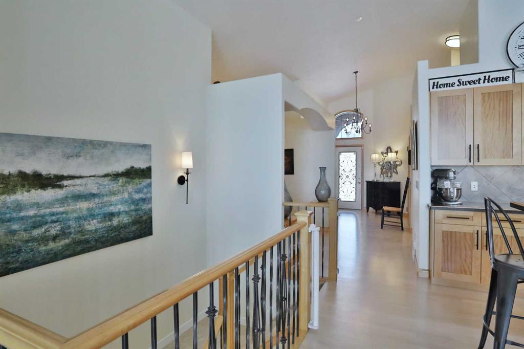 A rare opportunity you won’t want to miss here in this beautifully updated bungalow backing onto the escarpment in the popular Symons Valley community of Sherwood. Offering a total of 3 bedrooms + den & over 2900sqft of living space, this mint condition air-conditioned home enjoys refinished onsite maple hardwood floors, stunning kitchen with custom maple/mahogany cabinetry, sensational lower level with infloor heating & beautifully landscaped backyard with lush perennial gardens & stone patio..plus a host of improvements including storm-resistant roof, hot water tank & appliances. Truly incredible open concept main floor with soaring vaulted ceilings, showcasing the sun-drenched living room with fireplace & expanse of windows, elegant formal dining room with graceful archway & custom kitchen with large island & ceramic tile backsplash, oversized walkthru pantry & the upgraded stainless steel appliances include Wolf gas cooktop with built-in griddle & chimney hoodfan, built-in Frigidaire Pro convection oven, & new dishwasher (2025) & fridge (2024)...both from LG. The private owners' retreat is an airy & inviting space with a big bay window, great-sized walk-in closet & jetted tub ensuite with double vanities, tile floors & separate shower. Renovated in 2022 (with permits), the lower level - with 9ft ceilings & infloor heating, is beautifully finished with 2 bedrooms, large full bath with linen closet, office/craft room with barn door closet & terrific games/rec room...the perfect spot to hang out with the family. Main floor also has a dedicated home office with French doors & laundry room with built-in cabinets/sink & new LG washer & dryer (2025). Both the front & back yards are exquisitely & professionally landscaped...with stone walkways & patio, new permanent outdoor Gemstone X-mas lights (2025), 3-tiered concrete fountain (backyard) & deck complete with natural gas line for your BBQ, under-deck storage & Duradek weather-protection deck. Extensive features including plantation shutters (lower level) & 2” Levolor blinds (main level), finished garage with new heater (2024) & sealed floors, solid maple doors & cabinets with mahogany inserts, exposed aggregate front walkway & driveway, glass hand railings & in addition to the new roof in 2025 & refinished hardwood floors in 2026, there are new light fixtures, 2 new industrial-size/high-efficiency hot water tanks (2025), brand new furnace (2026), new central air (2023) & new main floor carpets (2024). A simply amazing home just minutes to neighbourhood greenspaces & Blessed Marie-Rose School, walking distance to bus stops & quick easy access to shopping (including Beacon Hill, Sage Hill Crossing & Sage Hill Quarter) & Stoney/Sarcee/Shaganappi Trails.