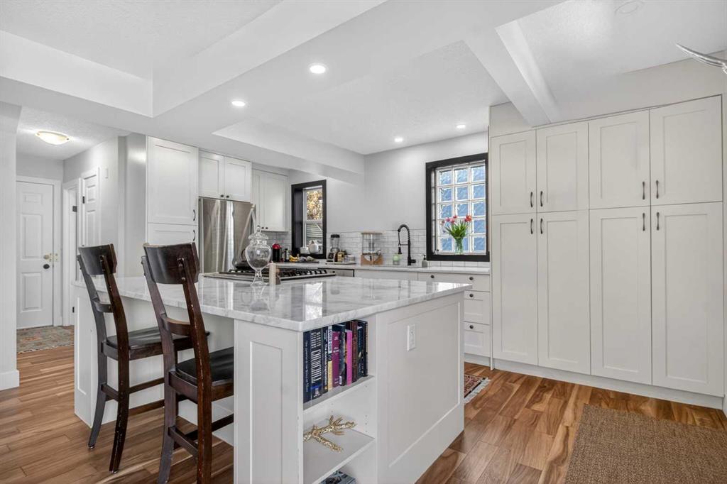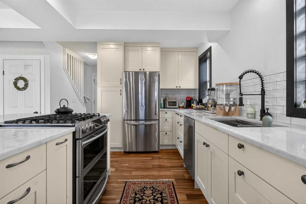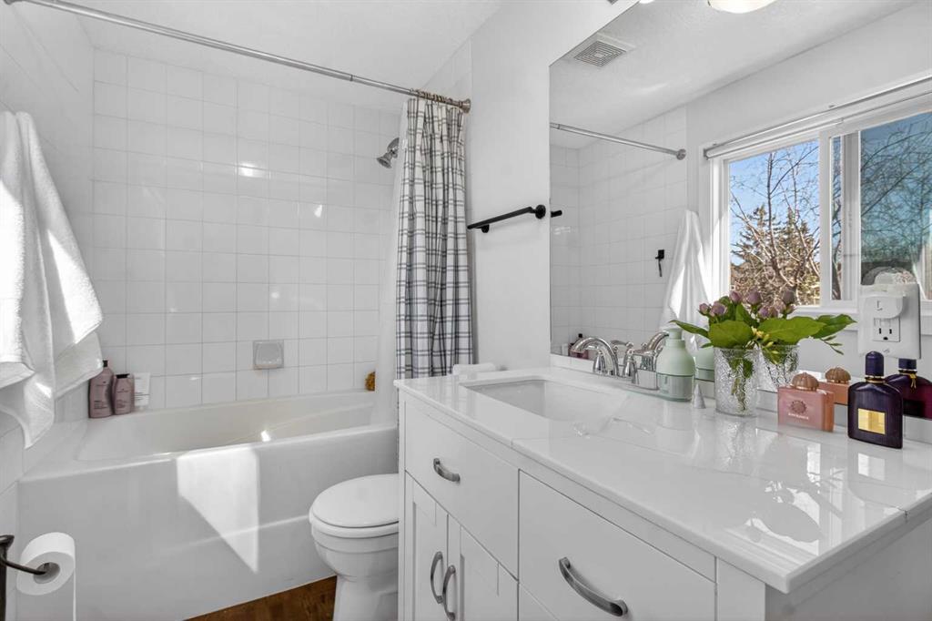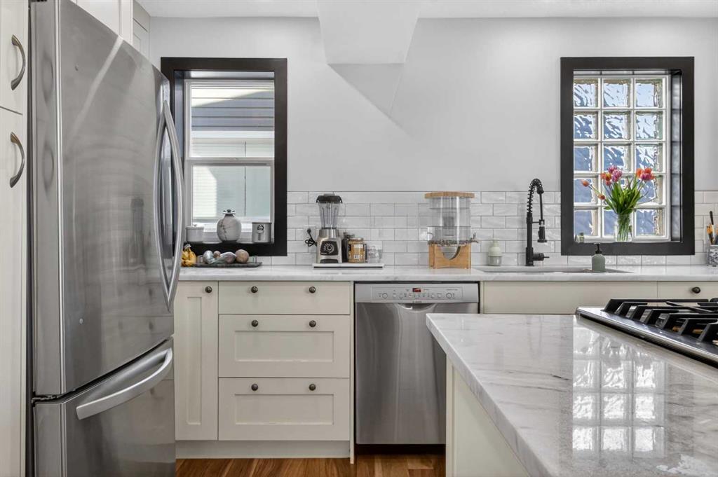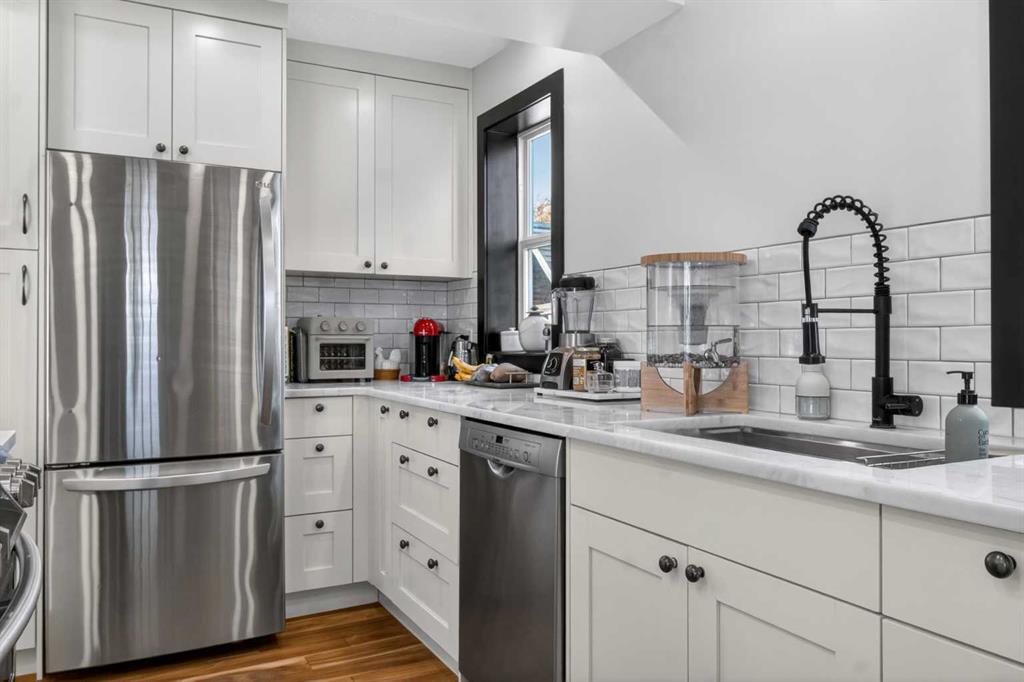 Tucked into one of Calgary’s most vibrant and walkable inner-city communities, this charming 1.5 storey home in Garrison Woods shows pride of ownership from the moment you arrive. Inside, the home showcases warm acacia hardwood flooring, a beautifully updated kitchen with dolomite countertops, new sink, fixtures, and a sleek oven with retractable hood fan. Updated paint, baseboards, and refined finishes throughout create a bright, welcoming atmosphere. With 2 bedrooms and 2 full bathrooms, including a spacious primary retreat complete with a 4 pc ensuite, this home is ideal for professionals, couples, or young families. The fully finished basement expands your living space with new carpet, ceiling, and lighting, offering flexibility for a rec room, office, or guest area. Modern comforts include a Sensi Wi-Fi thermostat, solar panels (over $30,000 installed), and EV charger hookup in the garage, bringing efficiency and future-ready convenience together seamlessly. Step outside to your own private oasis. The professionally landscaped backyard is a gardener’s dream, filled with mature pine, spruce, lilac, and juniper, along with flowering plants that thrive in this unique microclimate. With vinyl fencing (2024), abundant sunshine, and space to relax or entertain, it’s a peaceful retreat right in the city. Major exterior updates including roof, siding, and eavestroughs (2024) add peace of mind. Just steps from Marda Loop, you can enjoy the rare convenience of walking to multiple coffee shops and ice cream parlours. Outdoor enthusiasts will love being a short drive or bike ride to Sandy Beach Park, River Park, and scenic pathways. Families will appreciate access to highly rated schools nearby like MRU, Clearwater Academy, Webber Academy, Rundle, and more. This is a community known for its friendly neighbours, beautifully maintained homes, and lively spirit—especially during holidays, when the streets come alive with festive displays and events. Whether it’s summer strolls, local markets, or Halloween traditions, there’s a true sense of belonging here.