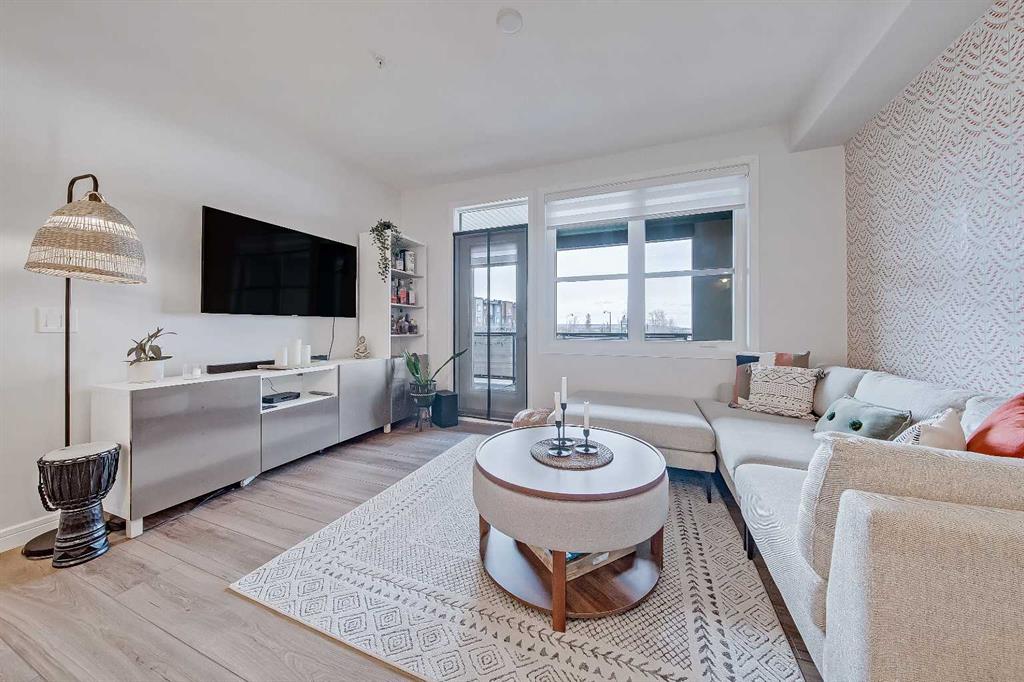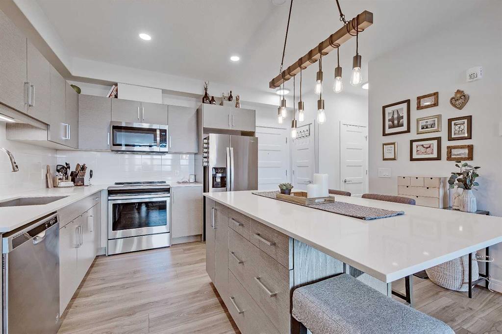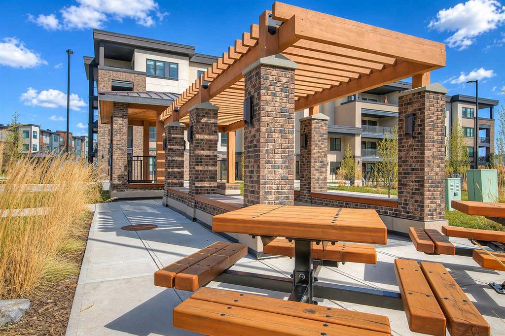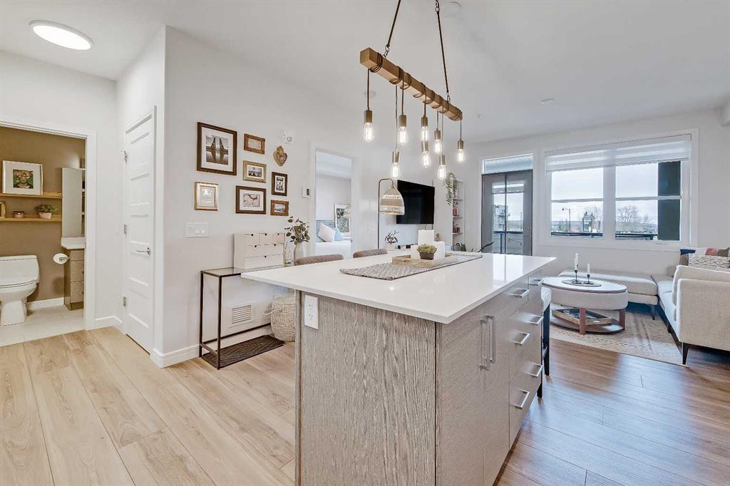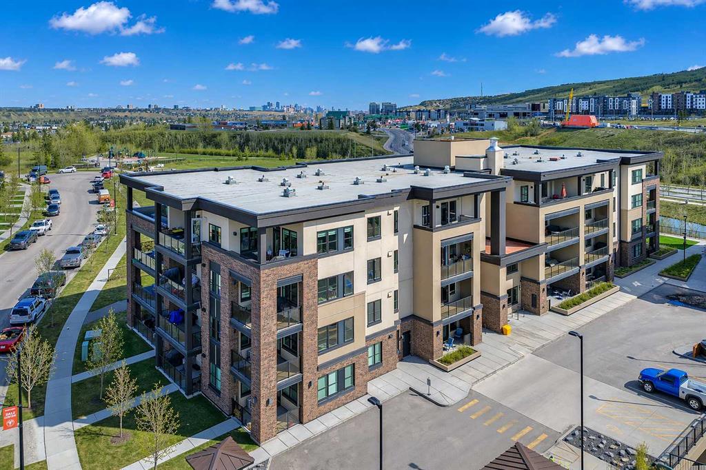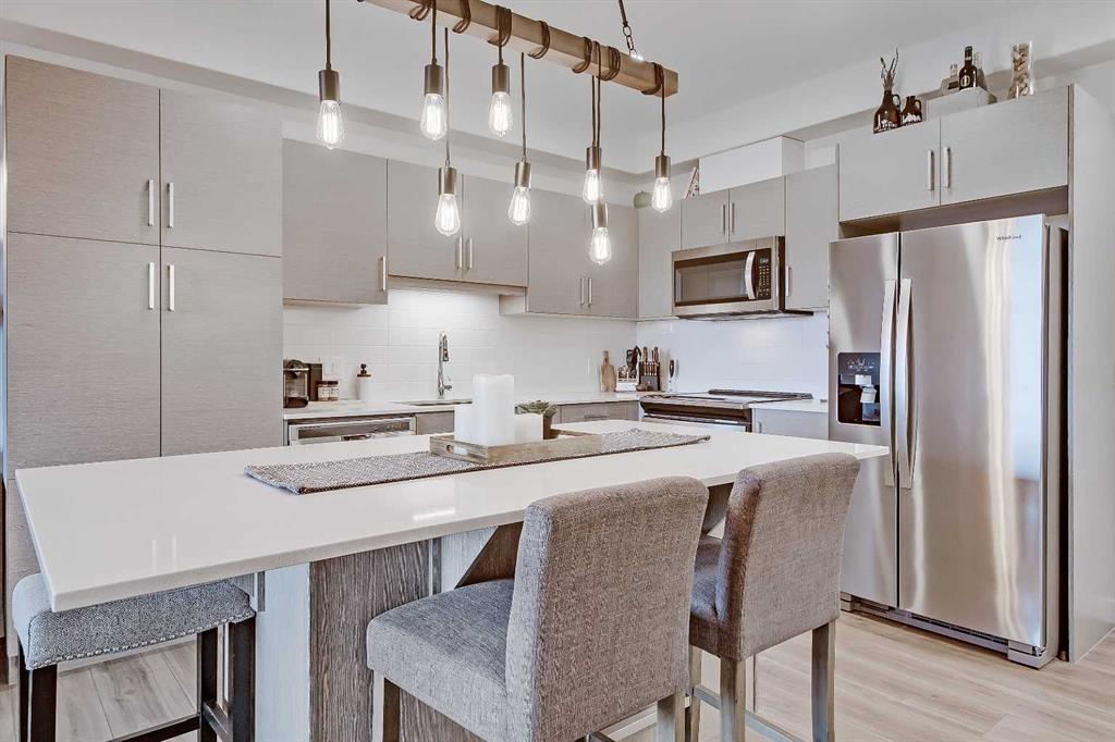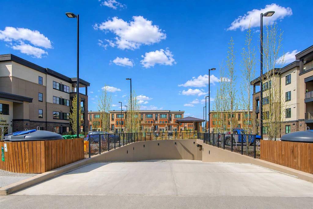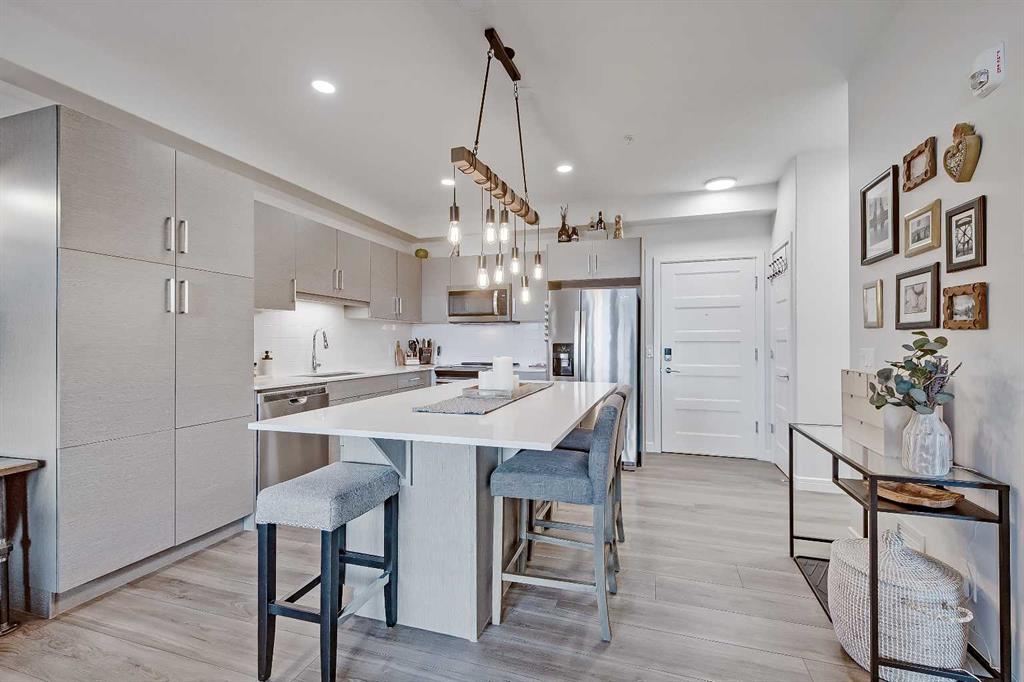 GORGEOUS 1 BEDROOM UNIT | IMMACULATE CONDITION | SAME FLOOR STORAGE LOCKER | UNDERGROUND PARKING Located in the emerging neighbourhood of Greenwich, this beautiful 1-bedroom apartment offers an exceptional blend of comfort, convenience and everyday lifestyle appeal. Planned as a live, work, shop and play urban village, this northwest hub is home to boutique shopping, coffee spots, restaurants and Calgary Farmers’ Market West, while also offering quick access to downtown, the mountains and nearby parks and trails. Impeccably kept and move-in ready, the home also includes a hard-to-find same-floor storage unit just down the hall, adding even more everyday functionality to an already appealing space. Inside, you will find a bright, open-concept layout that feels both polished and welcoming, with 9' ceilings, luxury vinyl plank flooring and large windows that bring in an abundance of natural light. The kitchen is especially impressive, featuring quartz countertops, a substantial centre island with breakfast bar seating, stainless steel appliances, sleek contemporary cabinetry and excellent storage throughout, while the rustic light fixture above the island adds a stylish focal point. The living room area offers a comfortable setting for day-to-day living, hosting friends or simply enjoying a quiet evening at home, with enough flexibility to accommodate a desk or small workspace. The feature wall in the living room adds texture and visual interest, giving the interior an upscale and thoughtfully finished feel. One of the standout features of the home is the massive covered east-facing balcony, complete with a BBQ gas line and the kind of usable outdoor space that is not often found in apartment living. The bedroom is well proportioned and paired with a large walkthrough closet, while the stylish 4-piece ensuite has full-height tile, modern finishes and the added convenience of access from both the bedroom and main living area. Added comforts such as in-floor heating, central air conditioning and in-unit laundry make the space feel complete. The lifestyle appeal continues beyond the unit itself with a thoughtful collection of building amenities designed for both comfort and convenience. Residents enjoy heated underground parking with an additional storage locker directly in front of the stall, secure bike storage, visitor parking and beautifully maintained outdoor spaces that make it easy to enjoy the setting. A gazebo, picnic areas and dedicated seating spaces create inviting places to relax, gather with friends or simply take in the surrounding views. Whether you are a first-time buyer, downsizer or investor looking for a beautifully maintained and easy-to-enjoy property, this home offers a polished, low-maintenance lifestyle in one of northwest Calgary’s most exciting emerging communities. Stylish, practical and exceptionally well kept, this is a wonderful opportunity to step into Greenwich and feel at home right away.
