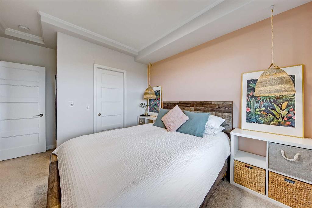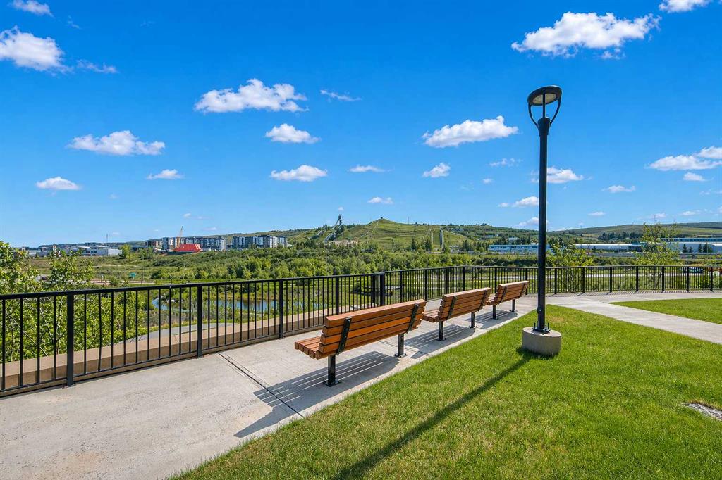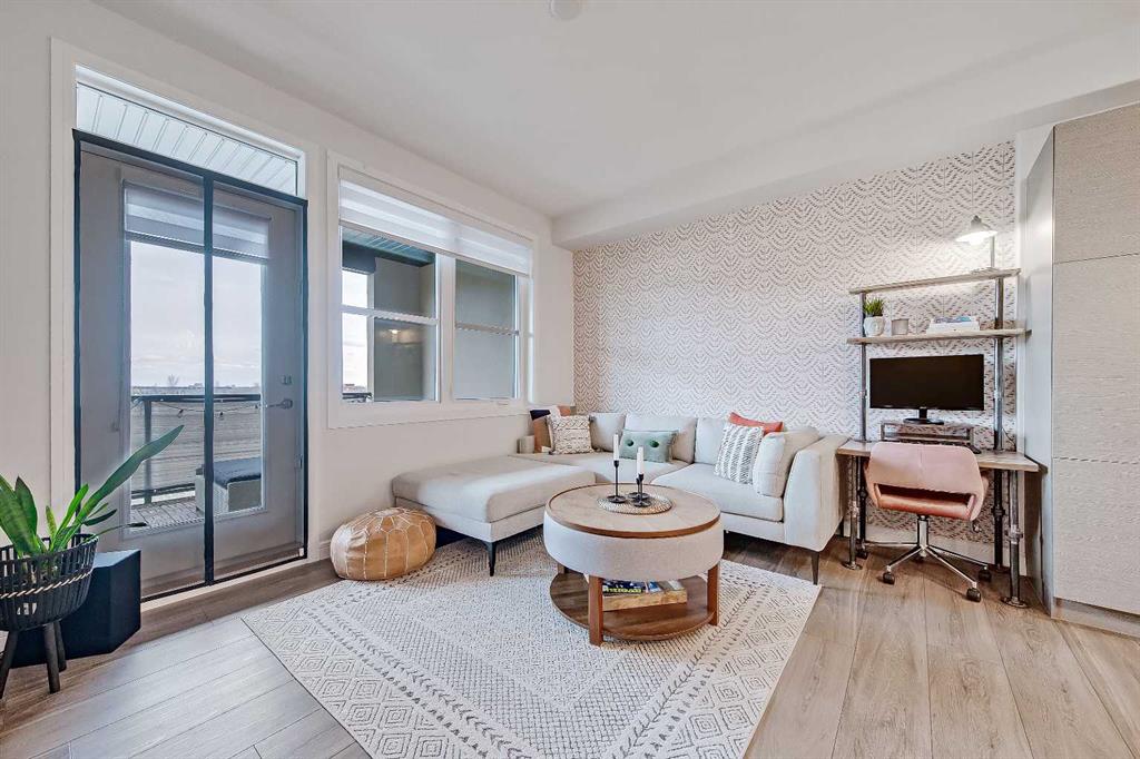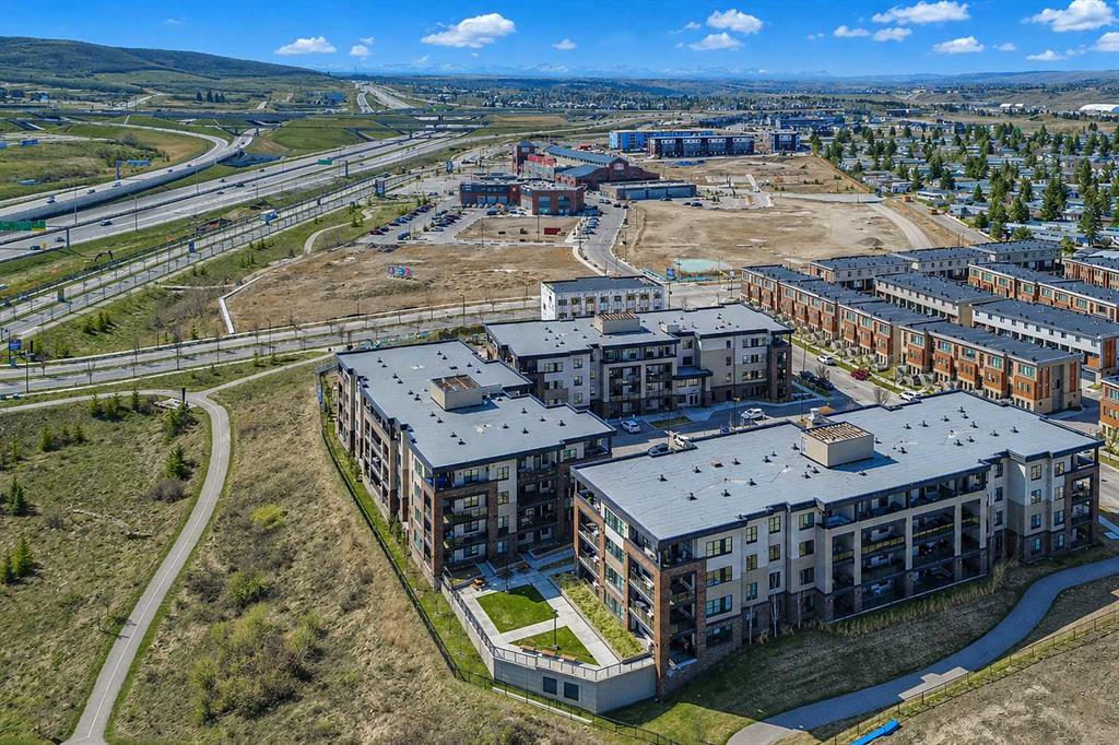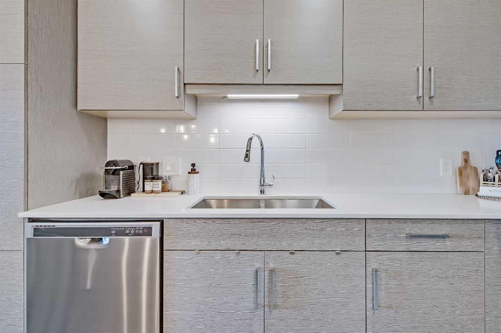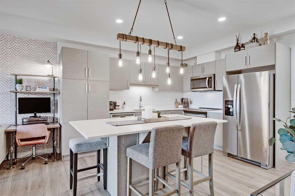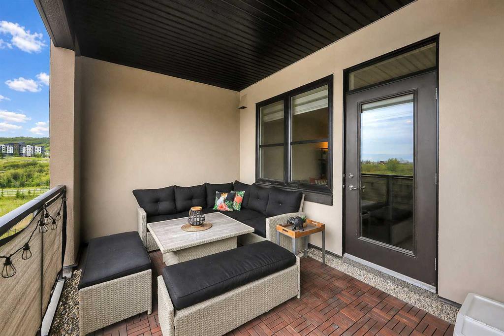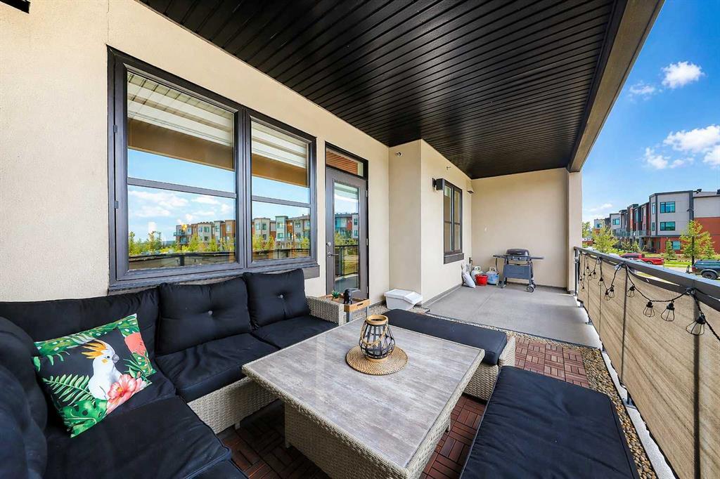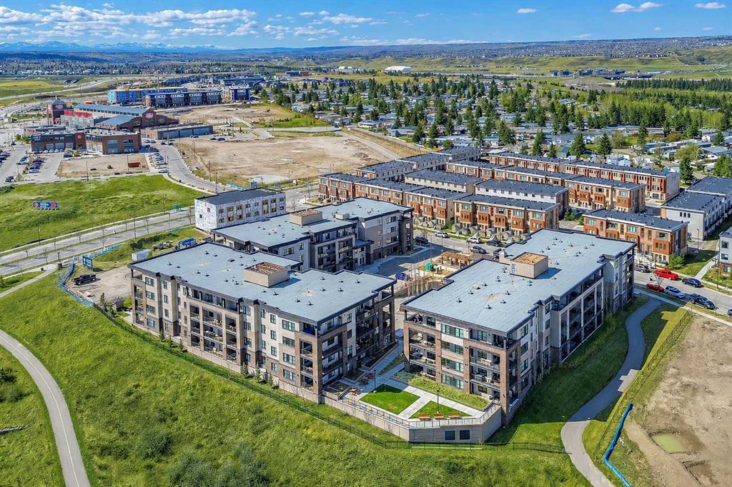 GORGEOUS 1 BEDROOM UNIT | IMMACULATE CONDITION | SAME FLOOR STORAGE LOCKER | UNDERGROUND PARKING Located in the emerging neighbourhood of Greenwich, this beautiful 1-bedroom apartment offers an exceptional blend of comfort, convenience and everyday lifestyle appeal. Planned as a live, work, shop and play urban village, this northwest hub is home to boutique shopping, coffee spots, restaurants and Calgary Farmers’ Market West, while also offering quick access to downtown, the mountains and nearby parks and trails. Impeccably kept and move-in ready, the home also includes a hard-to-find same-floor storage unit just down the hall, adding even more everyday functionality to an already appealing space. Inside, you will find a bright, open-concept layout that feels both polished and welcoming, with 9' ceilings, luxury vinyl plank flooring and large windows that bring in an abundance of natural light. The kitchen is especially impressive, featuring quartz countertops, a substantial centre island with breakfast bar seating, stainless steel appliances, sleek contemporary cabinetry and excellent storage throughout, while the rustic light fixture above the island adds a stylish focal point. The living room area offers a comfortable setting for day-to-day living, hosting friends or simply enjoying a quiet evening at home, with enough flexibility to accommodate a desk or small workspace. The feature wall in the living room adds texture and visual interest, giving the interior an upscale and thoughtfully finished feel. One of the standout features of the home is the massive covered east-facing balcony, complete with a BBQ gas line and the kind of usable outdoor space that is not often found in apartment living. The bedroom is well proportioned and paired with a large walkthrough closet, while the stylish 4-piece ensuite has full-height tile, modern finishes and the added convenience of access from both the bedroom and main living area. Added comforts such as in-floor heating, central air conditioning and in-unit laundry make the space feel complete. The lifestyle appeal continues beyond the unit itself with a thoughtful collection of building amenities designed for both comfort and convenience. Residents enjoy heated underground parking with an additional storage locker directly in front of the stall, secure bike storage, visitor parking and beautifully maintained outdoor spaces that make it easy to enjoy the setting. A gazebo, picnic areas and dedicated seating spaces create inviting places to relax, gather with friends or simply take in the surrounding views. Whether you are a first-time buyer, downsizer or investor looking for a beautifully maintained and easy-to-enjoy property, this home offers a polished, low-maintenance lifestyle in one of northwest Calgary’s most exciting emerging communities. Stylish, practical and exceptionally well kept, this is a wonderful opportunity to step into Greenwich and feel at home right away.