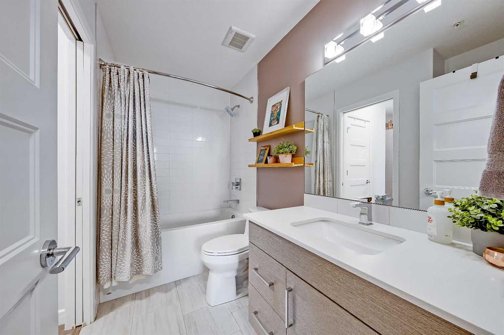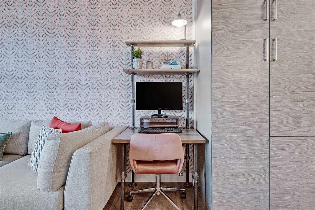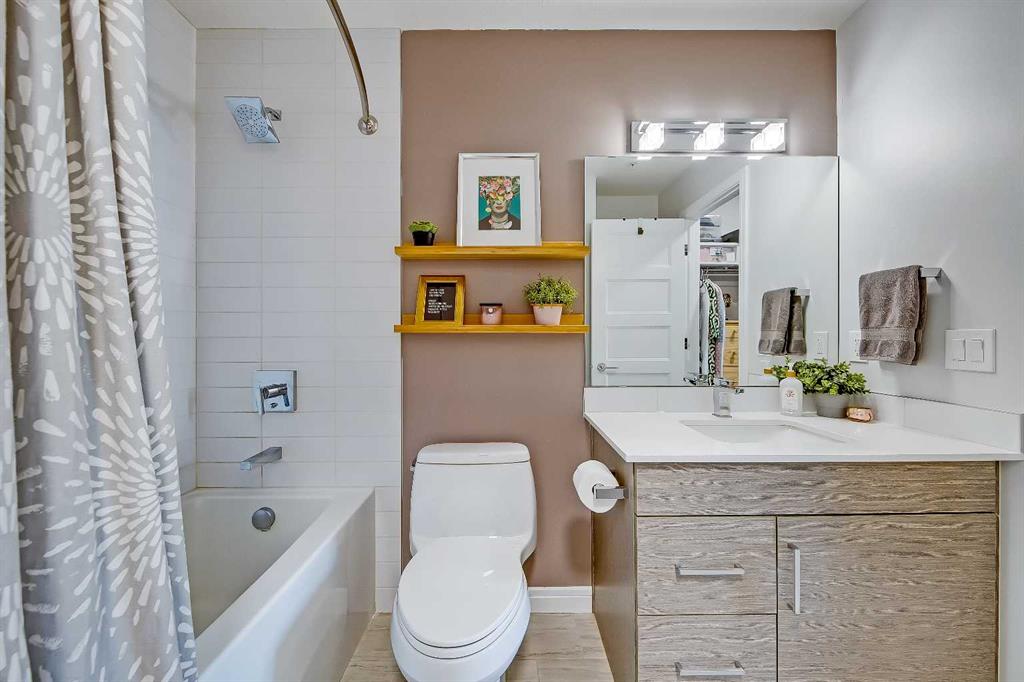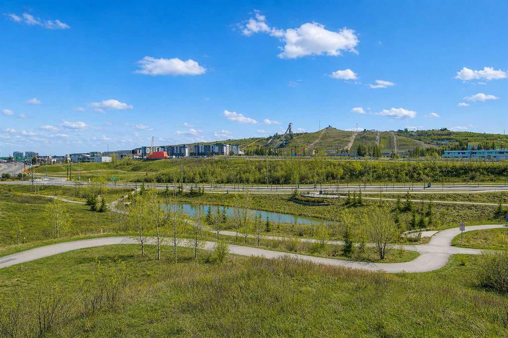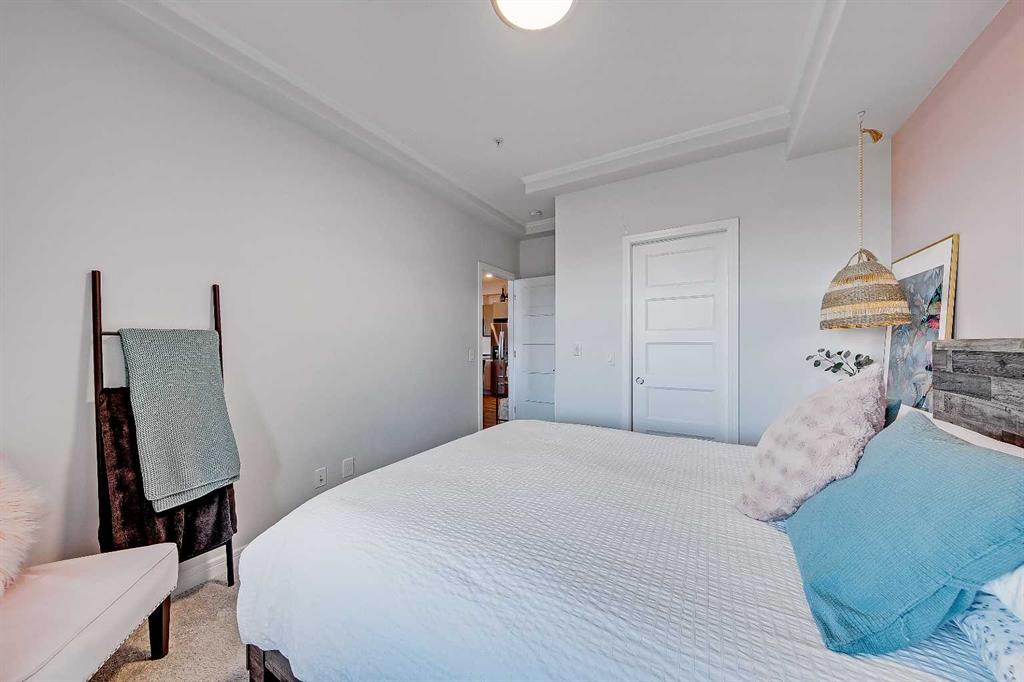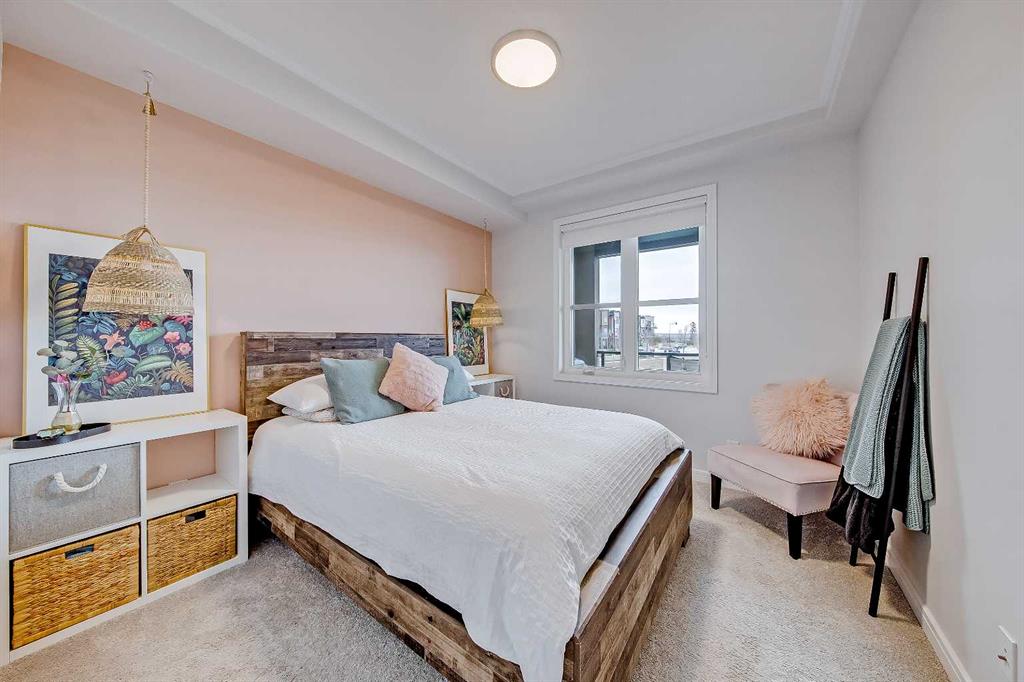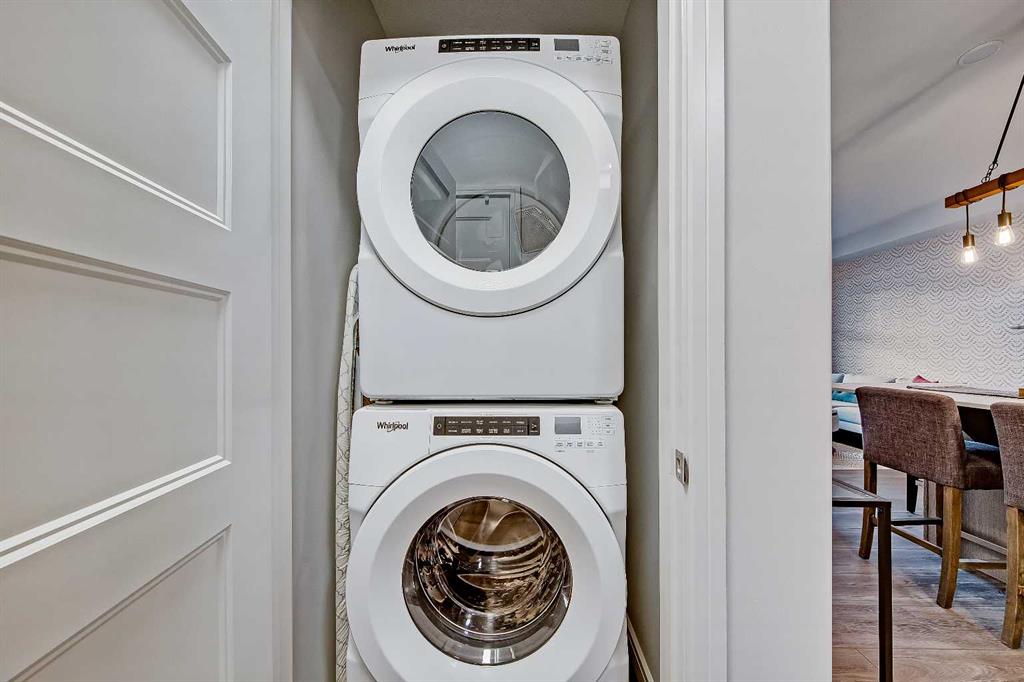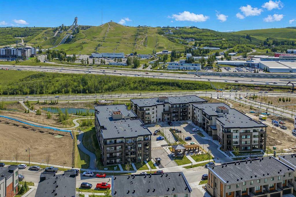 GORGEOUS 1 BEDROOM UNIT | IMMACULATE CONDITION | SAME FLOOR STORAGE LOCKER | UNDERGROUND PARKING Located in the emerging neighbourhood of Greenwich, this beautiful 1-bedroom apartment offers an exceptional blend of comfort, convenience and everyday lifestyle appeal. Planned as a live, work, shop and play urban village, this northwest hub is home to boutique shopping, coffee spots, restaurants and Calgary Farmers’ Market West, while also offering quick access to downtown, the mountains and nearby parks and trails. Impeccably kept and move-in ready, the home also includes a hard-to-find same-floor storage unit just down the hall, adding even more everyday functionality to an already appealing space. Inside, you will find a bright, open-concept layout that feels both polished and welcoming, with 9' ceilings, luxury vinyl plank flooring and large windows that bring in an abundance of natural light. The kitchen is especially impressive, featuring quartz countertops, a substantial centre island with breakfast bar seating, stainless steel appliances, sleek contemporary cabinetry and excellent storage throughout, while the rustic light fixture above the island adds a stylish focal point. The living room area offers a comfortable setting for day-to-day living, hosting friends or simply enjoying a quiet evening at home, with enough flexibility to accommodate a desk or small workspace. The feature wall in the living room adds texture and visual interest, giving the interior an upscale and thoughtfully finished feel. One of the standout features of the home is the massive covered east-facing balcony, complete with a BBQ gas line and the kind of usable outdoor space that is not often found in apartment living. The bedroom is well proportioned and paired with a large walkthrough closet, while the stylish 4-piece ensuite has full-height tile, modern finishes and the added convenience of access from both the bedroom and main living area. Added comforts such as in-floor heating, central air conditioning and in-unit laundry make the space feel complete. The lifestyle appeal continues beyond the unit itself with a thoughtful collection of building amenities designed for both comfort and convenience. Residents enjoy heated underground parking with an additional storage locker directly in front of the stall, secure bike storage, visitor parking and beautifully maintained outdoor spaces that make it easy to enjoy the setting. A gazebo, picnic areas and dedicated seating spaces create inviting places to relax, gather with friends or simply take in the surrounding views. Whether you are a first-time buyer, downsizer or investor looking for a beautifully maintained and easy-to-enjoy property, this home offers a polished, low-maintenance lifestyle in one of northwest Calgary’s most exciting emerging communities. Stylish, practical and exceptionally well kept, this is a wonderful opportunity to step into Greenwich and feel at home right away.