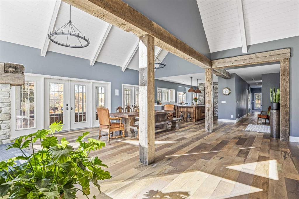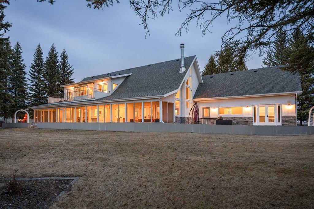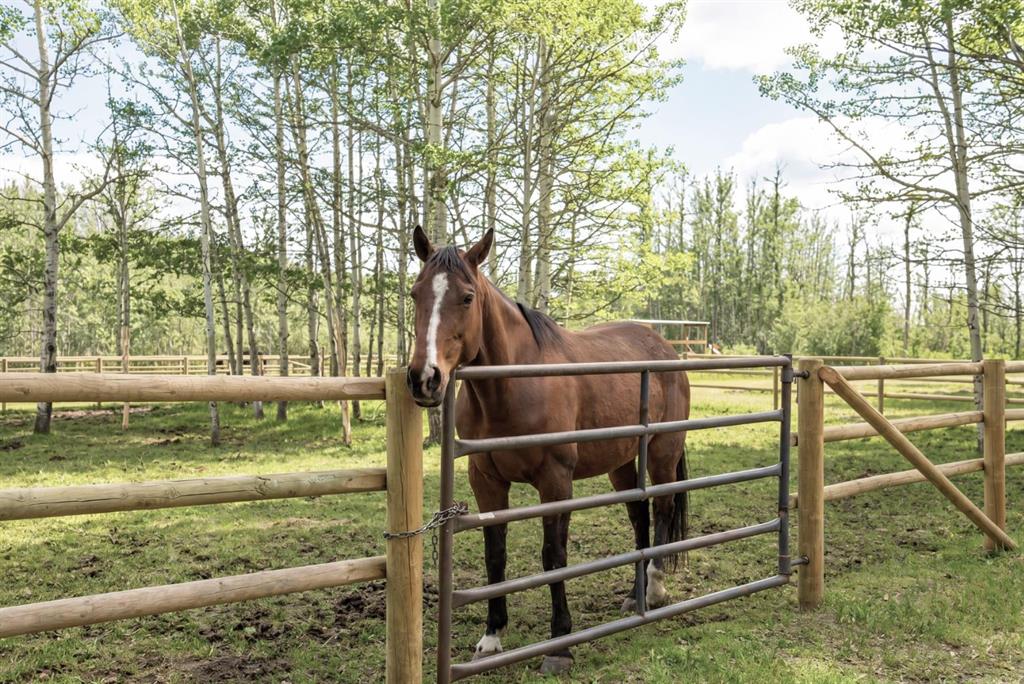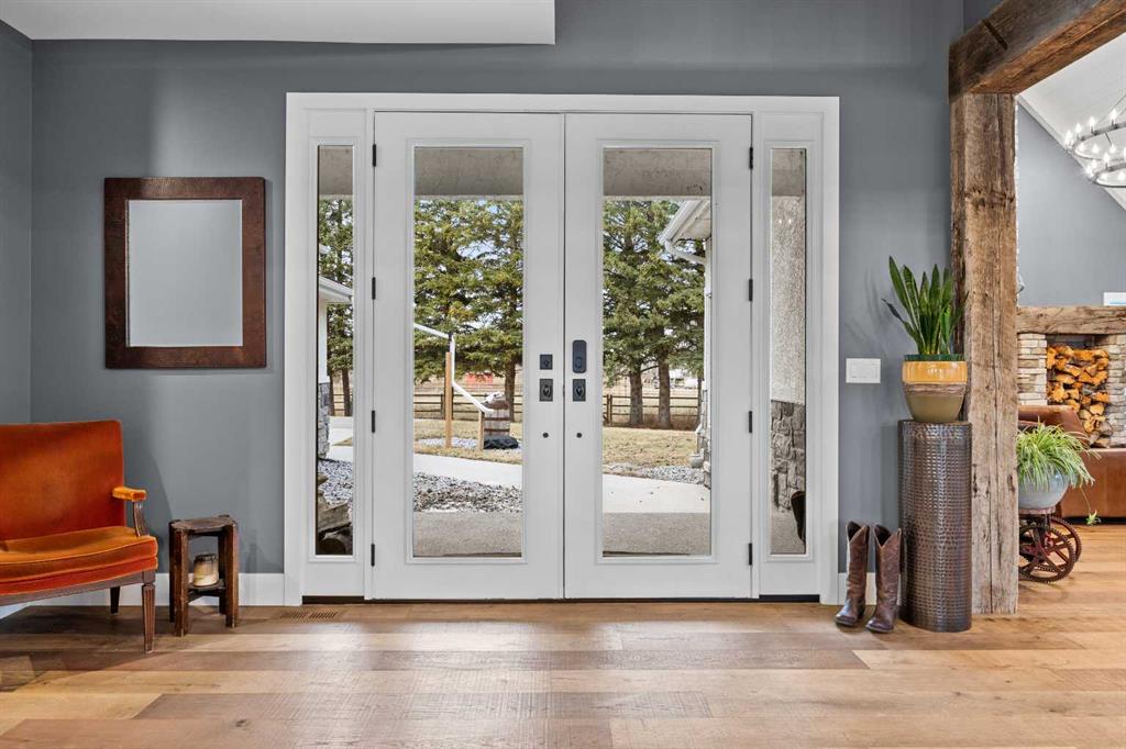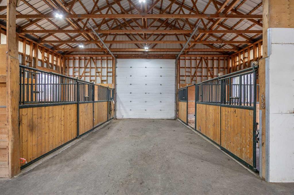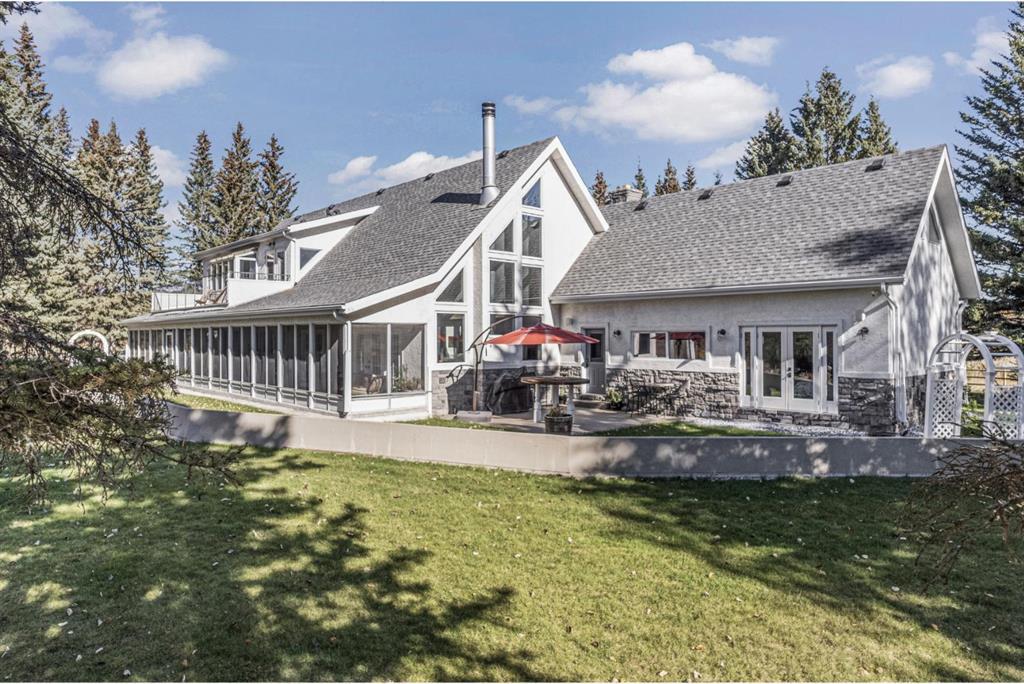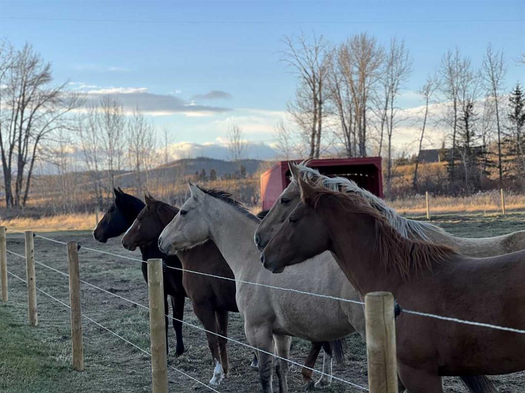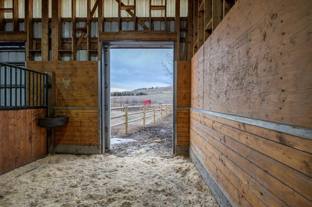 This exquisite home, extensively renovated in 2022, is situated on almost 22 acres of scenic, treed land with Three Point Creek beautifully flowing throughout the property. This sprawling home offers approximately 2,919 sq. ft. on the main level and an additional 1,440 sq. ft. on the upper level, with a total of five bedrooms and six bathrooms. The quality craftsmanship of this gorgeous modern farmhouse is evident from the moment you enter. Imported reclaimed wood beams complement the wide plank hardwood floors, vaulted white wood ceilings, and custom millwork. The open concept floor plan basks in natural light and features spacious areas for entertaining friends and family, with two wood burning fireplaces. Every culinary enthusiast’s dream, the incredible kitchen leaves nothing to be desired with 2 full size Bosch refrigerator/freezers, Dacor dual wall ovens, Dacor 6-burner gas range, Miele dishwasher, copper farmhouse sink and a large butler’s pantry with yet another full size Bosch refrigerator/freezer. Through the double doors to the South Wing is an impressive vaulted family room, full bathroom, wet bar, and 2 bedrooms. This space is perfect for multi-generational living. Completing the main floor is a quiet den with an elevator to the Primary Suite above, another full bathroom with shower off the mudroom, powder room, dry bar, main floor laundry and a spacious, screened back porch. On the upper level, the tranquil primary bedroom overlooks the creek with a private upper deck, and features a luxurious ensuite with claw foot tub, steam shower, dual vanities, and walk-in closet. Two additional bedrooms, one with ensuite bathroom with steam shower, another full bathroom with steam shower and second laundry room are also on this level. Other features of this home include built-in Sonos sound system (indoor & outdoor), elevator, Murphy bed, security cameras, two RO water filter systems, high speed internet & cell phone booster. This property is fully set up for equestrian or hobby farm use and is currently operating as a horse boarding facility, with easy access for trailers on paved roads. Features include a 5-stall, drive-through barn with waterers and attached paddocks. In fact, the property offers 10 large paddocks, round pen, outdoor riding arena, two large Quonsets (one fully insulated with spray foam and concrete floor), dog run (currently used as a goat run), and a fully insulated chicken coop with power. A separate well is at the barn also. Whether you are exploring the paths via horseback, wading in the creek, or living in the luxurious home, there are so many unique areas to enjoy. Conveniently located close to Millarville and a 20 minute drive to Calgary, you have the very best of living in nature coupled with easy access to all amenities.