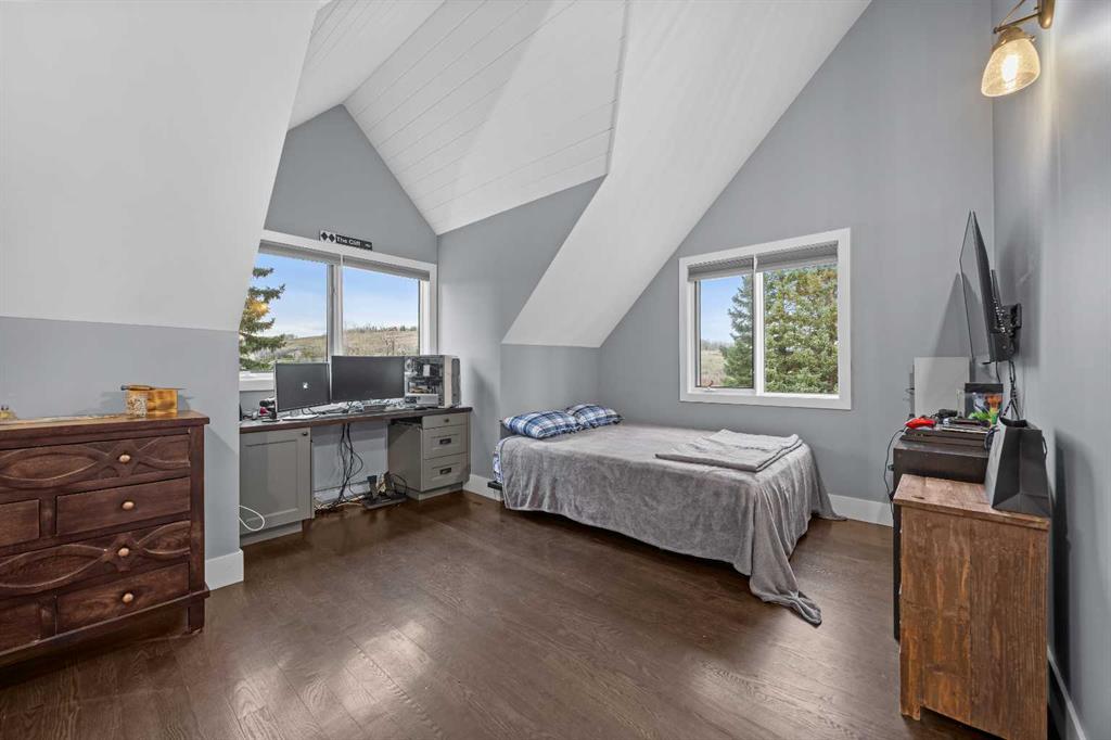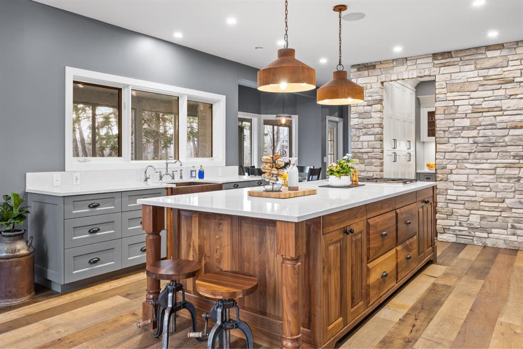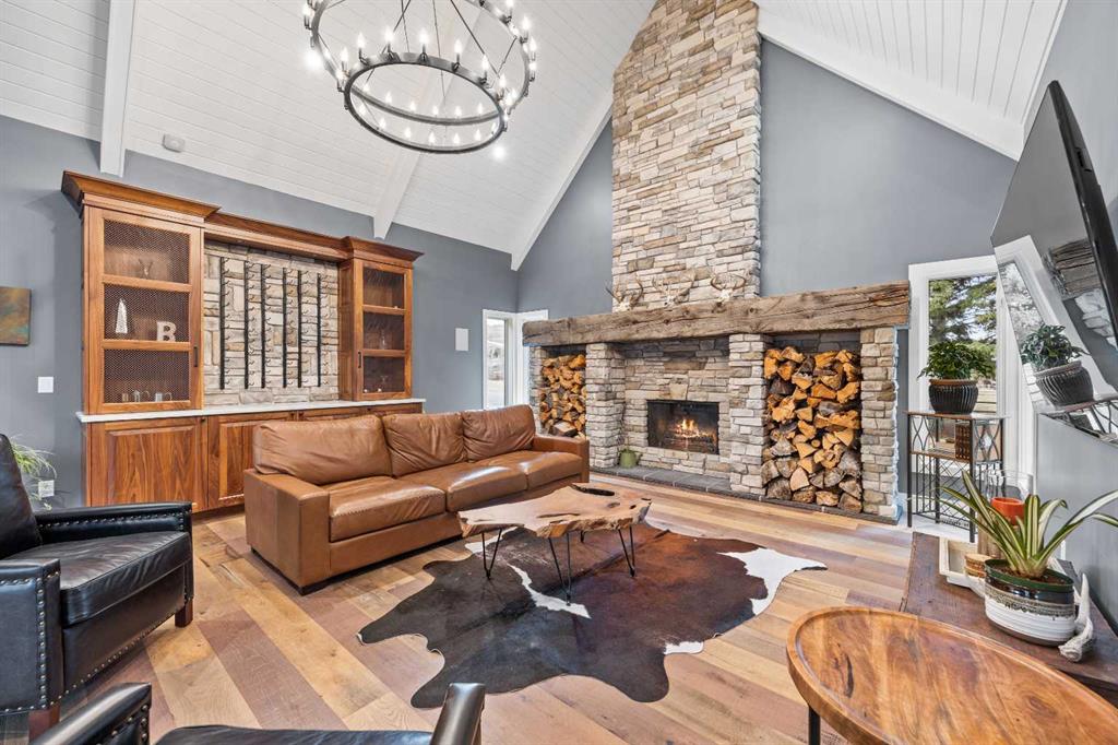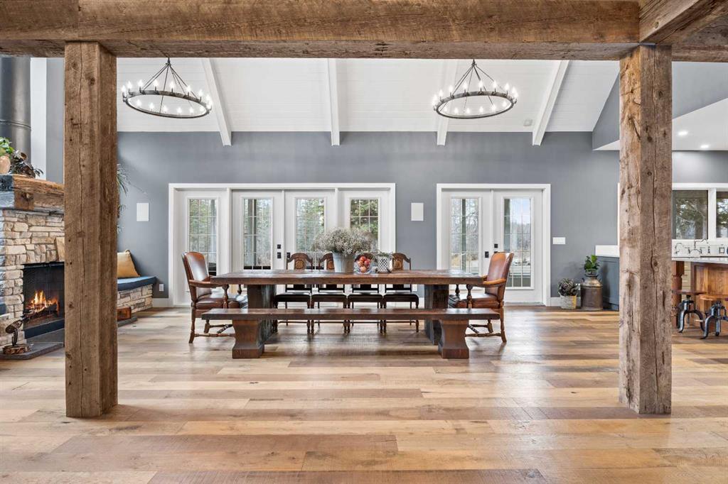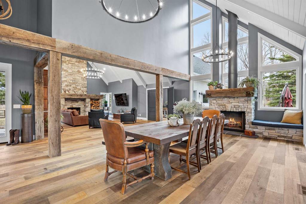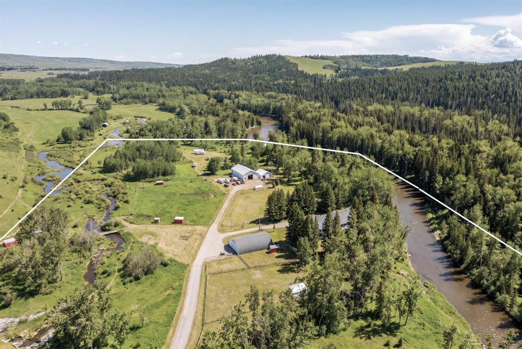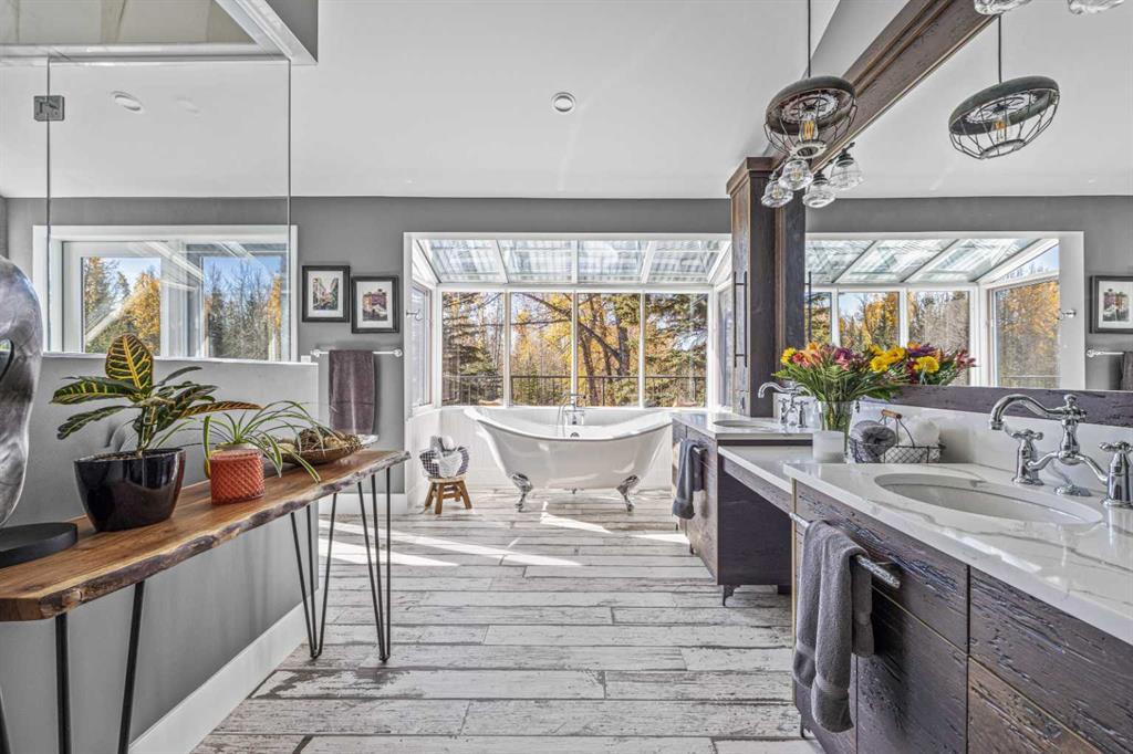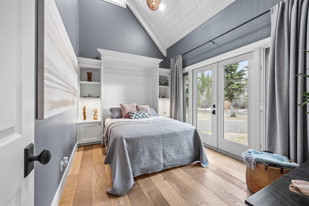 This exquisite home, extensively renovated in 2022, is situated on almost 22 acres of scenic, treed land with Three Point Creek beautifully flowing throughout the property. This sprawling home offers approximately 2,919 sq. ft. on the main level and an additional 1,440 sq. ft. on the upper level, with a total of five bedrooms and six bathrooms. The quality craftsmanship of this gorgeous modern farmhouse is evident from the moment you enter. Imported reclaimed wood beams complement the wide plank hardwood floors, vaulted white wood ceilings, and custom millwork. The open concept floor plan basks in natural light and features spacious areas for entertaining friends and family, with two wood burning fireplaces. Every culinary enthusiast’s dream, the incredible kitchen leaves nothing to be desired with 2 full size Bosch refrigerator/freezers, Dacor dual wall ovens, Dacor 6-burner gas range, Miele dishwasher, copper farmhouse sink and a large butler’s pantry with yet another full size Bosch refrigerator/freezer. Through the double doors to the South Wing is an impressive vaulted family room, full bathroom, wet bar, and 2 bedrooms. This space is perfect for multi-generational living. Completing the main floor is a quiet den with an elevator to the Primary Suite above, another full bathroom with shower off the mudroom, powder room, dry bar, main floor laundry and a spacious, screened back porch. On the upper level, the tranquil primary bedroom overlooks the creek with a private upper deck, and features a luxurious ensuite with claw foot tub, steam shower, dual vanities, and walk-in closet. Two additional bedrooms, one with ensuite bathroom with steam shower, another full bathroom with steam shower and second laundry room are also on this level. Other features of this home include built-in Sonos sound system (indoor & outdoor), elevator, Murphy bed, security cameras, two RO water filter systems, high speed internet & cell phone booster. This property is fully set up for equestrian or hobby farm use and is currently operating as a horse boarding facility, with easy access for trailers on paved roads. Features include a 5-stall, drive-through barn with waterers and attached paddocks. In fact, the property offers 10 large paddocks, round pen, outdoor riding arena, two large Quonsets (one fully insulated with spray foam and concrete floor), dog run (currently used as a goat run), and a fully insulated chicken coop with power. A separate well is at the barn also. Whether you are exploring the paths via horseback, wading in the creek, or living in the luxurious home, there are so many unique areas to enjoy. Conveniently located close to Millarville and a 20 minute drive to Calgary, you have the very best of living in nature coupled with easy access to all amenities.