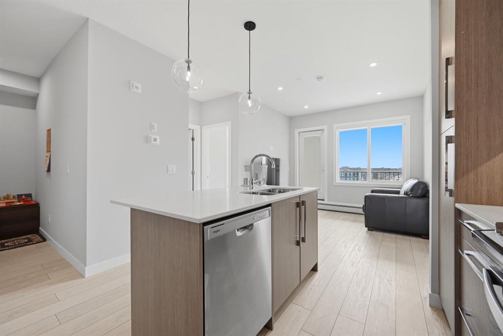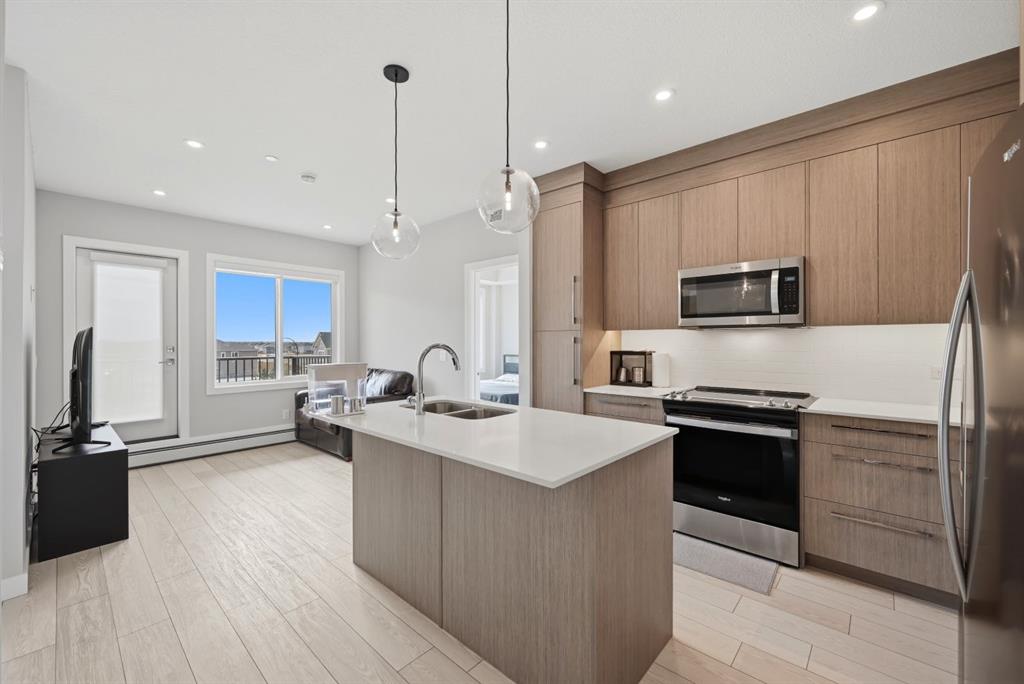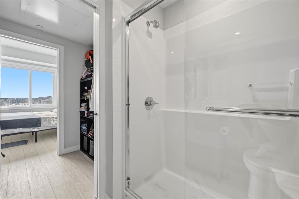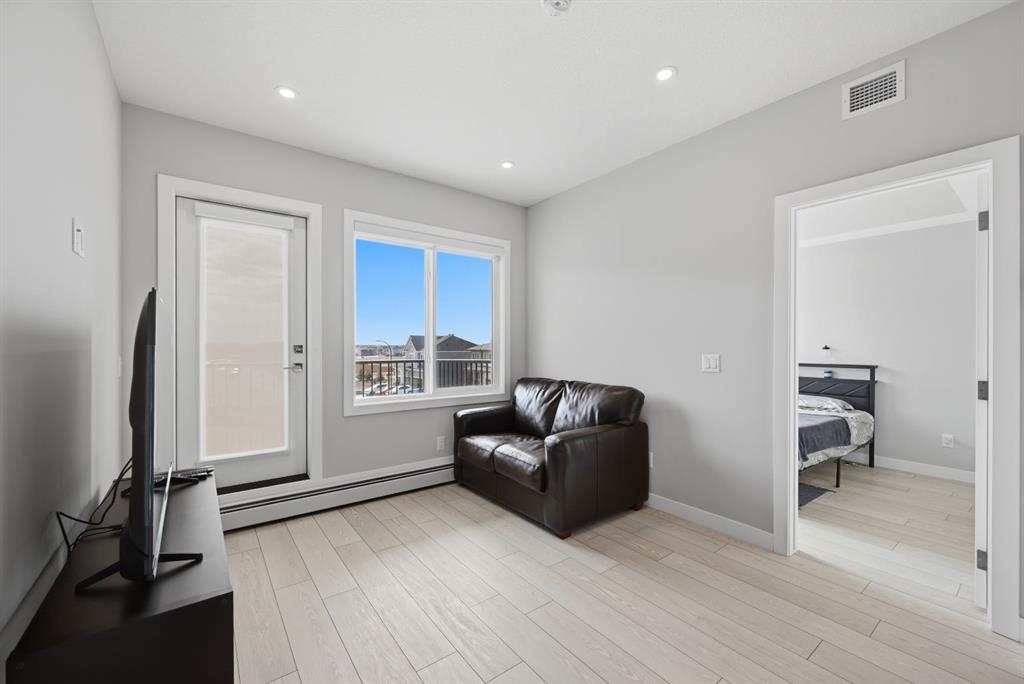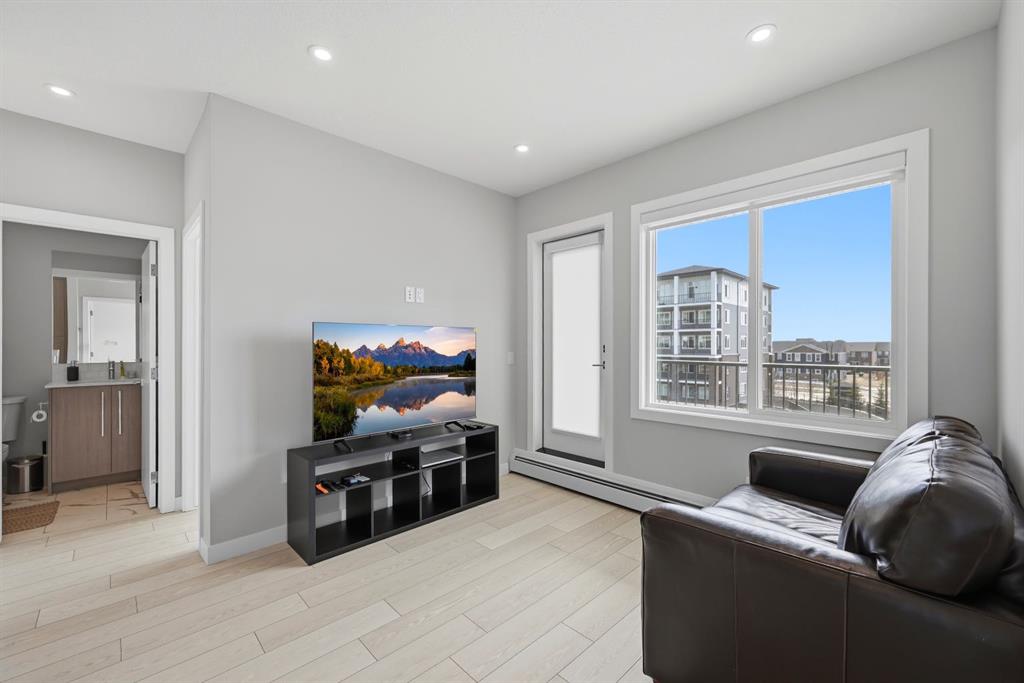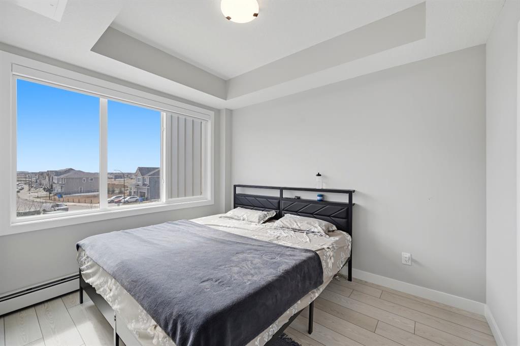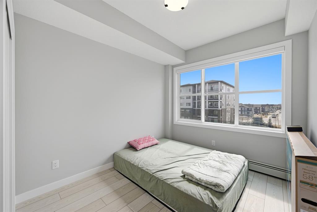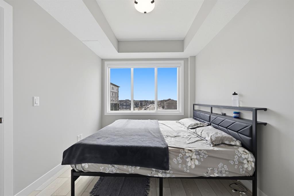 This bright 4th-floor corner unit offers 2 bedrooms, a dedicated office/flex space, 2 full bathrooms, and a south-facing balcony, all flooded with natural light through expansive windows. Elegant LVP flooring runs throughout the open-concept layout, where the contemporary kitchen with quartz counters flows into the living and dining area. The primary bedroom features a private 3-piece ensuite, while a generous second bedroom, 4-piece main bath, and in-suite laundry complete the functional floorplan. Residents enjoy access to a fitness centre and owner's lounge, with CrossIron Mills, Costco, YYC Airport, Stoney Trail, and Métis Trail all within a 15-minute drive of Cityscape, one of northeast Calgary's fastest-growing communities. A turn-key, tenant-occupied opportunity in a well-appointed building.
