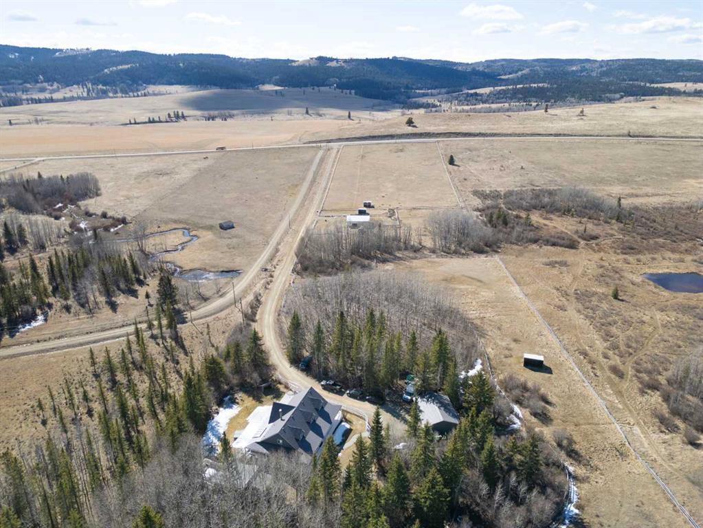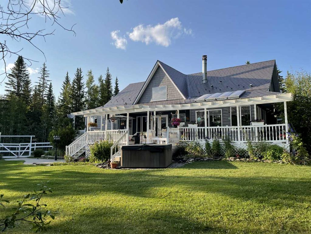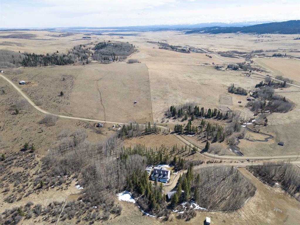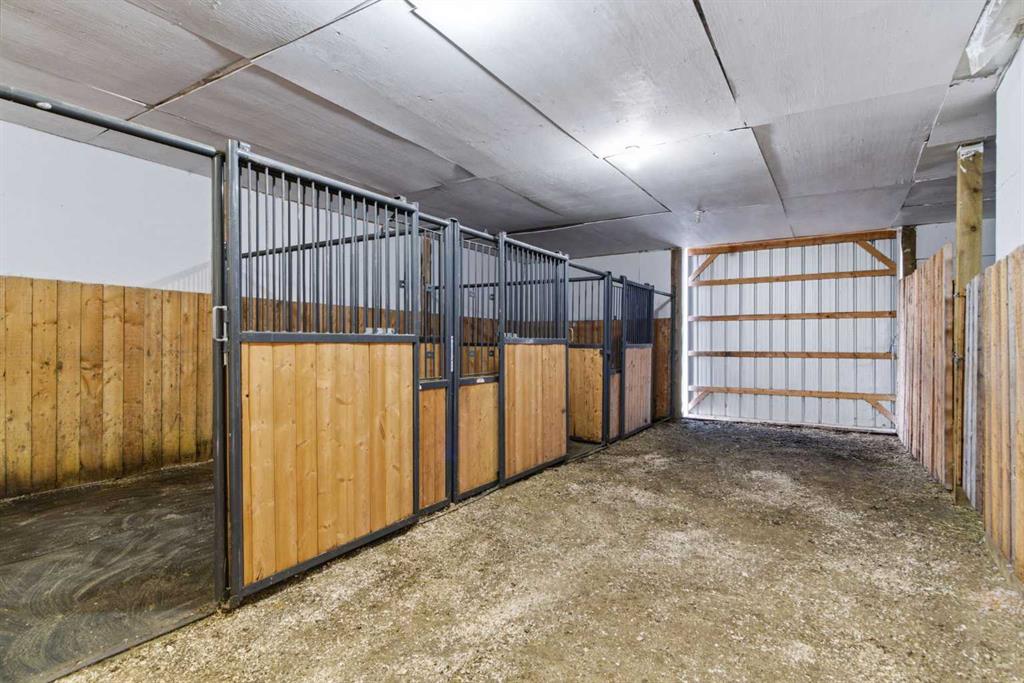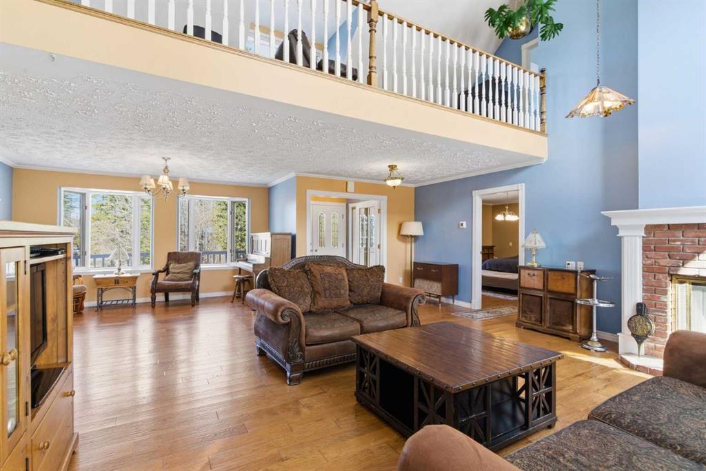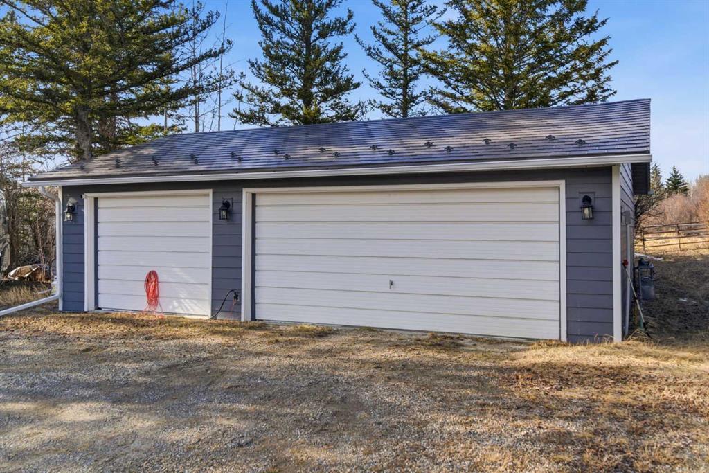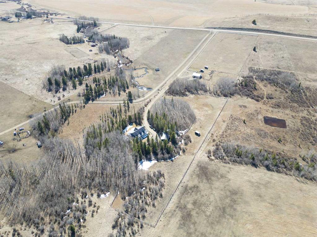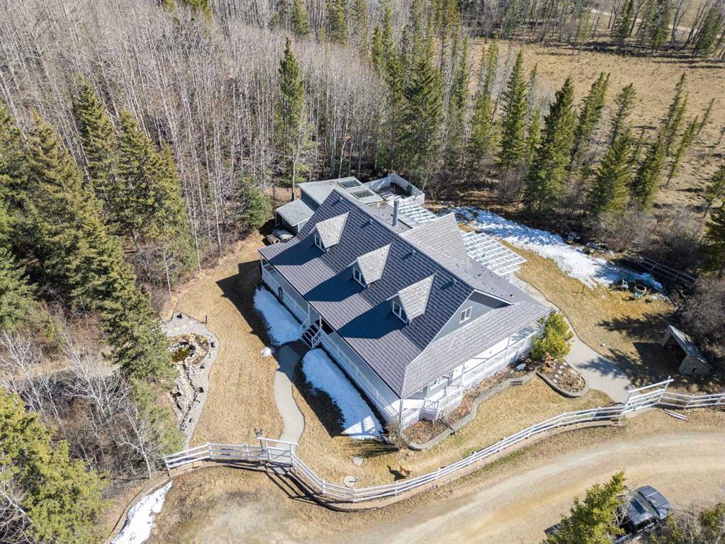 This beautiful Victorian style 1 & ½ storey home was built in 1989 and sits on 20 acres with trees & pasture land. It was updated in 2012 with interlocking metal roof (with transferable 50 year warranty) and Hardy board siding in 2022 on both the house and detached triple garage. The covered deck wraps around most of the house. The large fenced in yard (1 acre) is perfect for keeping young children and dogs close by. This fenced in yard includes a hot tub, pond, green house (c/w power & heat) & garden. The entrance features double French doors with a closet & ceramic tile flooring leading into the huge living room. This room boasts a vaulted ceiling, brick surround wood burning fireplace with mantle, a cozy alcove on the north side with 2 bay windows & picture windows & double doors leading to the deck on the south side. Off the living room is a bright inviting solarium with 4 skylights and a sliding glass door to the deck on the south side. On the west side of the house is an updated kitchen with cream cabinets, granite countertops, tile backsplash & a deep bay window over the double kitchen sink. There is a reverse osmosis system on the kitchen sink faucet. The appliances include a refrigerator, the oven & microwave are both built in, the dishwasher (new in 2025), the gas stove top with 4 burners & grill has a downdraft fan. Off the kitchen is a formal dining room with a bay window & built-in china cabinet. The laundry room presents upper cabinet storage, a pantry, laundry tub & washer and dryer (new in 2024). The spacious primary bedroom is on the main level with a linen closet & 5 piece ensuite. The ensuite has a double sink vanity with granite countertops, a free standing claw foot tub, large steam shower, plus both a storage & walk-in closet. The main level boasts stained Hickory hardwood floors, ceramic tile & Pergo laminate flooring. The upper level has 2 extensive bedroom with large closets c/w organizers. The bonus area has built-in shelving. A 3 piece bathroom completes this level. The flooring in natural stained Hickory hardwood & ceramic tile. The basement is insulated & drywalled. It is partially finished with a huge rec room area with built-in storage, dry bar & storage room. The workshop & utility rooms both include built-in shelving. The furnace & hot water tank were new Oct ’25. The 32’ x 24’ 3 car detached garage is insulated & drywalled. The double garage door has a remote opener. The 40’ x 30’ barn is insulated & plywood paneled with tack room, 3 full sized stalls, storage & utility room (c/w hot water tank & heater). The barn is on it’s own well. The panels & water troughs are included. Only 15 minutes from Cochrane on paved roads. A beautiful & serene property to call home.