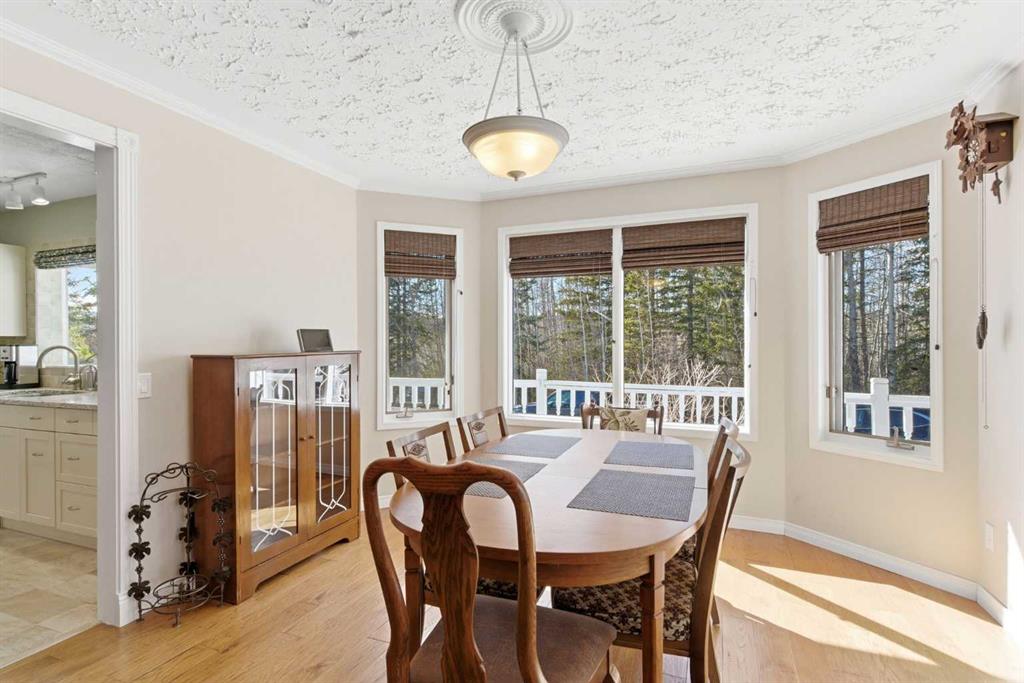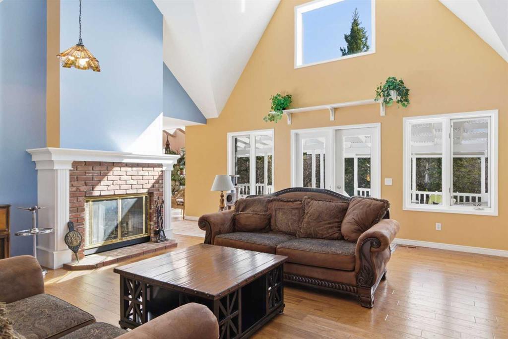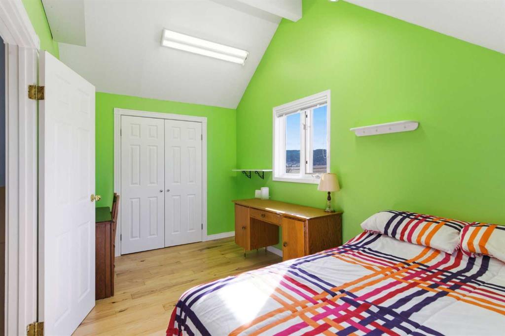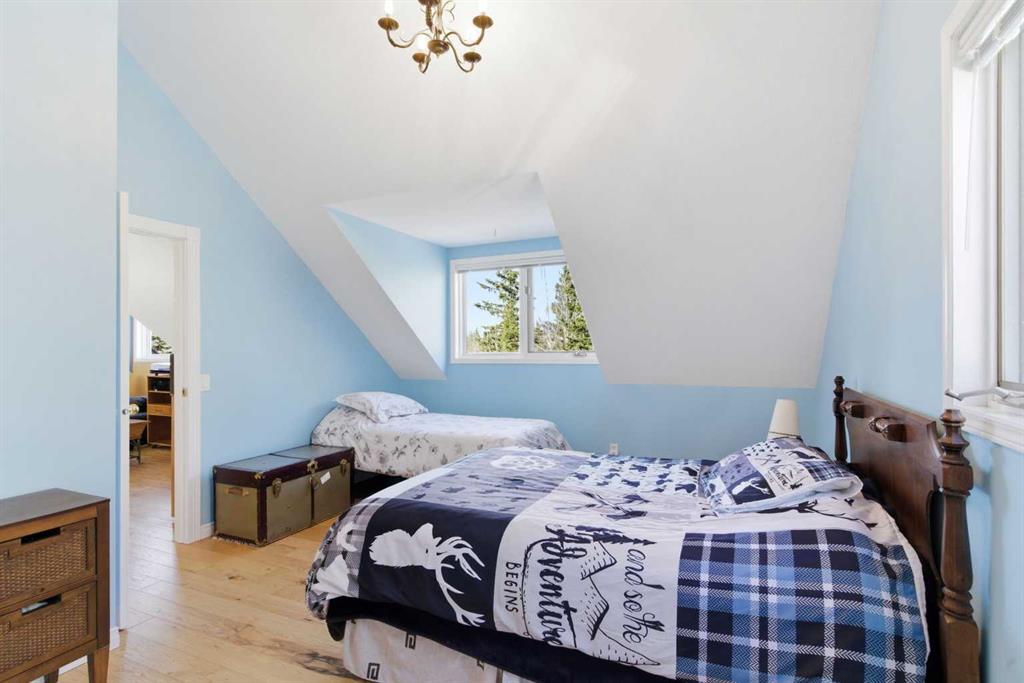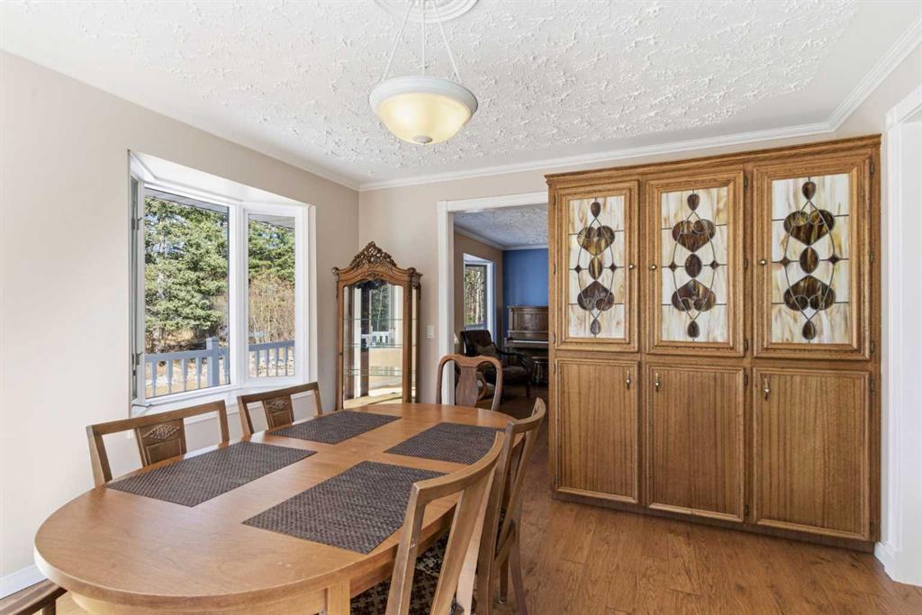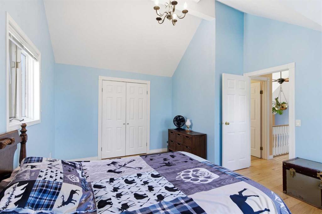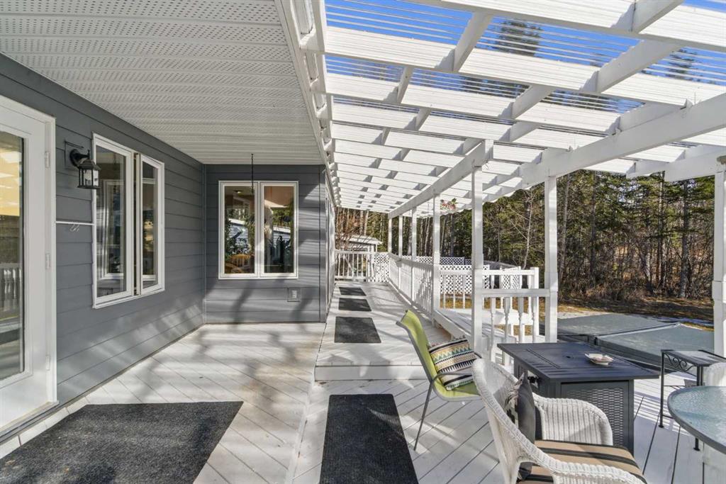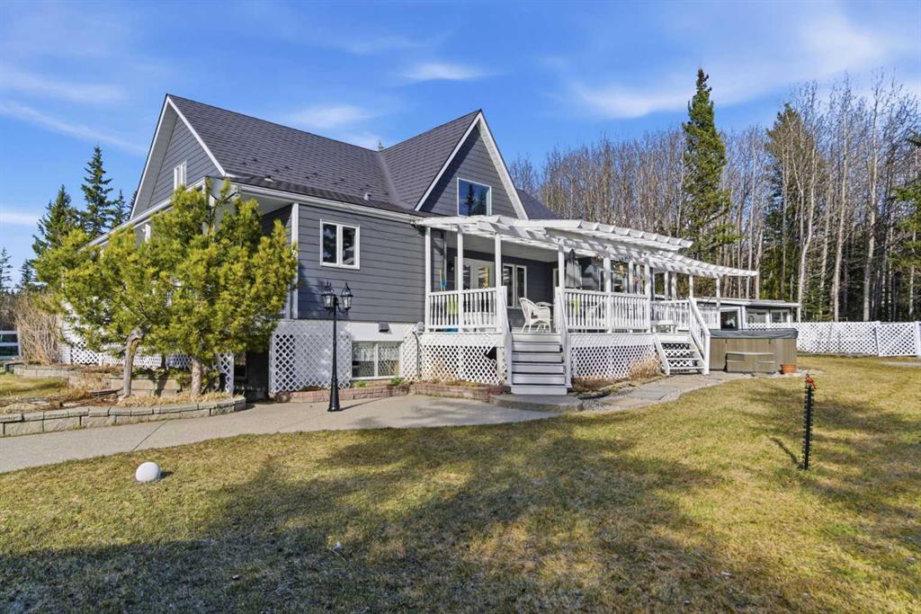 This beautiful Victorian style 1 & ½ storey home was built in 1989 and sits on 20 acres with trees & pasture land. It was updated in 2012 with interlocking metal roof (with transferable 50 year warranty) and Hardy board siding in 2022 on both the house and detached triple garage. The covered deck wraps around most of the house. The large fenced in yard (1 acre) is perfect for keeping young children and dogs close by. This fenced in yard includes a hot tub, pond, green house (c/w power & heat) & garden. The entrance features double French doors with a closet & ceramic tile flooring leading into the huge living room. This room boasts a vaulted ceiling, brick surround wood burning fireplace with mantle, a cozy alcove on the north side with 2 bay windows & picture windows & double doors leading to the deck on the south side. Off the living room is a bright inviting solarium with 4 skylights and a sliding glass door to the deck on the south side. On the west side of the house is an updated kitchen with cream cabinets, granite countertops, tile backsplash & a deep bay window over the double kitchen sink. There is a reverse osmosis system on the kitchen sink faucet. The appliances include a refrigerator, the oven & microwave are both built in, the dishwasher (new in 2025), the gas stove top with 4 burners & grill has a downdraft fan. Off the kitchen is a formal dining room with a bay window & built-in china cabinet. The laundry room presents upper cabinet storage, a pantry, laundry tub & washer and dryer (new in 2024). The spacious primary bedroom is on the main level with a linen closet & 5 piece ensuite. The ensuite has a double sink vanity with granite countertops, a free standing claw foot tub, large steam shower, plus both a storage & walk-in closet. The main level boasts stained Hickory hardwood floors, ceramic tile & Pergo laminate flooring. The upper level has 2 extensive bedroom with large closets c/w organizers. The bonus area has built-in shelving. A 3 piece bathroom completes this level. The flooring in natural stained Hickory hardwood & ceramic tile. The basement is insulated & drywalled. It is partially finished with a huge rec room area with built-in storage, dry bar & storage room. The workshop & utility rooms both include built-in shelving. The furnace & hot water tank were new Oct ’25. The 32’ x 24’ 3 car detached garage is insulated & drywalled. The double garage door has a remote opener. The 40’ x 30’ barn is insulated & plywood paneled with tack room, 3 full sized stalls, storage & utility room (c/w hot water tank & heater). The barn is on it’s own well. The panels & water troughs are included. Only 15 minutes from Cochrane on paved roads. A beautiful & serene property to call home.