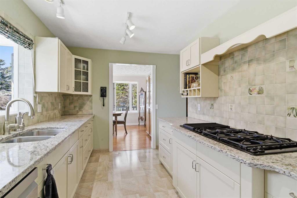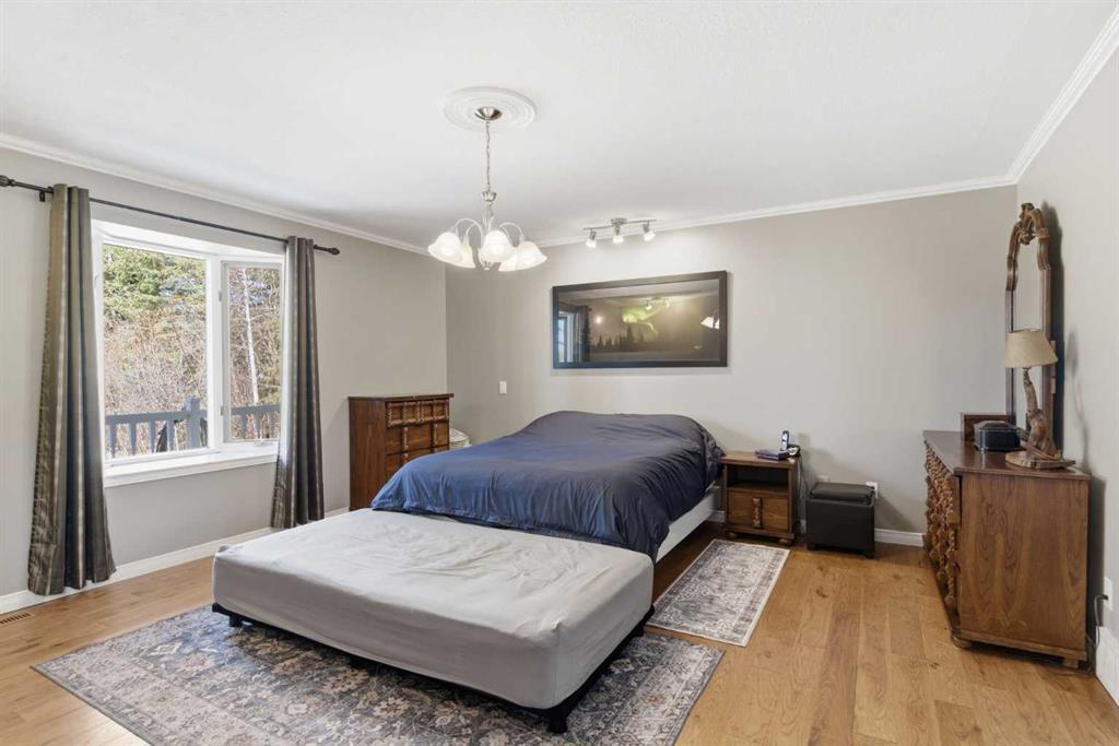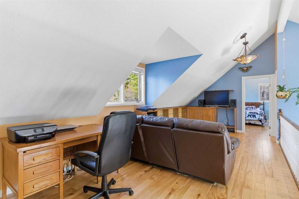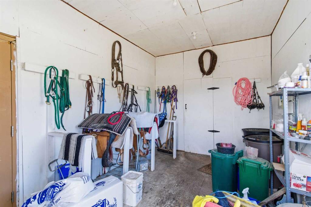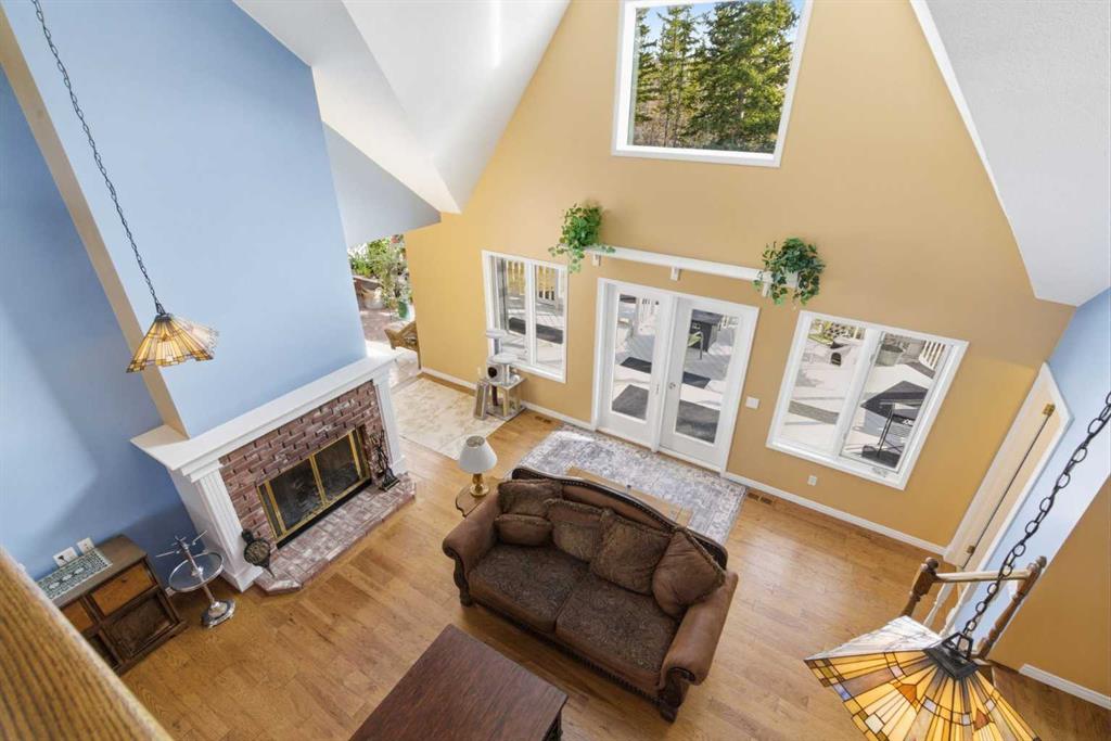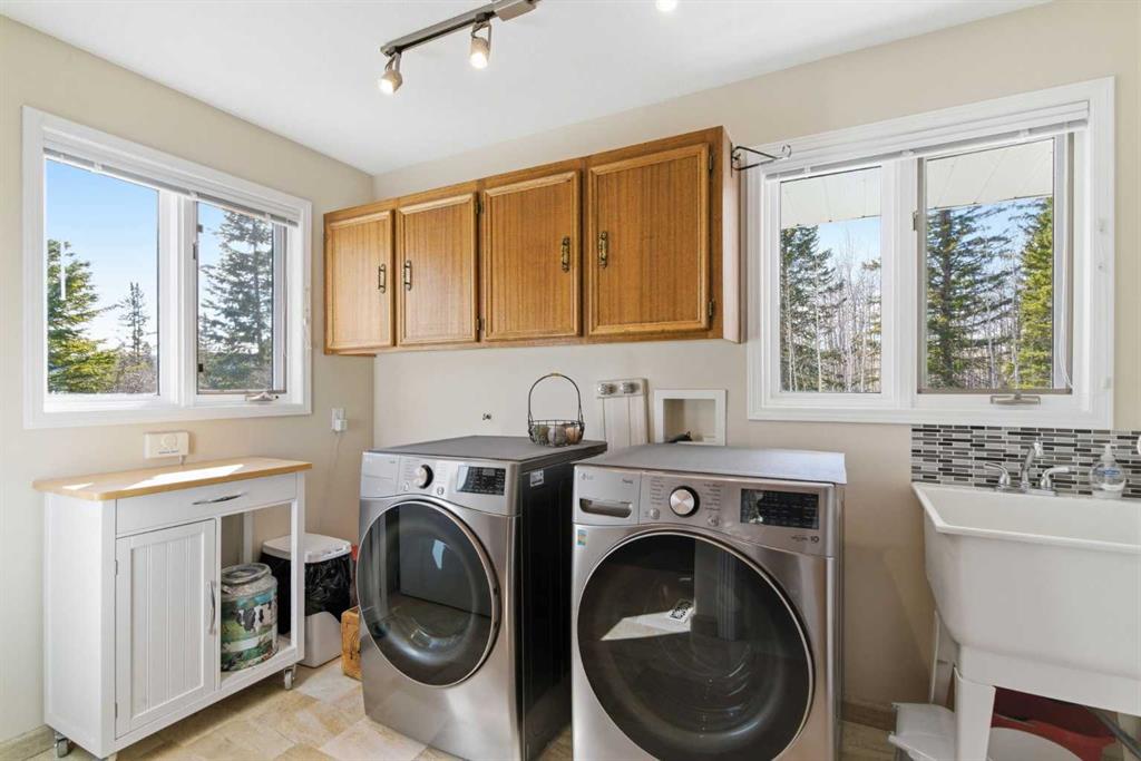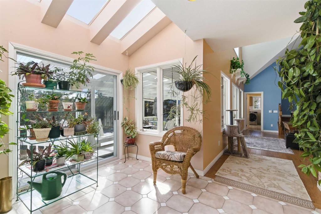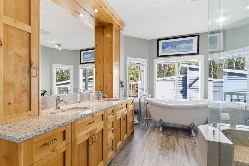 This beautiful Victorian style 1 & ½ storey home was built in 1989 and sits on 20 acres with trees & pasture land. It was updated in 2012 with interlocking metal roof (with transferable 50 year warranty) and Hardy board siding in 2022 on both the house and detached triple garage. The covered deck wraps around most of the house. The large fenced in yard (1 acre) is perfect for keeping young children and dogs close by. This fenced in yard includes a hot tub, pond, green house (c/w power & heat) & garden. The entrance features double French doors with a closet & ceramic tile flooring leading into the huge living room. This room boasts a vaulted ceiling, brick surround wood burning fireplace with mantle, a cozy alcove on the north side with 2 bay windows & picture windows & double doors leading to the deck on the south side. Off the living room is a bright inviting solarium with 4 skylights and a sliding glass door to the deck on the south side. On the west side of the house is an updated kitchen with cream cabinets, granite countertops, tile backsplash & a deep bay window over the double kitchen sink. There is a reverse osmosis system on the kitchen sink faucet. The appliances include a refrigerator, the oven & microwave are both built in, the dishwasher (new in 2025), the gas stove top with 4 burners & grill has a downdraft fan. Off the kitchen is a formal dining room with a bay window & built-in china cabinet. The laundry room presents upper cabinet storage, a pantry, laundry tub & washer and dryer (new in 2024). The spacious primary bedroom is on the main level with a linen closet & 5 piece ensuite. The ensuite has a double sink vanity with granite countertops, a free standing claw foot tub, large steam shower, plus both a storage & walk-in closet. The main level boasts stained Hickory hardwood floors, ceramic tile & Pergo laminate flooring. The upper level has 2 extensive bedroom with large closets c/w organizers. The bonus area has built-in shelving. A 3 piece bathroom completes this level. The flooring in natural stained Hickory hardwood & ceramic tile. The basement is insulated & drywalled. It is partially finished with a huge rec room area with built-in storage, dry bar & storage room. The workshop & utility rooms both include built-in shelving. The furnace & hot water tank were new Oct ’25. The 32’ x 24’ 3 car detached garage is insulated & drywalled. The double garage door has a remote opener. The 40’ x 30’ barn is insulated & plywood paneled with tack room, 3 full sized stalls, storage & utility room (c/w hot water tank & heater). The barn is on it’s own well. The panels & water troughs are included. Only 15 minutes from Cochrane on paved roads. A beautiful & serene property to call home.