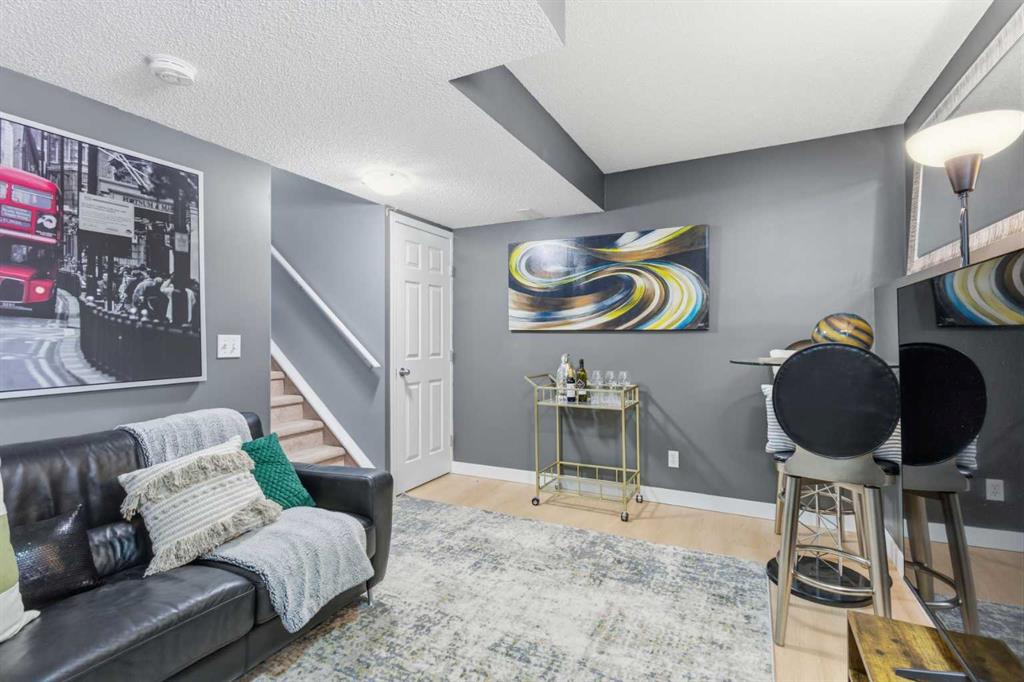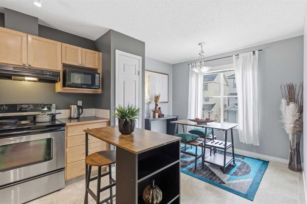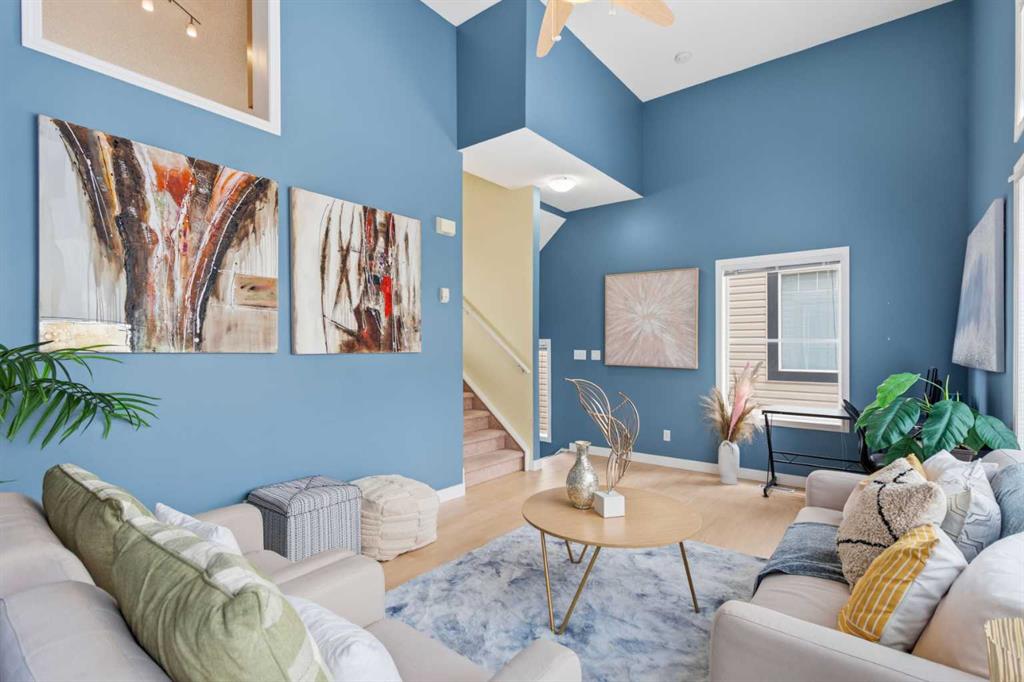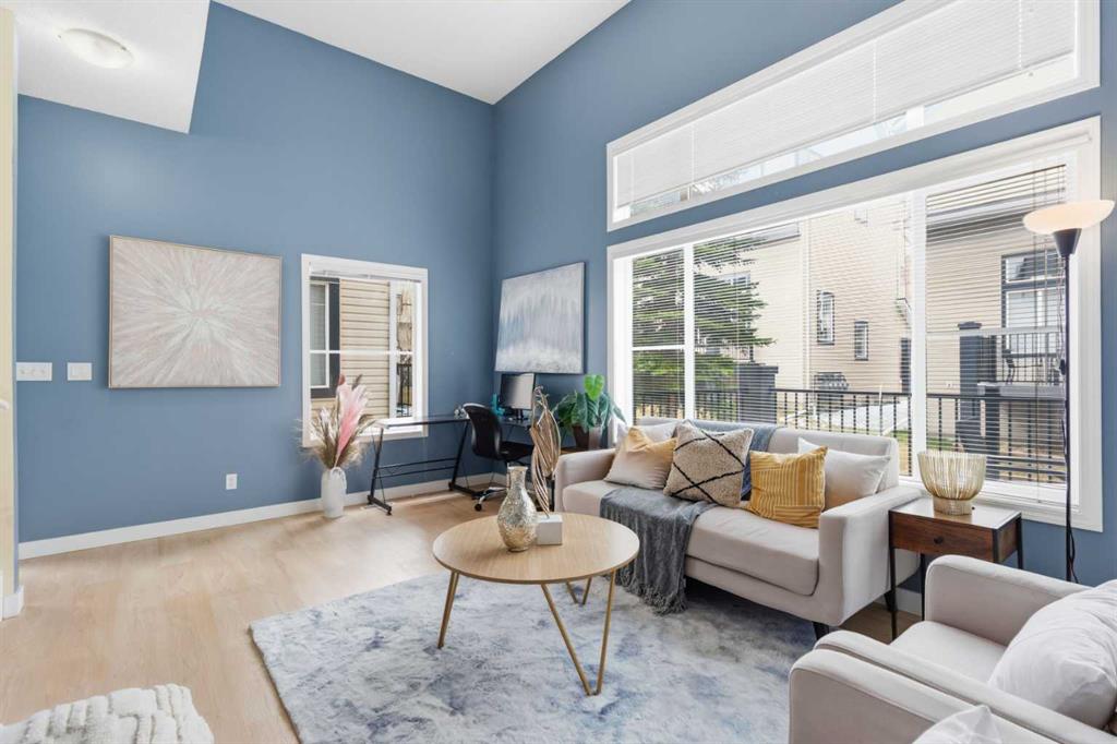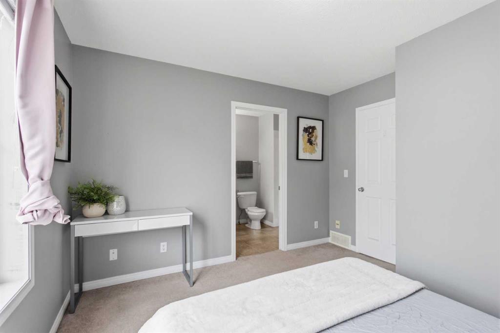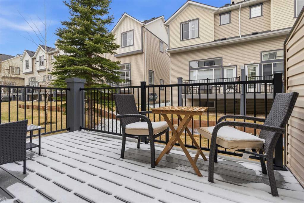 Beautiful sunny end-unit townhome located steps from Fish Creek Park. This low-maintenance townhouse backs onto a green space and features a private deck. The oversized living room offers 14-ft ceilings and tall windows for excellent natural light. Spacious kitchen with maple cabinets, upgraded laminate flooring, black appliances, and a bright breakfast nook. The home includes two primary suites, each with large closets and private ensuites. The lower-level flex space is ideal for a family room, office, gym, or playroom. Attached single garage plus driveway parking. Small pets allowed. Easy access in and out of the complex.