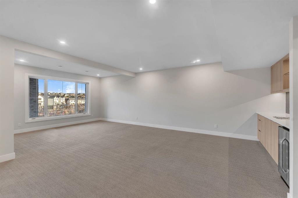 Welcome to 28 Spring Creek Point SW a true statement home in prestigious Springbank Hill, offering luxury living on a rare pond-front lot in Calgary. With over $200,000 in upgrades, this masterpiece was built for those who appreciate quality, design, and presence. From the moment you arrive, the striking Farmhouse exterior makes an impression, blending acrylic stucco and stone for timeless curb appeal. Inside, the home is centered around a showstopping Super Kitchen a space designed to host, gather, and impress featuring an oversized island with a dramatic 3CM waterfall granite edge, thick quartz counters, a professional 30" gas cooktop, and integrated wall oven. The main level also offers a private office, perfect for working from home, a stylish powder room, and a warm, inviting living room anchored by a grand 74" electric fireplace. Step outside to the expansive deck with a built-in BBQ gas line, ideal for entertaining while overlooking the pond. Upstairs, the primary retreat delivers a true spa experience, complete with a Maax Jazz freestanding tub and a curbless tiled shower with sleek 10MM glass. A versatile loft adds additional living space for relaxation or creativity. The fully developed walk-out basement features 9-foot ceilings, a spacious recreation area, custom wet bar, additional bedroom, and a modern bathroom all opening to your private outdoor setting. Designed for comfort and long-term performance, the home includes Black Fusion windows, 8-foot interior doors, upgraded HVAC with A/C, EV charger rough-in, and a 200-amp electrical service. This is a home where upgrades, design, and location come together seamlessly offering a level of finish and lifestyle rarely available. Book your private showing and experience it for yourself.