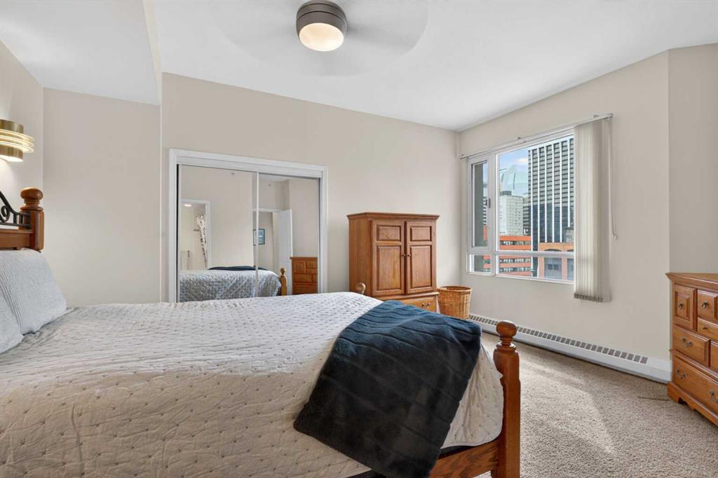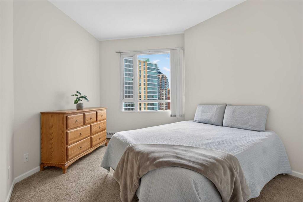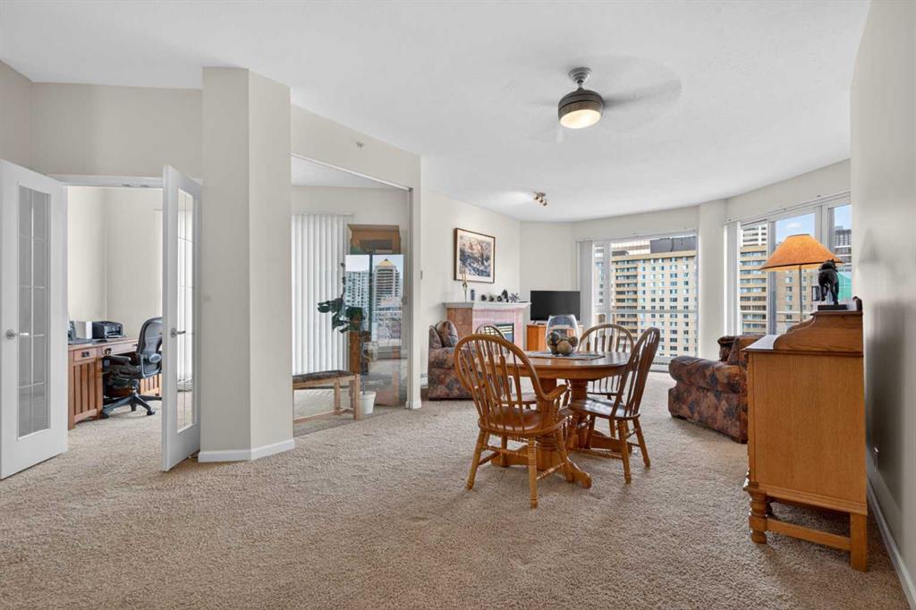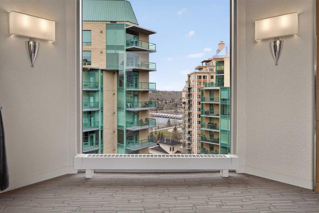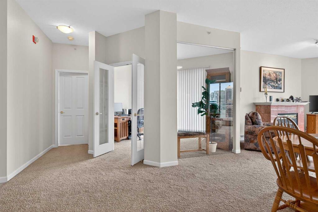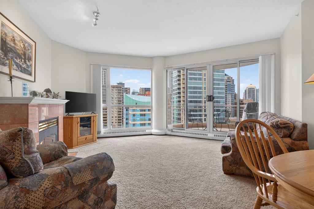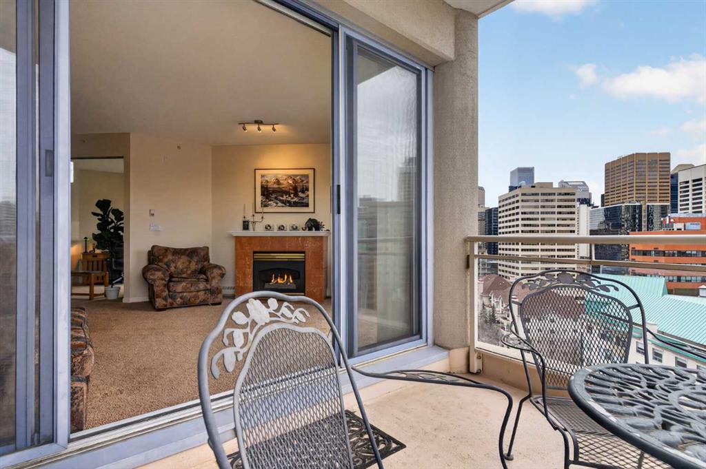 Experience elevated urban living in this spacious 1,220 sq. ft. apartment perched on the 14th floor, offering west facing views and abundant natural light through impressive 10-foot ceilings. This thoughtfully designed 2-bedroom layout features a generous primary suite complete with a 4-piece ensuite and private balcony, along with a versatile den—perfect for a home office or creative space. The bright , spacious living room is anchored by a cozy fireplace and opens onto one of two private patios ; ideal for relaxing or entertaining. This second patio extends your outdoor living options even further. Residents enjoy access to exceptional amenities including a well-appointed fitness center, stylish event room, and a tennis court. Located in a vibrant downtown community of Eau Claire, you’re just steps from scenic Bow River, bike/ walking paths, trendy restaurants, and all the energy of city living. A perfect blend of comfort, style, and convenience—this is urban living at its finest.