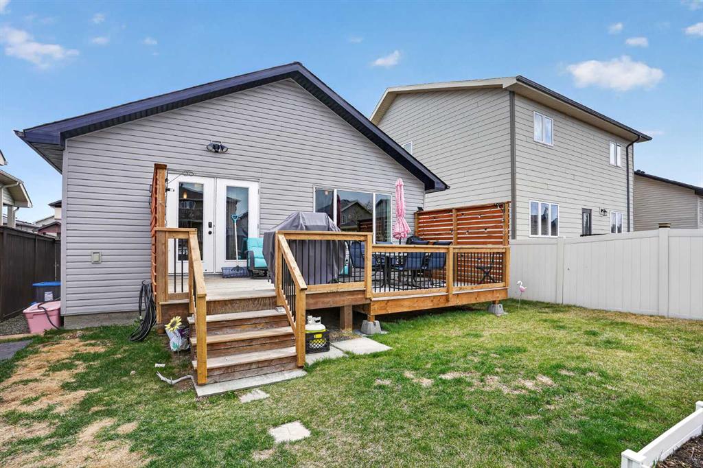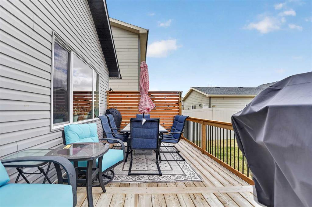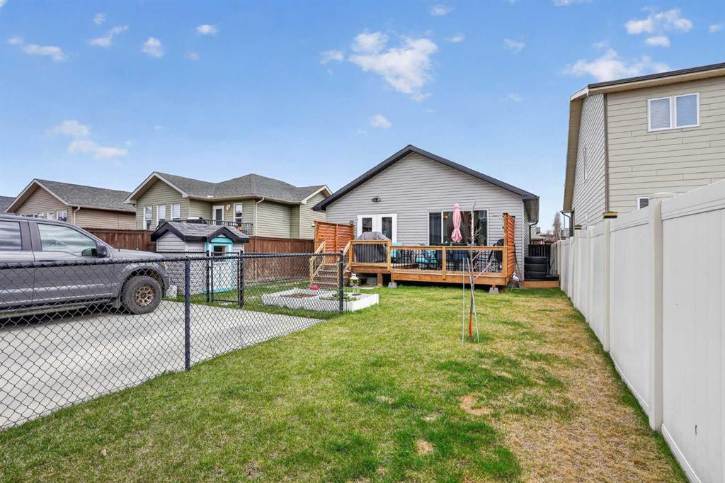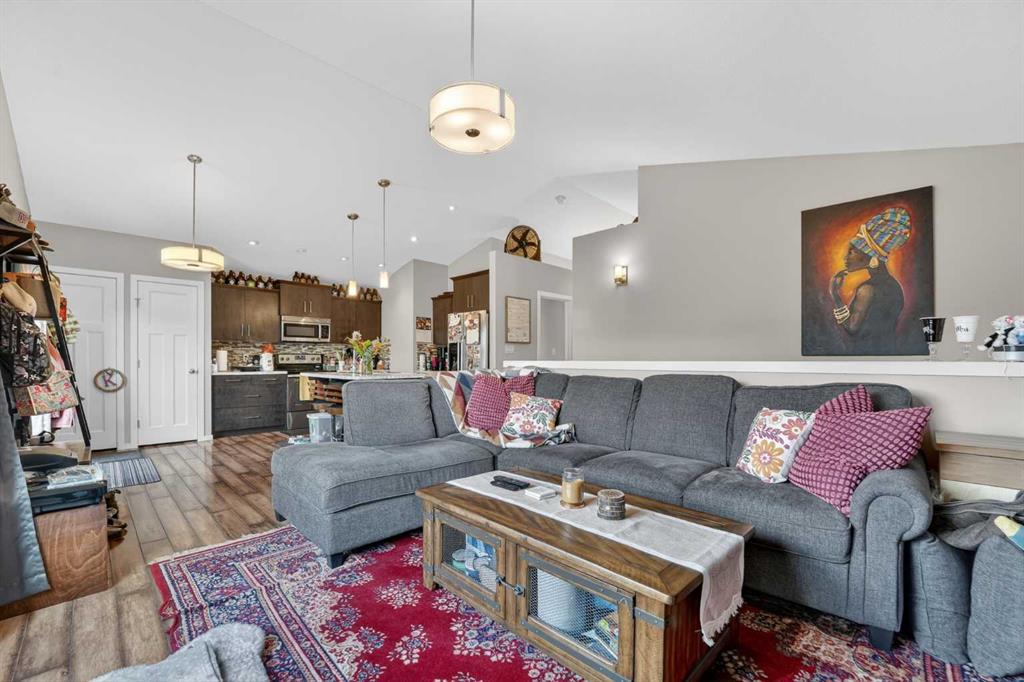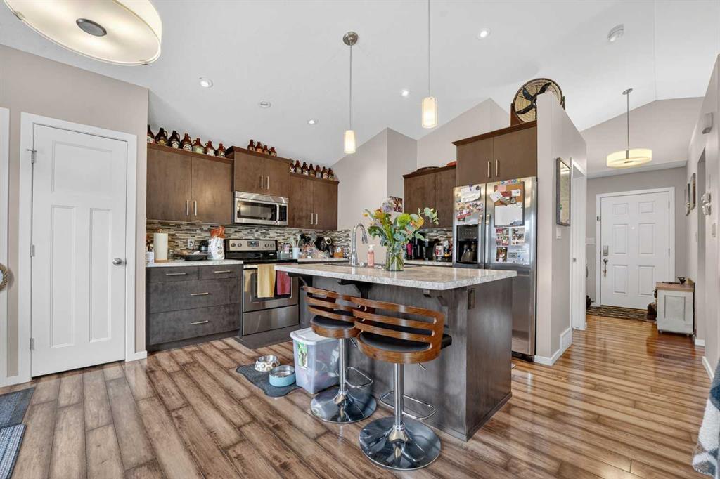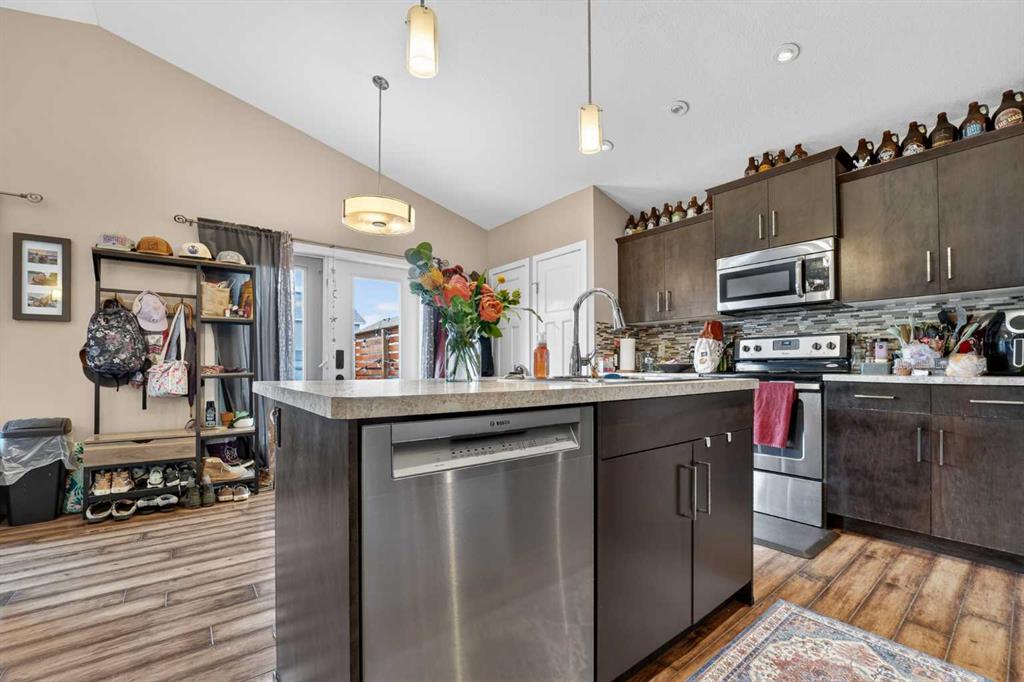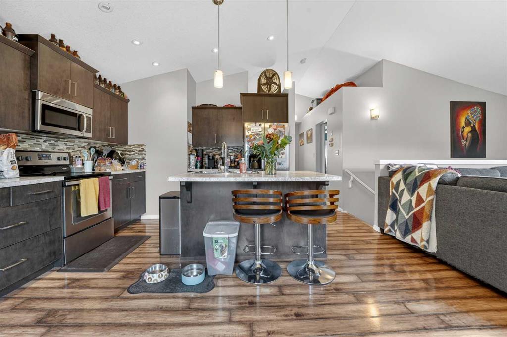Located in the community of Sunridge on the west side of Lethbridge, close to Popson Park, walking paths, ponds, schools, and nearby amenities, this fully developed bungalow offers a functional layout in a convenient location with quick access to the University of Lethbridge. The main floor features a bright and open design where the kitchen, dining, and living room all connect, highlighted by tall vaulted ceilings that help create a spacious feel. Large windows along the back bring in plenty of natural light and provide views of the backyard. The corner kitchen includes dark wood cabinetry, stainless steel appliances, an island with bar seating, and a nearby pantry for added storage. The dining area offers direct access to the backyard, while the adjacent living room provides a comfortable space to relax while still being connected to the rest of the home. Two bedrooms are located on the main floor, including a well sized primary bedroom with Jack and Jill access to a full four piece bathroom. The fully developed basement adds additional living space with a large recreation area, two more bedrooms, and another full four piece bathroom, providing flexibility for families or guests. Outside, the backyard features an oversized deck and a good sized yard with space for kids or pets. A rear parking pad offers off street parking and the potential to build a garage if desired. Situated in a well established west side neighbourhood with easy access to parks and amenities, this property offers a comfortable and practical option for buyers looking for a fully developed home.