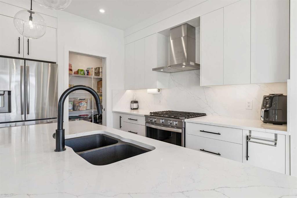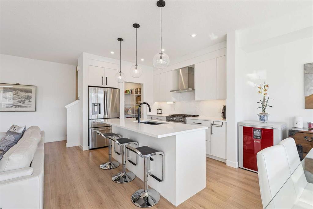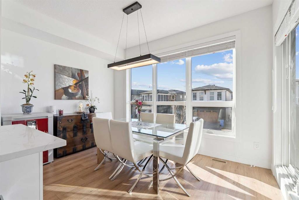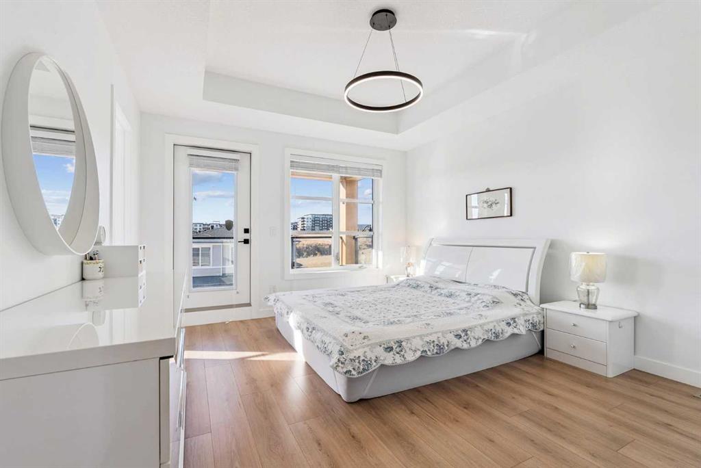 *** OPEN HOUSE May 2 SAT 1:30pm-3:30pm & May 3 SUN 2:00pm-4:00pm. Absolutely the lowest price ever! Priced for a quick sale! This END UNIT luxury townhouse with over 2,400 sqft living space offers total 4 bedrooms, 3.5 bathrooms with fully developed walk-out basement, plus heated double (side-by-side) attached garage. The ARCOLA by Truman, a contemporary community, is more than just a typical townhouse, but it is a luxury lifestyle home where you can enjoy convenience without compromising its style and square footage. As you enter the home, the gorgeous tiled foyer welcomes you with an open-concept, 9ft ceiling, and designer finishes. Luxury vinyl plank flooring throughout all three levels, and no more ugly carpet here. The spacious living room is filled with natural light and provides ample space for relaxing and entertaining. The kitchen is showcasing quartz countertops, premium stainless steel appliances pkg, including a T-shaped chimney and gas stove, generous cabinetry, a spacious corner pantry, and a large central island with a breakfast nook. The dining area is surrounded by loads of windows, and a powder room completes the main level. Off to the balcony for morning coffee with your favorite books or alfresco lunch or evening wines. Upstairs, retreat to a spacious primary bedroom featuring a walk-in closet and a spa-inspired 5-piece ensuite with dual sinks and a deep soaker tub on a gorgeous tiled floor. Step out to a dedicated balcony from your bedroom to enjoy the mountain view and fresh breeze. Two more bedrooms are big enough for kids or adults, each with its own walk-in closet, and sharing a 4pc bathroom. There is a convenient upper-level laundry room with shelves. Fully developed WALK-OUT basement expands your living space with a 9 ft ceiling and a huge family room for a home theater, home office, and/or home gym. The 4th bedroom and another 4pc bathroom are perfect for overnight guests, teenage children, or to rent out for additional income. The heated double garage can fit two cars and still provides additional storage space for all your seasonal gear. For more comfortable living, value-added features are garburator, ceiling fan, and air conditioner. The layout of this home was one of the top sellers, and it does not come to the market very often. Not to mention - just a few minutes’ drive to the top-rated schools, Westside Rec Centre, parks, playgrounds, grocery shops, restaurants, cafes, major roads, and public transit to offer the ultimate balance of lifestyle and accessibility. Don't miss this golden opportunity. Book your showing today