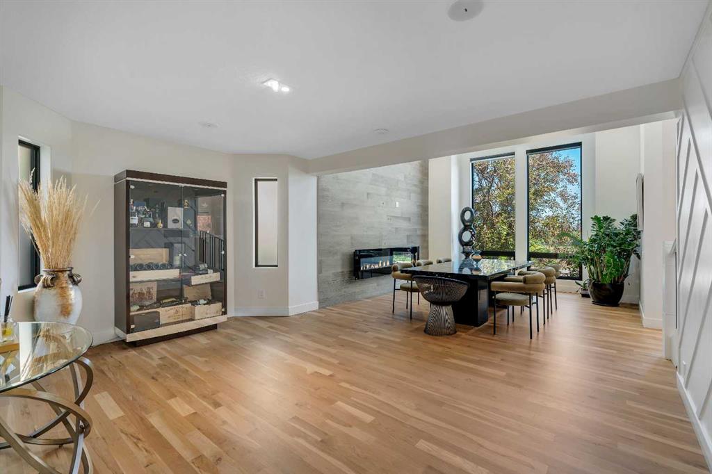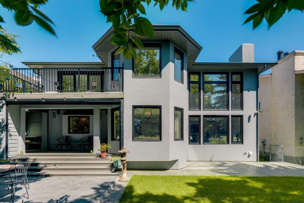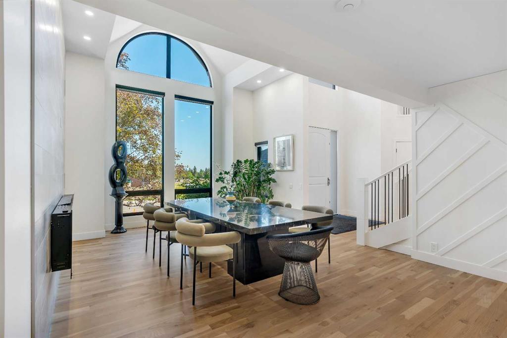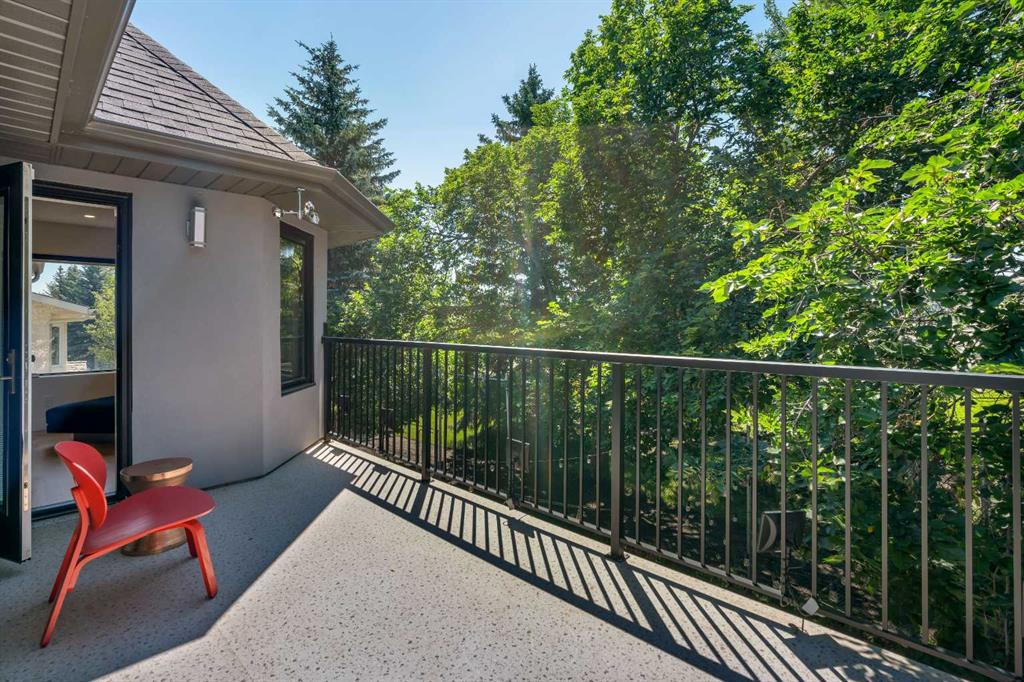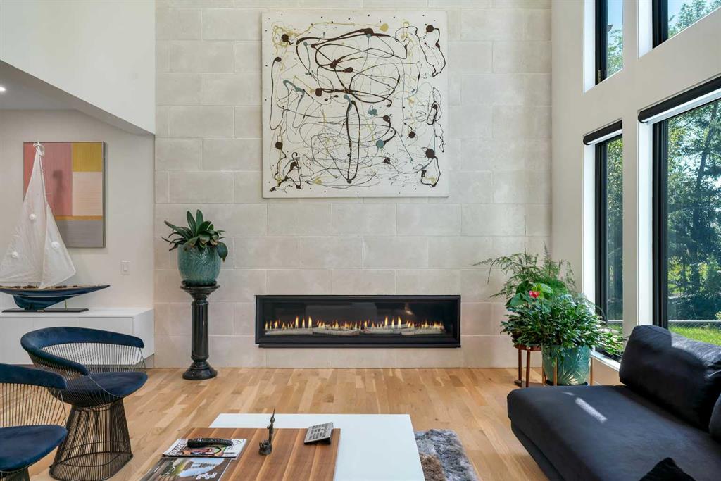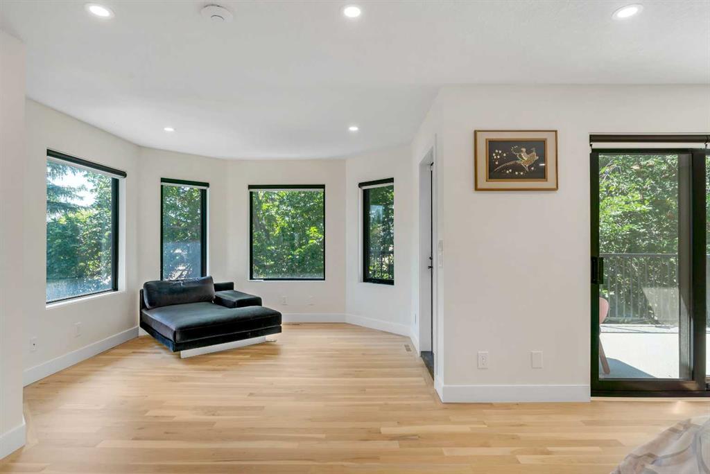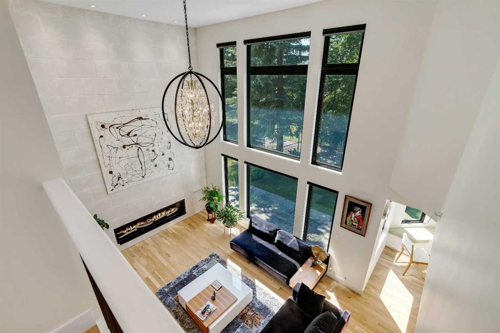 This showstopping residence blends architectural sophistication with modern luxury, backing directly onto a serene green space with a sun-filled south-facing backyard. Spanning over 3,000 sq ft above grade plus a fully finished basement, this extensively renovated custom home delivers an unforgettable living experience tailored for both refined entertaining and comfortable family living. The main level is defined by designer finishes, white oak hardwood, and expansive black-trimmed triple-pane windows that flood the space with natural light and frame peaceful views of the treed landscape beyond. The soaring open to above living room is anchored by a dramatic feature wall with a sleek fireplace, while the adjacent front-facing family room complete with its own fireplace and soaring ceiling offers versatility as a formal dining space or lounge. At the heart of the home, the gourmet kitchen is a true chef’s haven, showcasing a quartz waterfall island, full-slab backsplash, designer cabinetry, custom hood fan, and premium integrated appliances including a 6-burner gas cooktop, Thermador fridge, Miele dishwasher, built-in oven, steam cooker, and warming drawer. A sunny breakfast nook with built-in seating opens to the covered deck, ideal for al fresco dining while overlooking the yard and park beyond. A stylish powder room and a spacious mudroom with built-in laundry and a convenient dog wash complete the main level. Ascend the elegant curved staircase to discover a swoon-worthy primary retreat that impresses with its grand proportions, serene sitting area, and private balcony overlooking the treetops. The spa-inspired ensuite features dual sinks, heated floors, and an oversized steam shower, while the large walk-in closet completes the experience. Three additional bedrooms are thoughtfully positioned on the opposite side of this level, alongside a stylish 5-piece bathroom with dual sinks to keep busy mornings stress-free. The basement is an entertainer’s dream, complete with a full wet bar with beverage fridge, a mood-lit rec room perfect for movie nights and social gatherings, two additional bedrooms, a 3-piece bathroom, and a rejuvenating sauna. Outside, the south-facing backyard is a private sanctuary with two patio areas, grassy play space, and a unique enclosed shed with skylight perfect for gardening or creative use. Extensive upgrades include hardwired motorized blinds, custom millwork, updated plumbing and electrical, new roof, exterior foam insulation and stucco, driveway extension, EV charger, heated garage with epoxy floors, water filtration system, motorized deck screens, Gemstone lighting, and more. Located just steps from Fish Creek Park, community ponds, and walking trails, this extraordinary home is an unparalleled blend of thoughtful design, luxurious comfort, and timeless appeal.