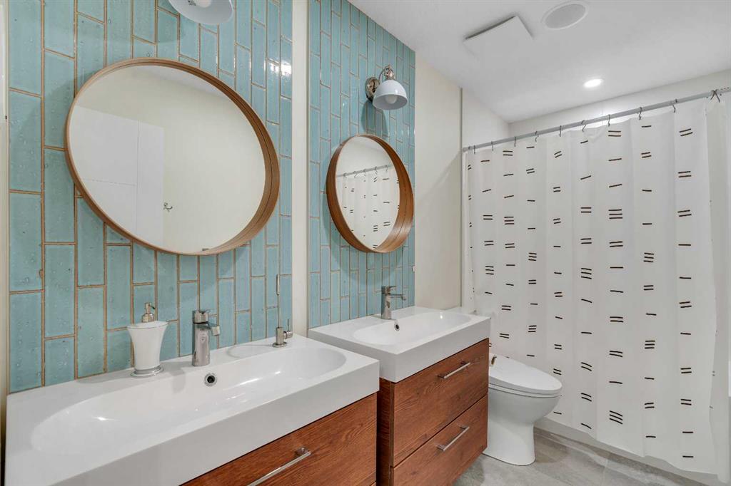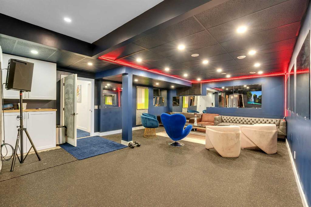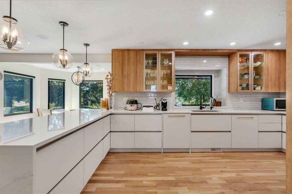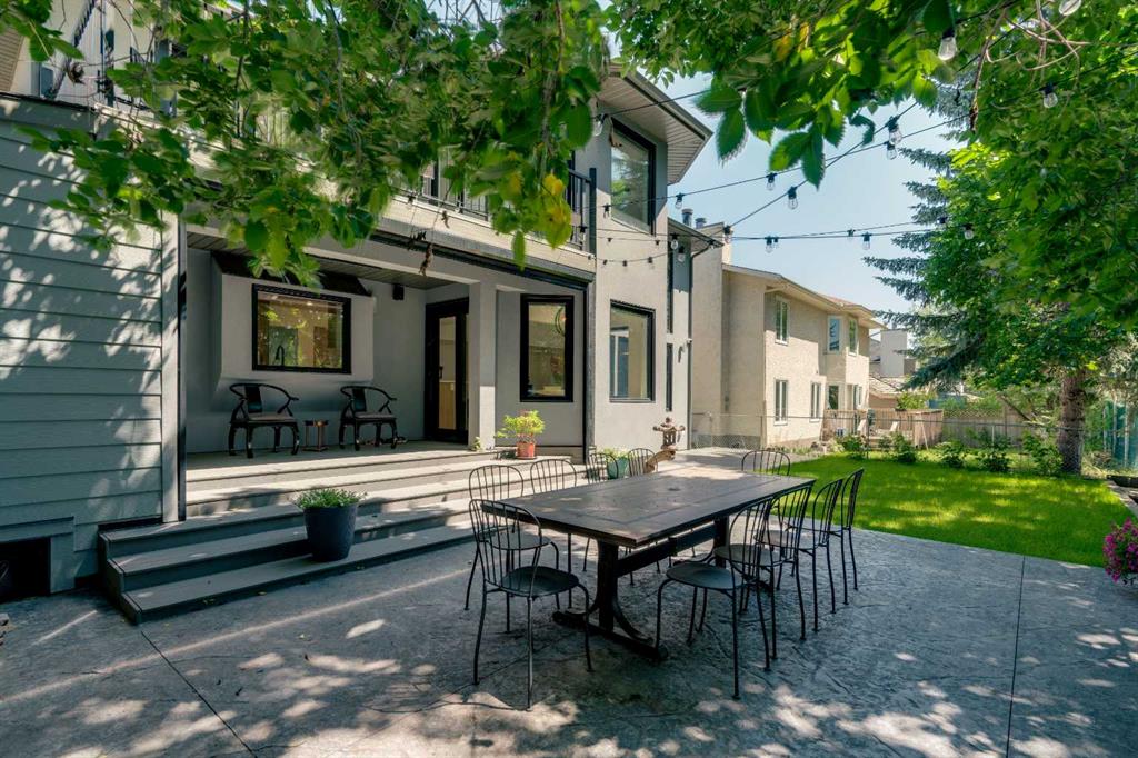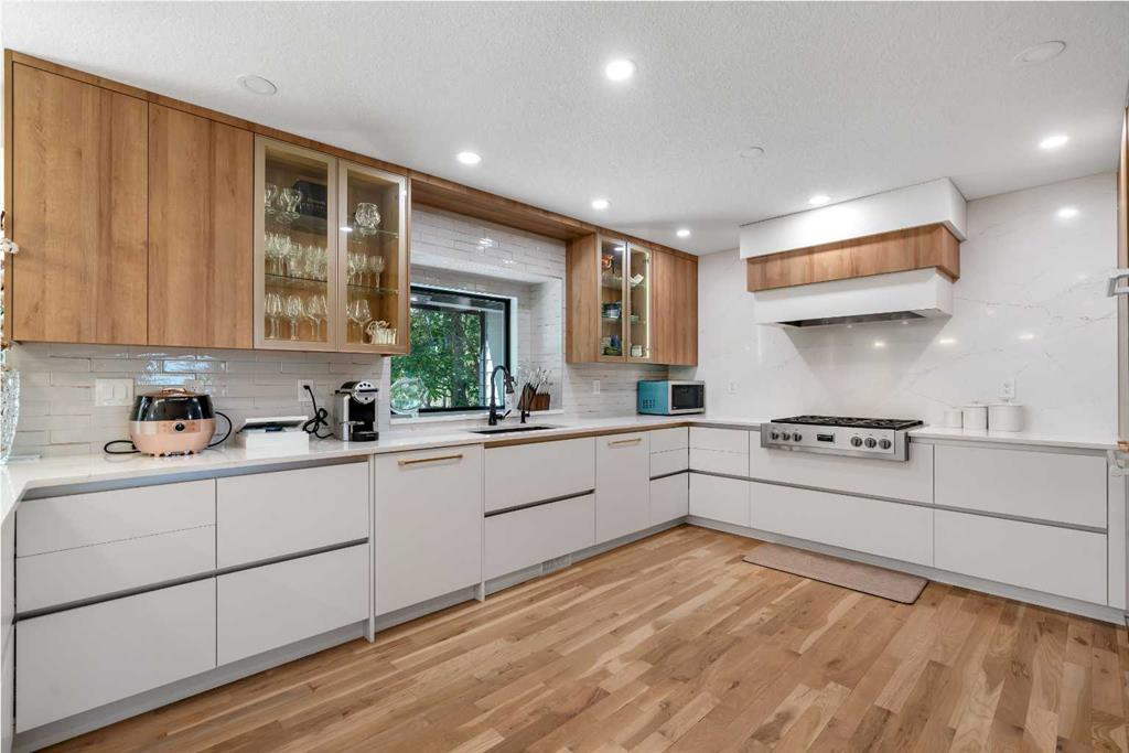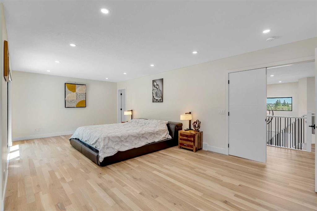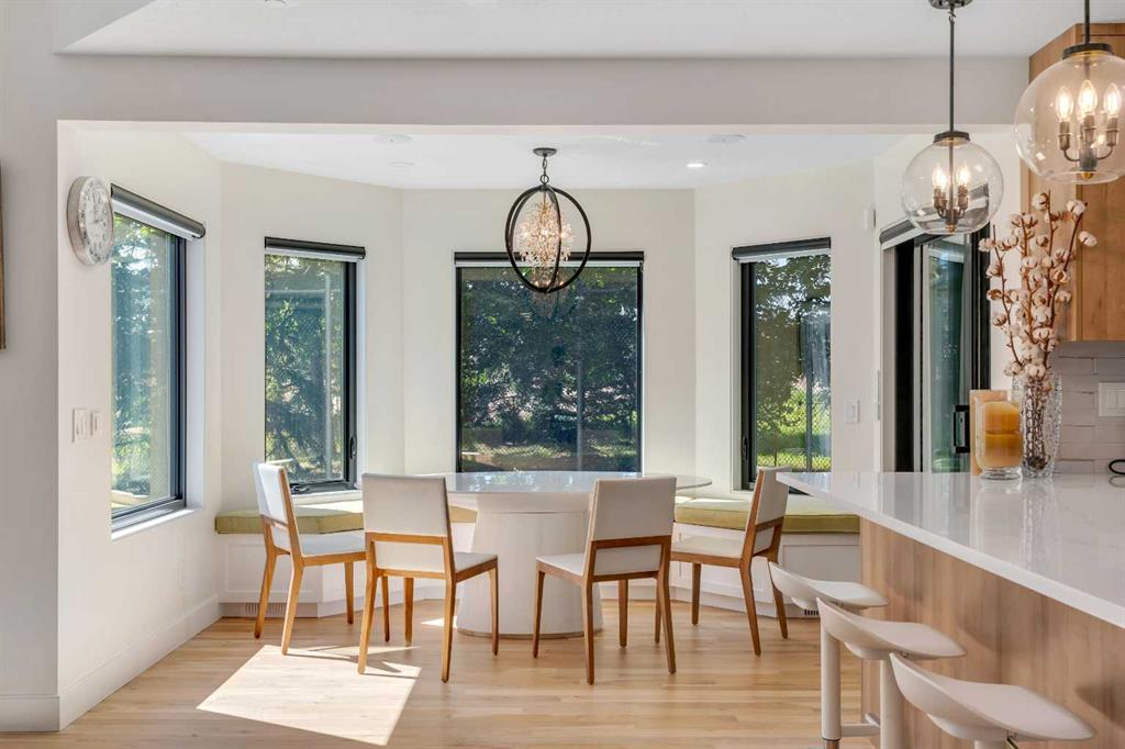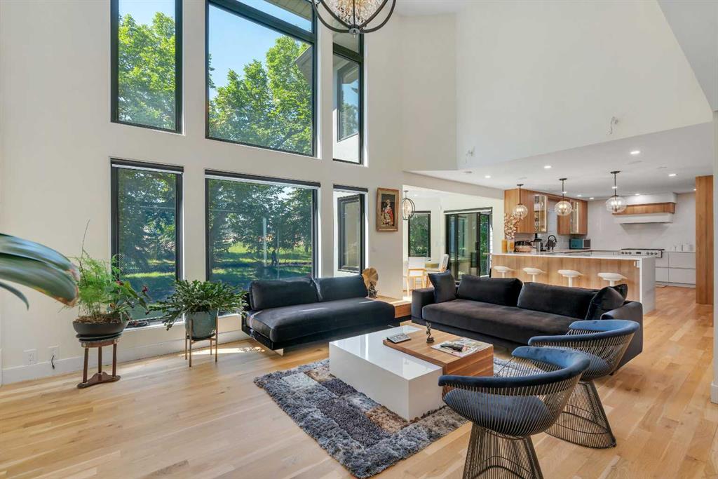 This showstopping residence blends architectural sophistication with modern luxury, backing directly onto a serene green space with a sun-filled south-facing backyard. Spanning over 3,000 sq ft above grade plus a fully finished basement, this extensively renovated custom home delivers an unforgettable living experience tailored for both refined entertaining and comfortable family living. The main level is defined by designer finishes, white oak hardwood, and expansive black-trimmed triple-pane windows that flood the space with natural light and frame peaceful views of the treed landscape beyond. The soaring open to above living room is anchored by a dramatic feature wall with a sleek fireplace, while the adjacent front-facing family room complete with its own fireplace and soaring ceiling offers versatility as a formal dining space or lounge. At the heart of the home, the gourmet kitchen is a true chef’s haven, showcasing a quartz waterfall island, full-slab backsplash, designer cabinetry, custom hood fan, and premium integrated appliances including a 6-burner gas cooktop, Thermador fridge, Miele dishwasher, built-in oven, steam cooker, and warming drawer. A sunny breakfast nook with built-in seating opens to the covered deck, ideal for al fresco dining while overlooking the yard and park beyond. A stylish powder room and a spacious mudroom with built-in laundry and a convenient dog wash complete the main level. Ascend the elegant curved staircase to discover a swoon-worthy primary retreat that impresses with its grand proportions, serene sitting area, and private balcony overlooking the treetops. The spa-inspired ensuite features dual sinks, heated floors, and an oversized steam shower, while the large walk-in closet completes the experience. Three additional bedrooms are thoughtfully positioned on the opposite side of this level, alongside a stylish 5-piece bathroom with dual sinks to keep busy mornings stress-free. The basement is an entertainer’s dream, complete with a full wet bar with beverage fridge, a mood-lit rec room perfect for movie nights and social gatherings, two additional bedrooms, a 3-piece bathroom, and a rejuvenating sauna. Outside, the south-facing backyard is a private sanctuary with two patio areas, grassy play space, and a unique enclosed shed with skylight perfect for gardening or creative use. Extensive upgrades include hardwired motorized blinds, custom millwork, updated plumbing and electrical, new roof, exterior foam insulation and stucco, driveway extension, EV charger, heated garage with epoxy floors, water filtration system, motorized deck screens, Gemstone lighting, and more. Located just steps from Fish Creek Park, community ponds, and walking trails, this extraordinary home is an unparalleled blend of thoughtful design, luxurious comfort, and timeless appeal.